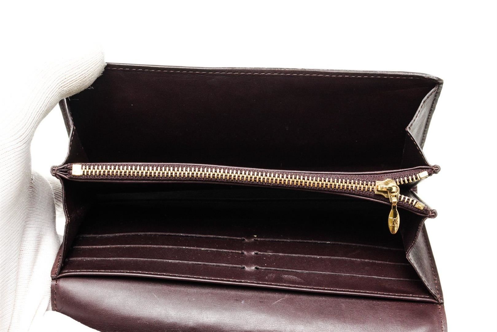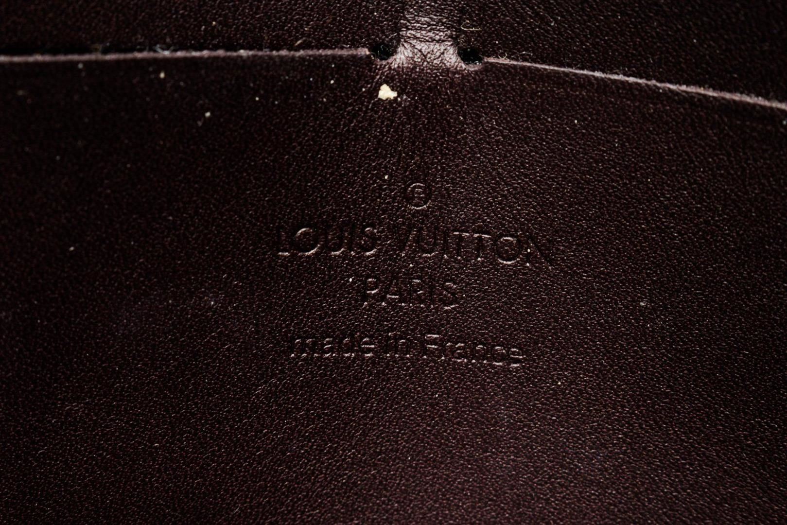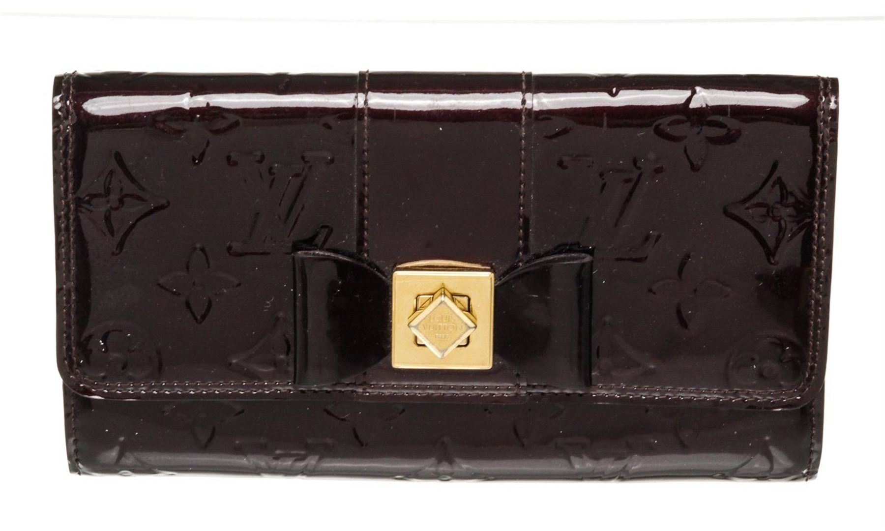 Louis Vuitton Brown Vernis Leather Wallet with vernis leather, gold-tone hardware, trim tan vachetta leather, interior three compartments pockets and zipper closure.