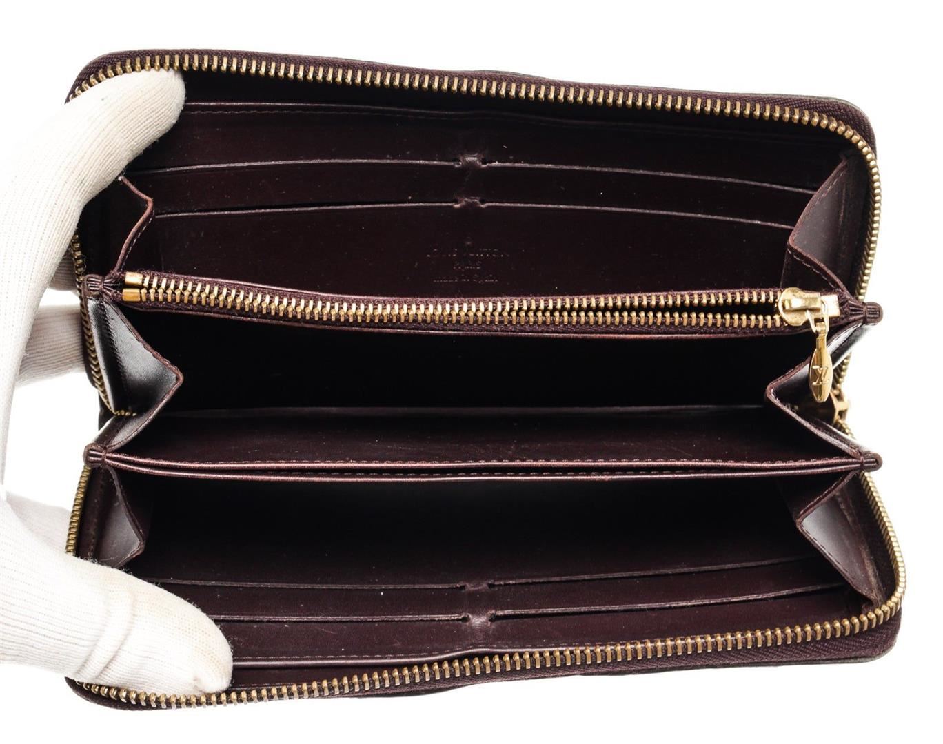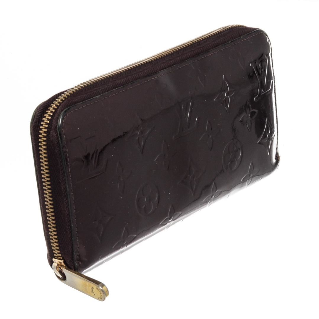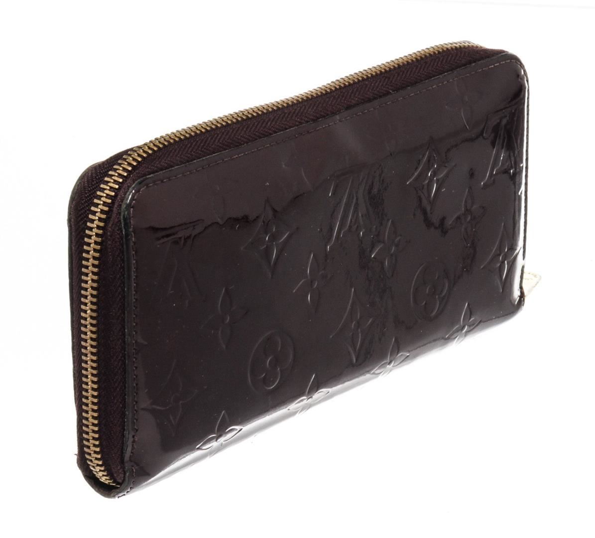 Louis Vuitton Brown Vernis Leather Zippy Wallet with vernis leather, gold-tone hardware, interior three compartments pockets and zipper closure.