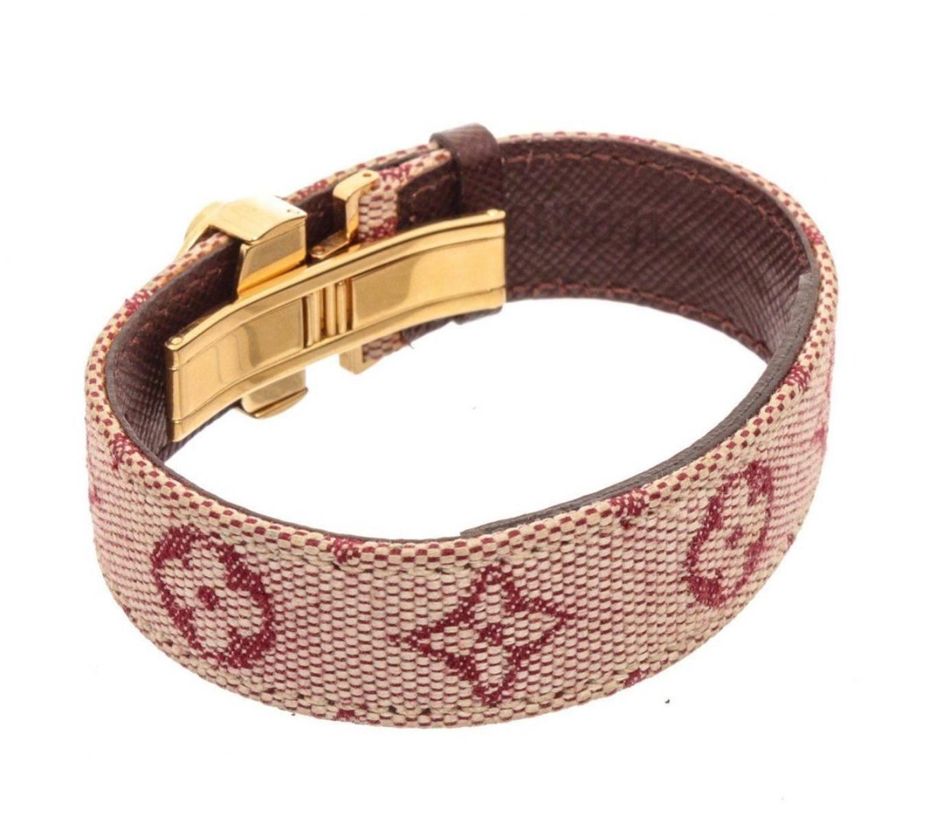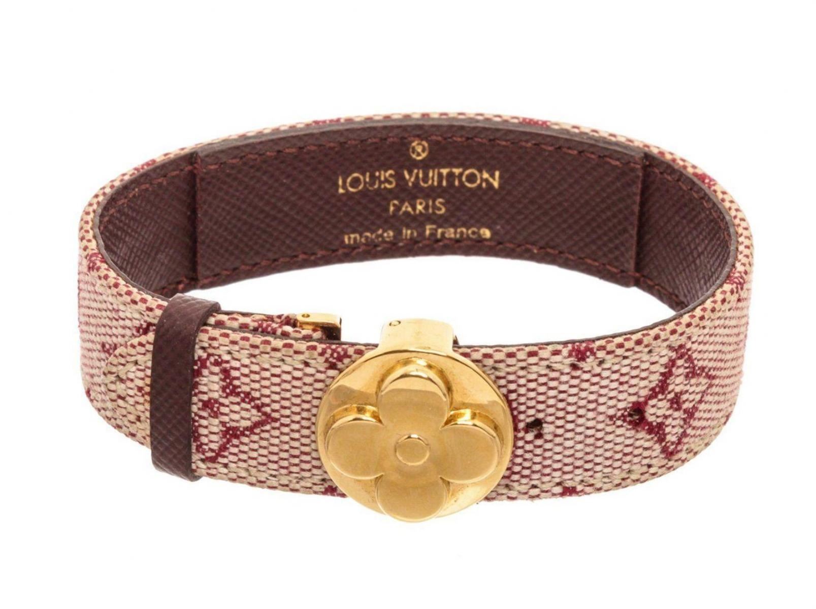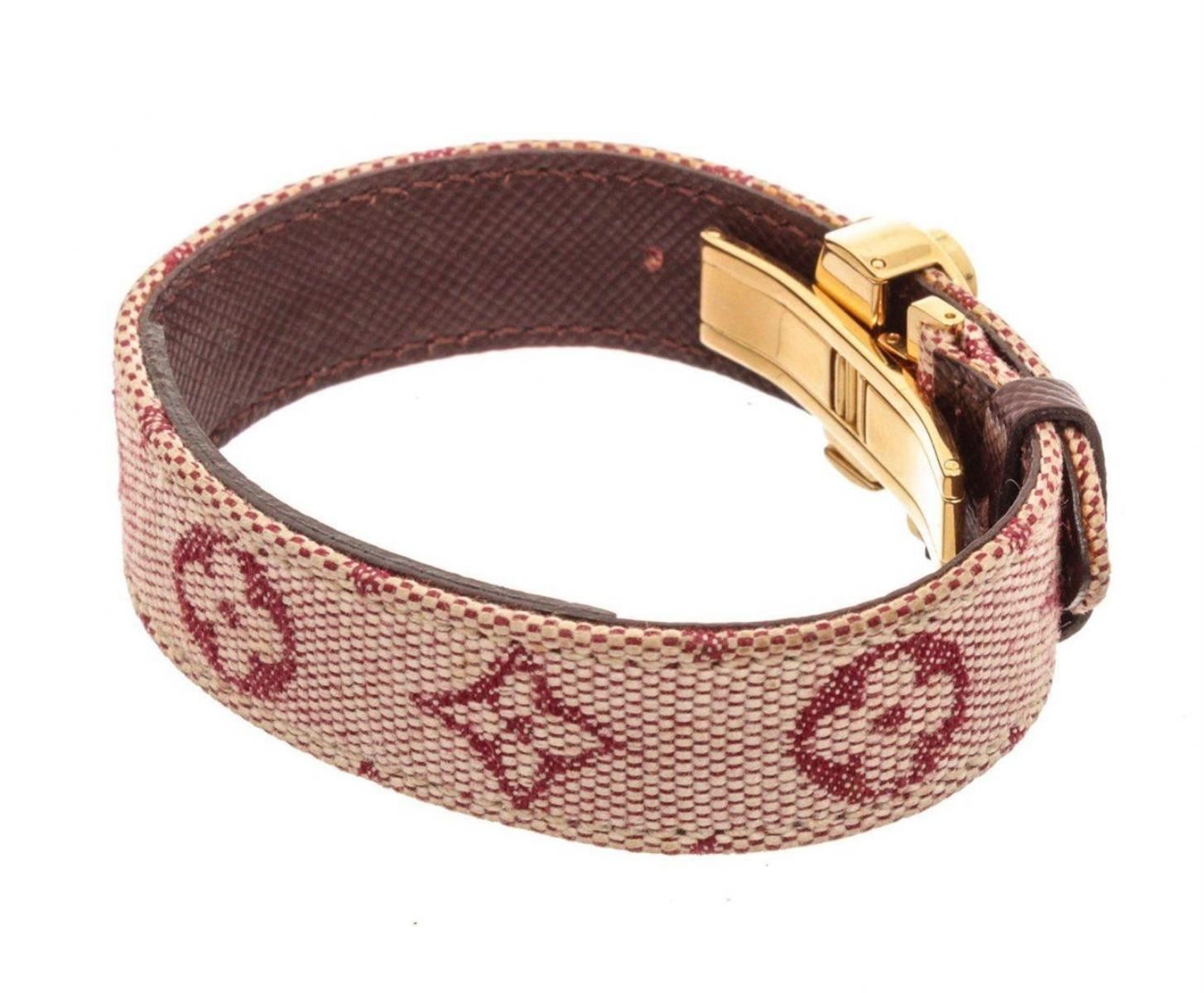 Louis Vuitton Burgundy Mini Lin Millennium Wish Bracelet with material monogram canvas, gold-tone hardware, trim tan vachetta leather and push lock closure. MEASUREMENTS: Length 1 in / 3 cm Width 0.25 in / 1 cm Height 0.39 in / 1 cm Condition: Pre-Owned Good overall, please see photographs for detail.