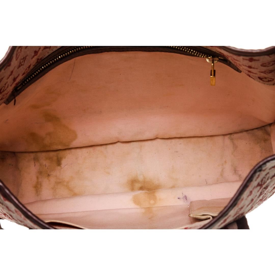 Mini monogram burgundy canvas Besace Mary Kate bag with brass hardware, leather accents, and single flat shoulder strap. Inner side zip pocket and pink canvas lining.