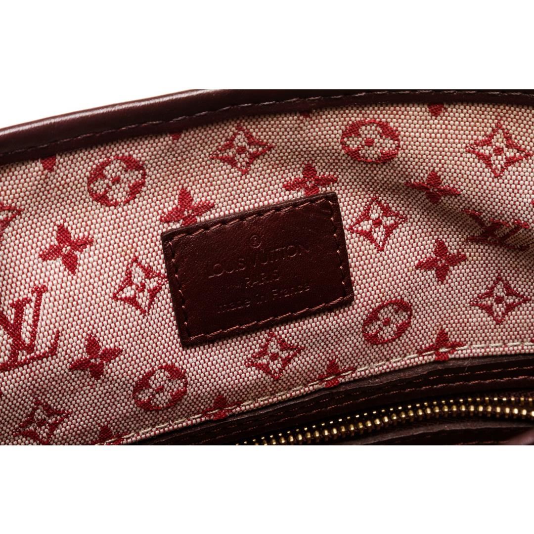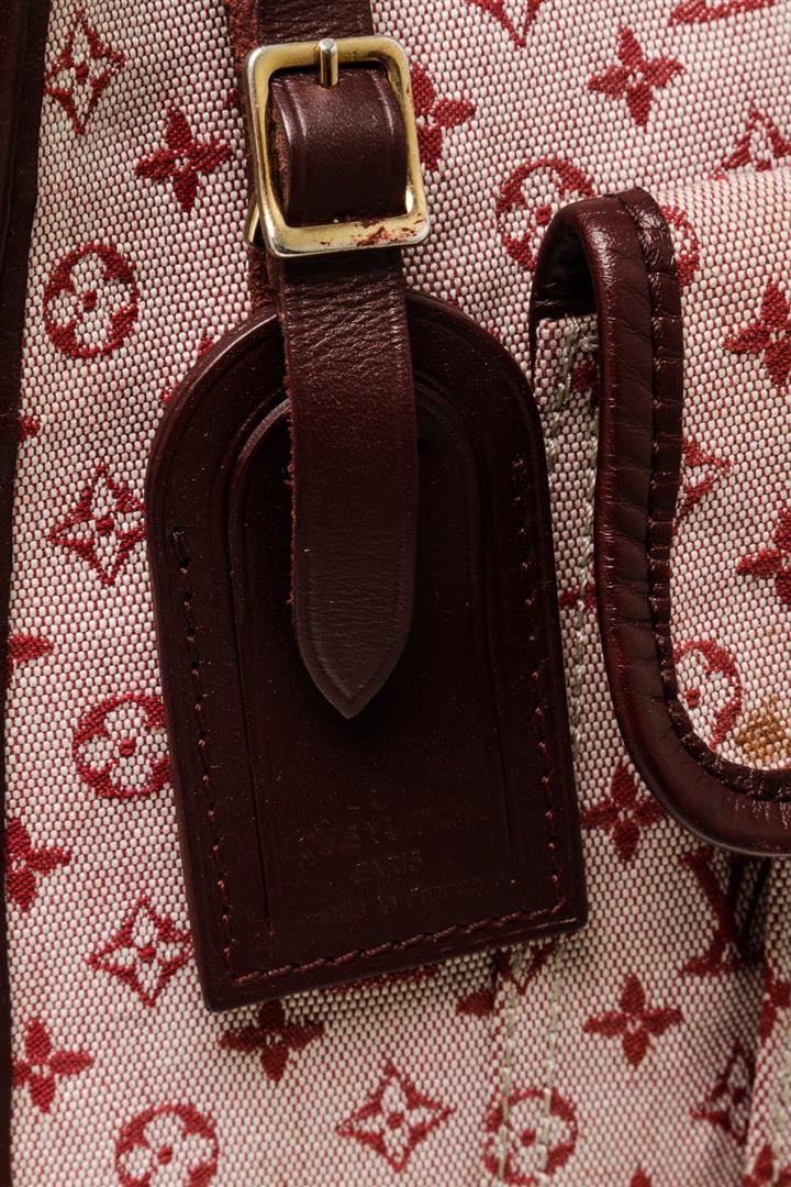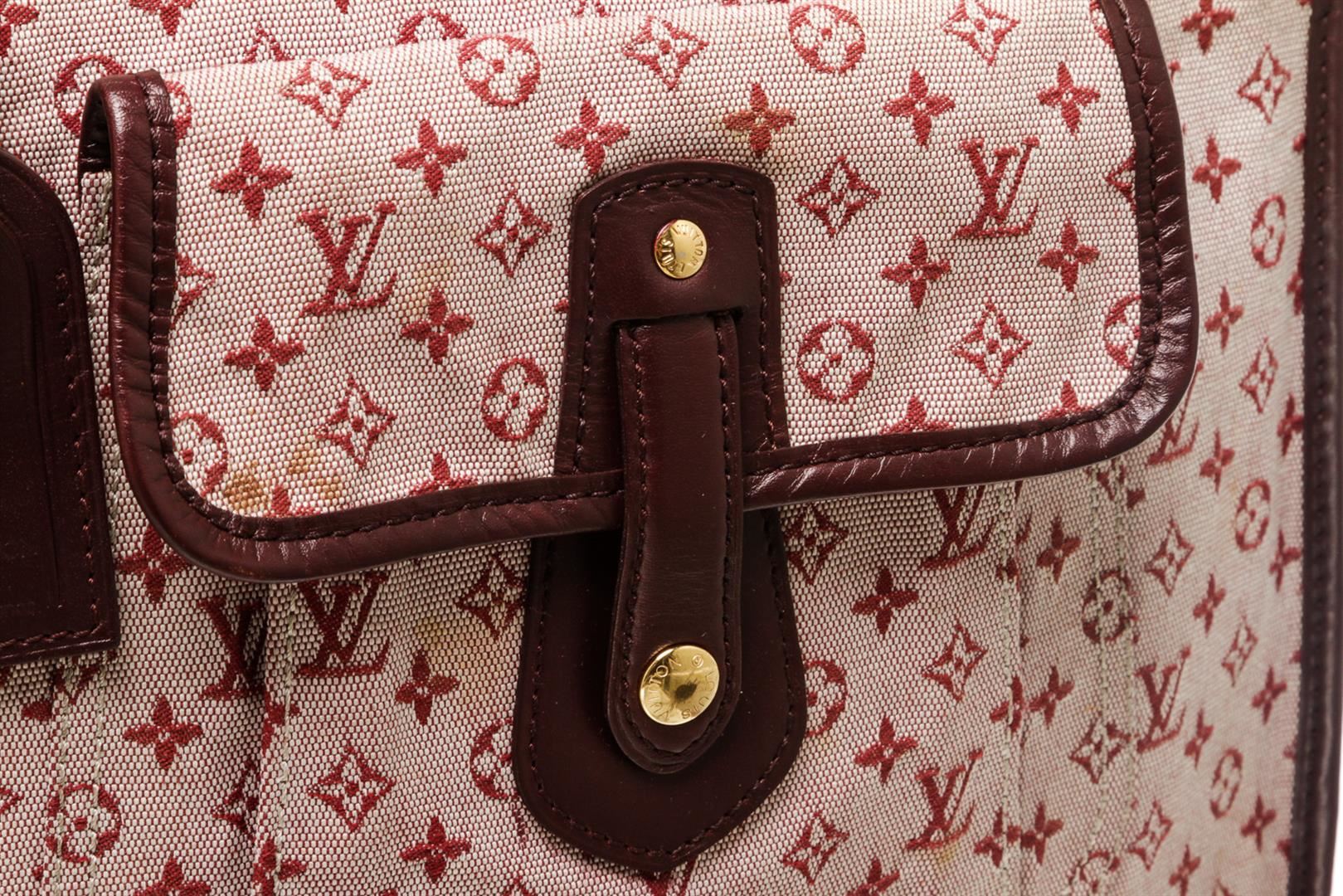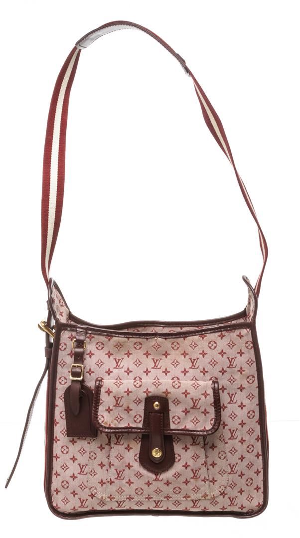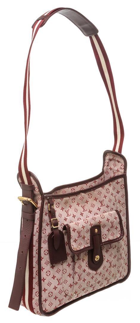 Mini monogram burgundy canvas Besace Mary Kate bag with brass hardware,  leather accents, and single flat shoulder strap. Inner side zip pocket and pink canvas lining.