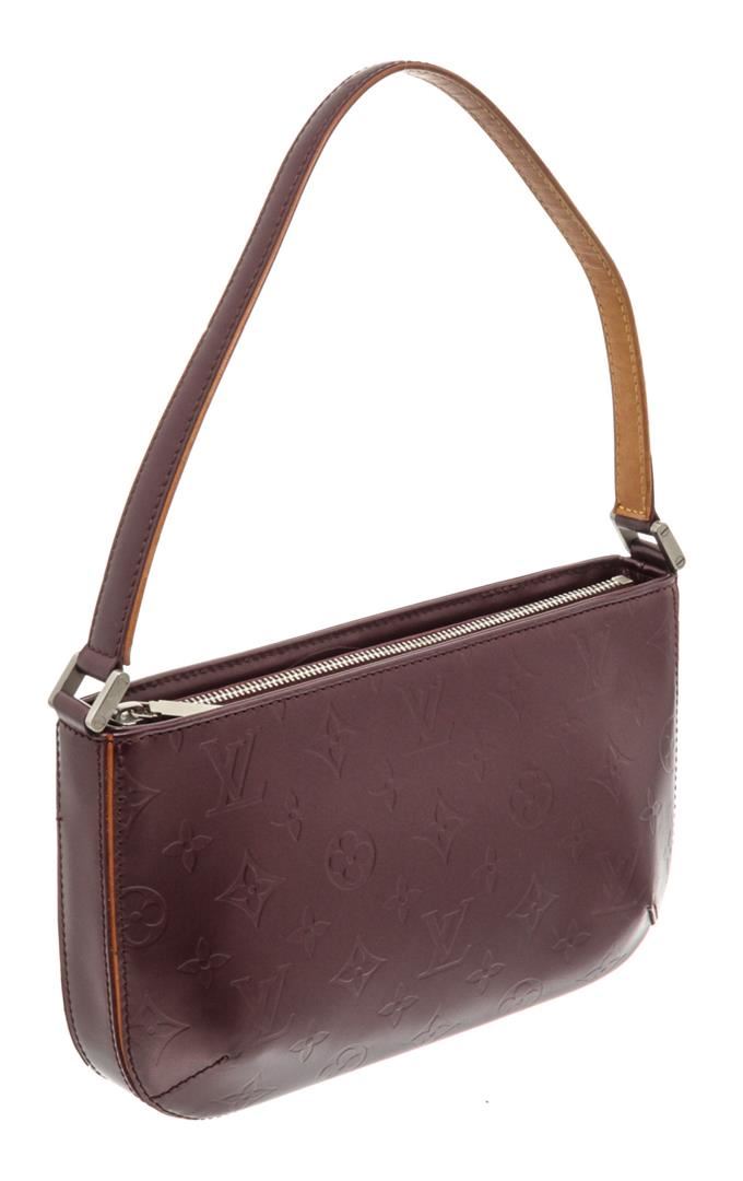 Burgundy Mat leather Louis Vuitton Fowler Pochette with silver-tone hardware, single flat shoulder strap, tan Vachetta leather trim, charcoal woven lining and zip closure at top. Authentic.