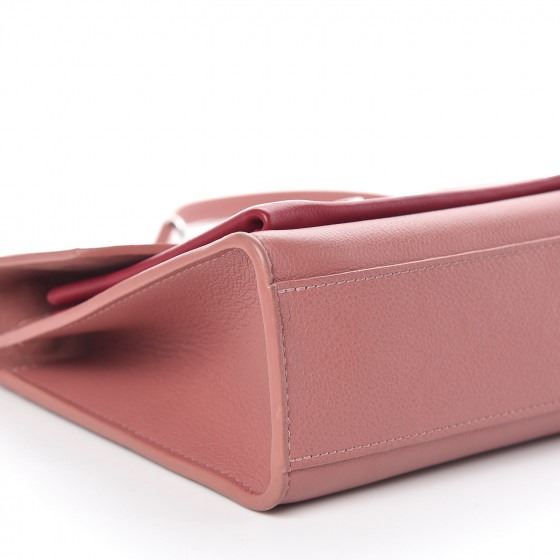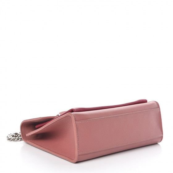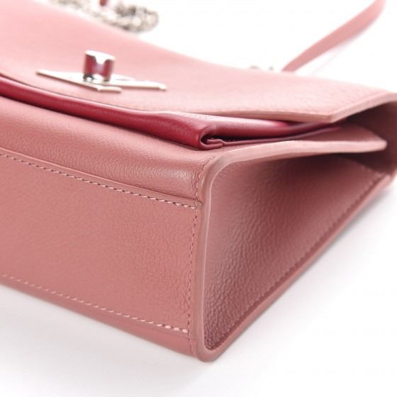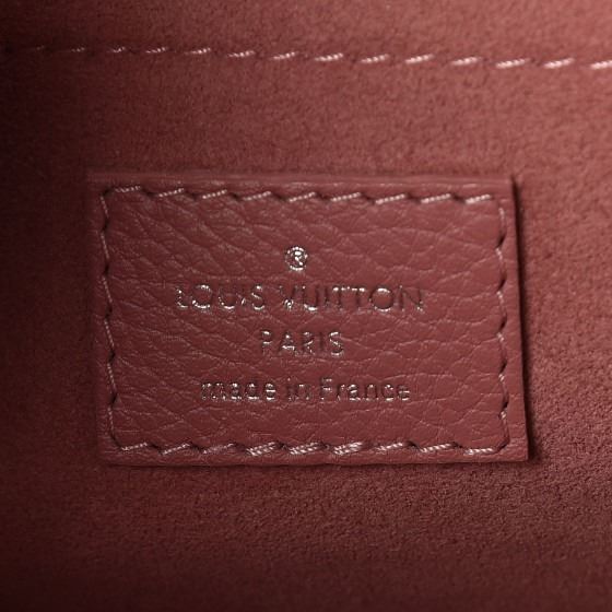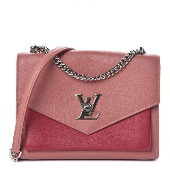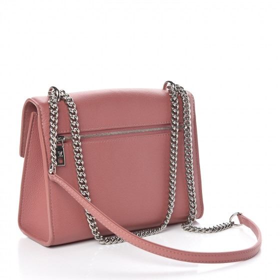Handbag is crafted of soft calfskin leather in pink and fuchsia. The bag features a polished silver chain link shoulder strap with leather shoulder pad and a facing flap pocket with a silver Louis Vuitton turn lock. This opens to a partitioned fabric interior with a central pocket and patch pockets.