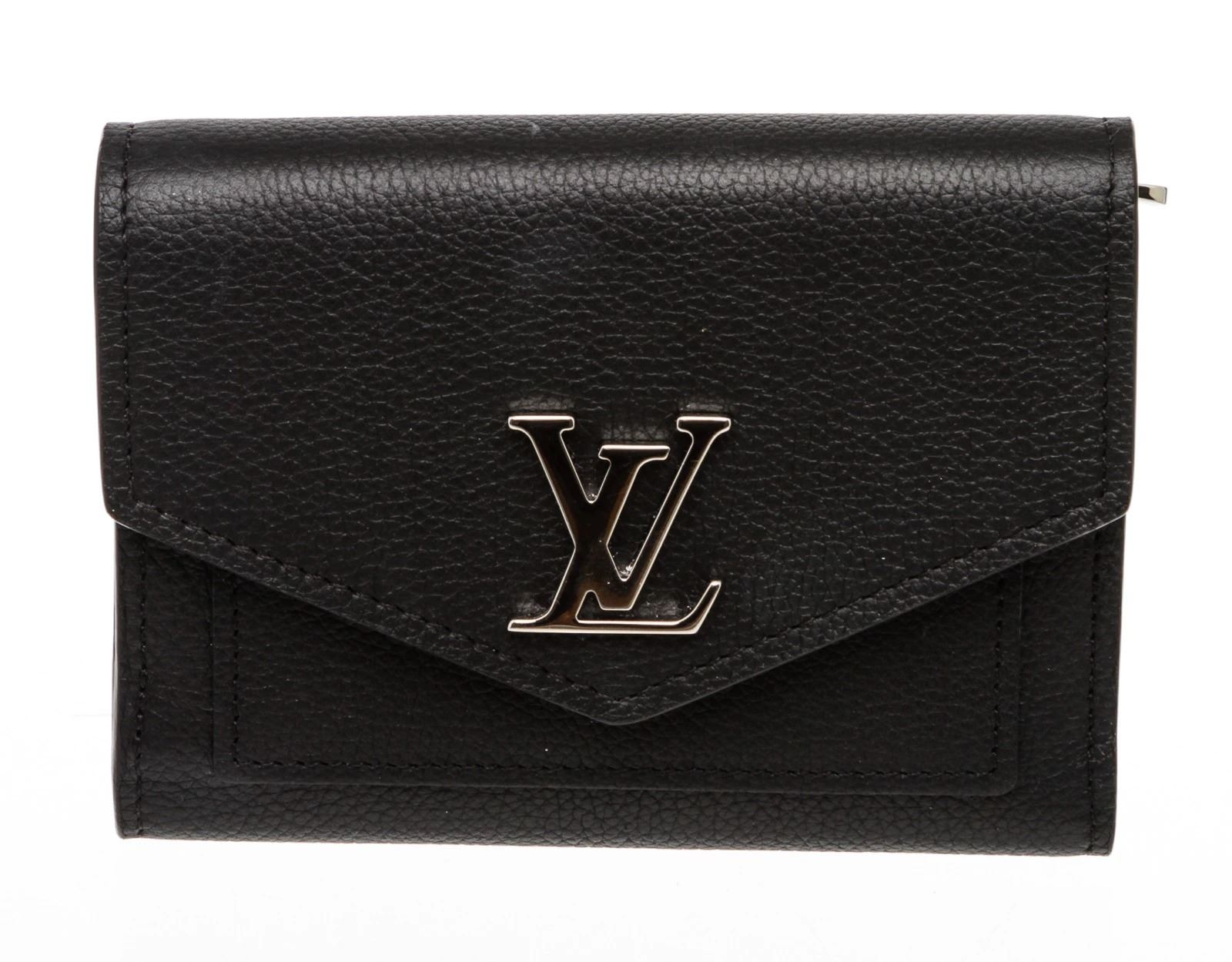 The Mylockme compact wallet in supple calf leather references the key signatures of the Lockme handbag: the envelope-style flap, the front pocket and the LV Initials accessory. Small enough to fit into any bag, this space-efficient design offers an array of pockets and credit card slots, including a zipped pocket for coins.