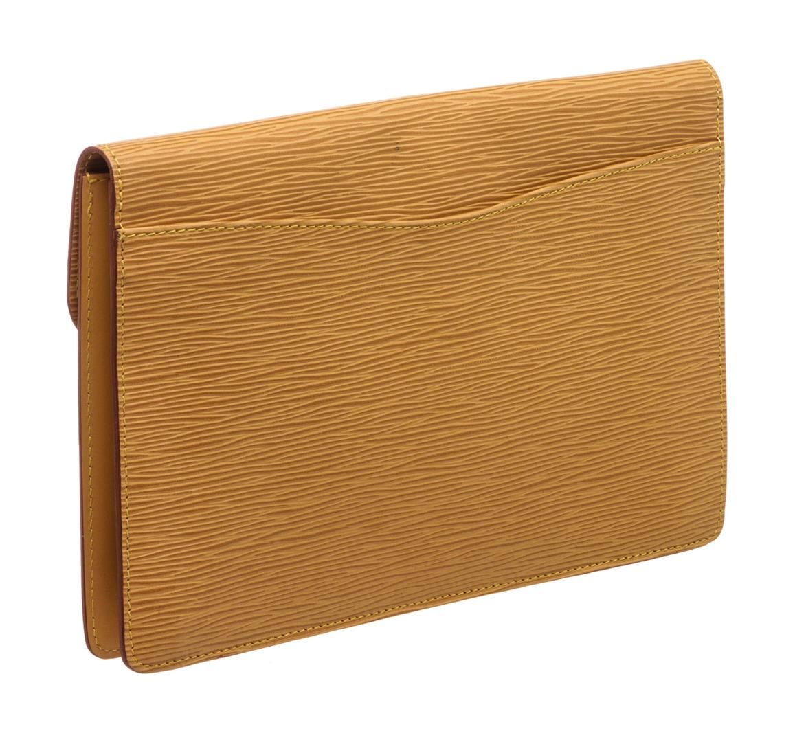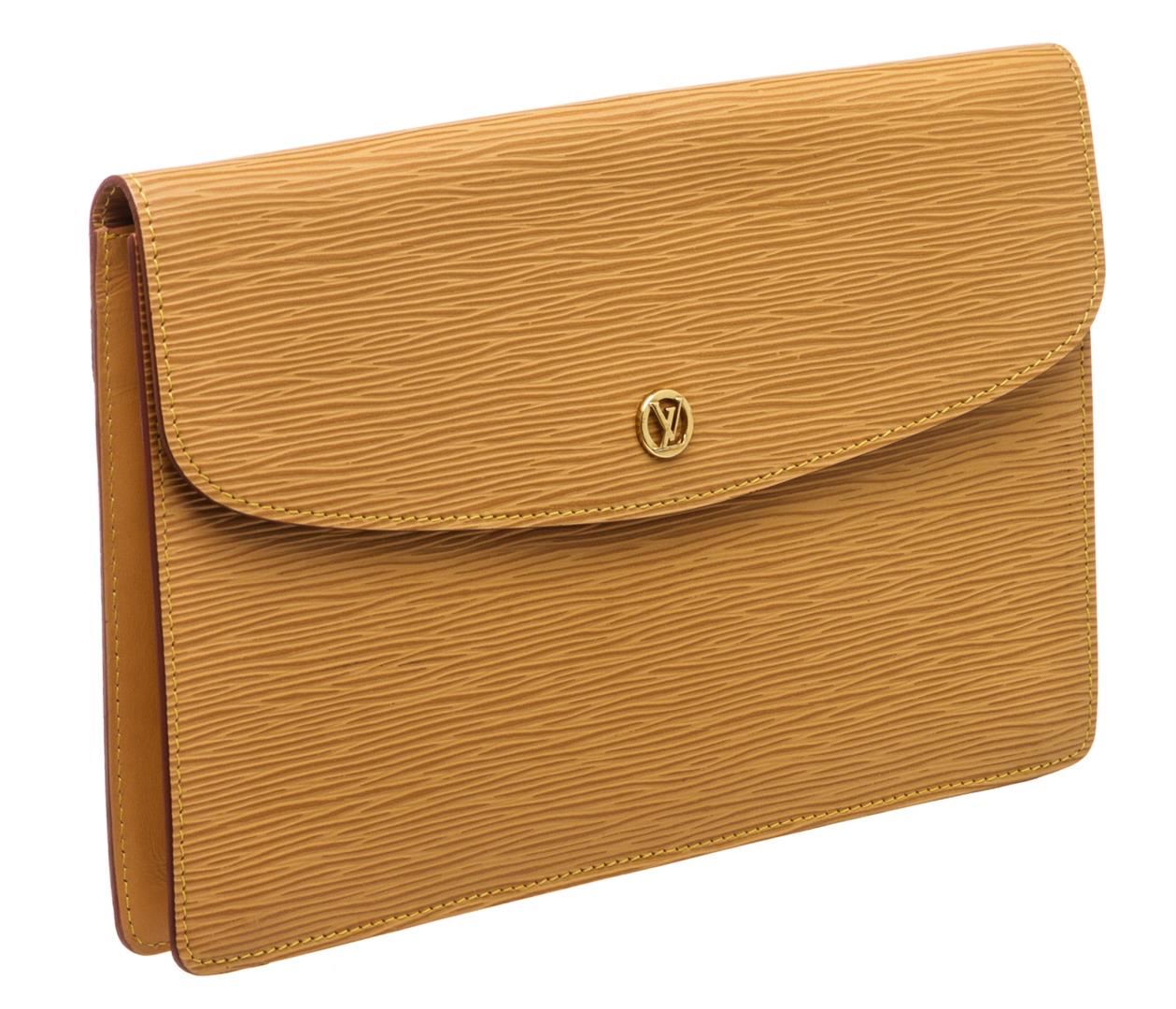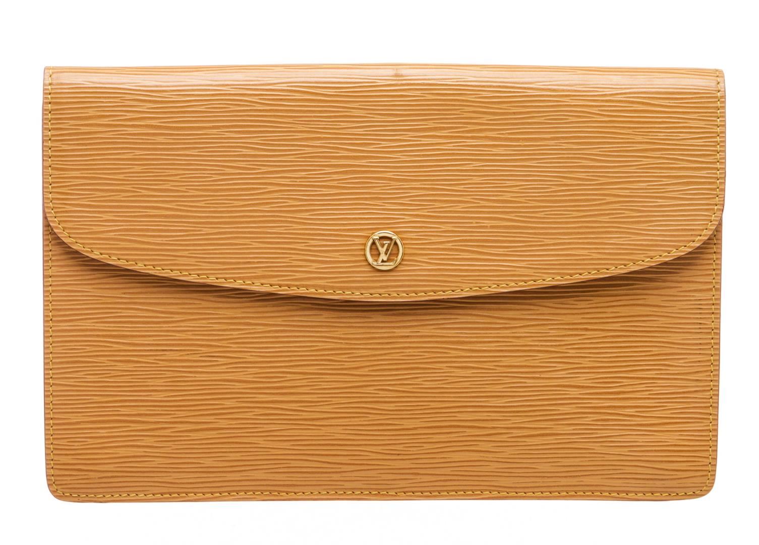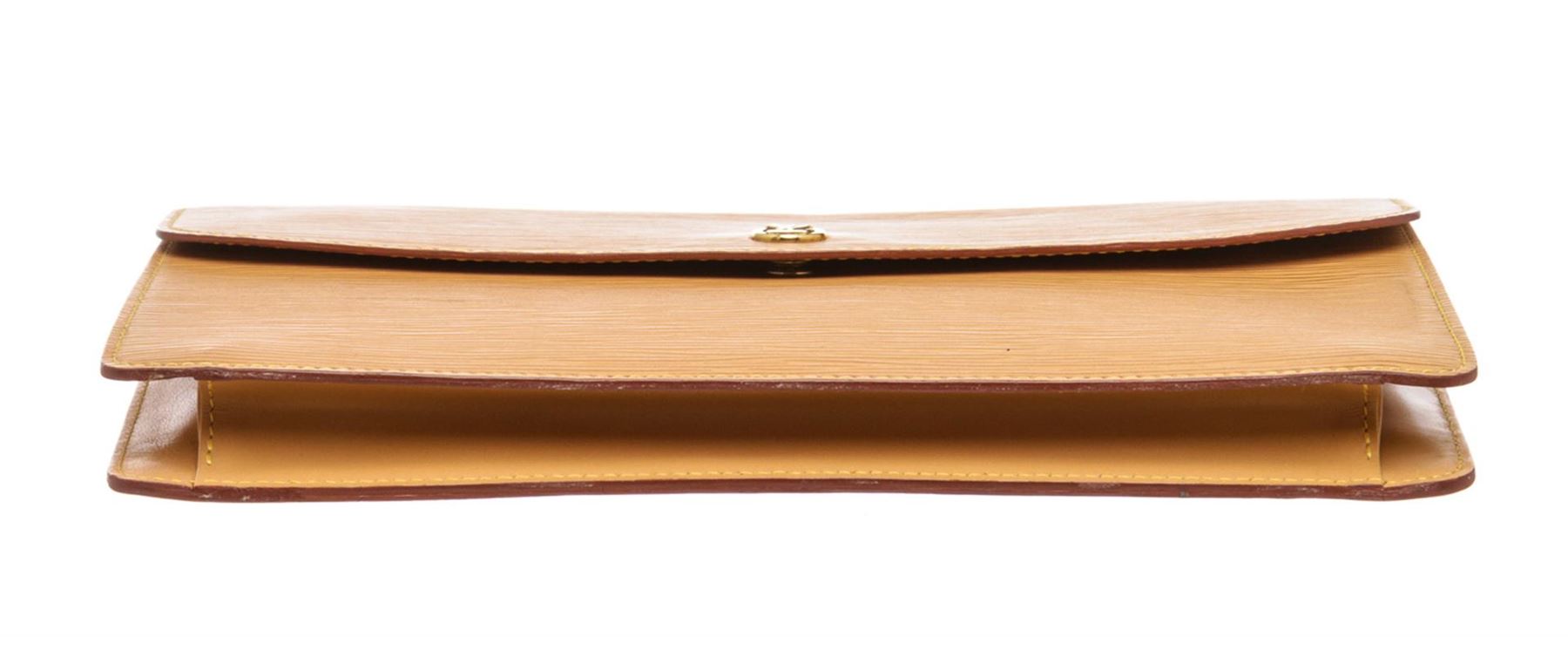 Camel Epi leather Louis Vuitton Montaigne Clutch with brass hardware, logo adornment at front flap, single slit pocket at back, black leather lining, single interior zip pocket and snap closure at front. Authentic.