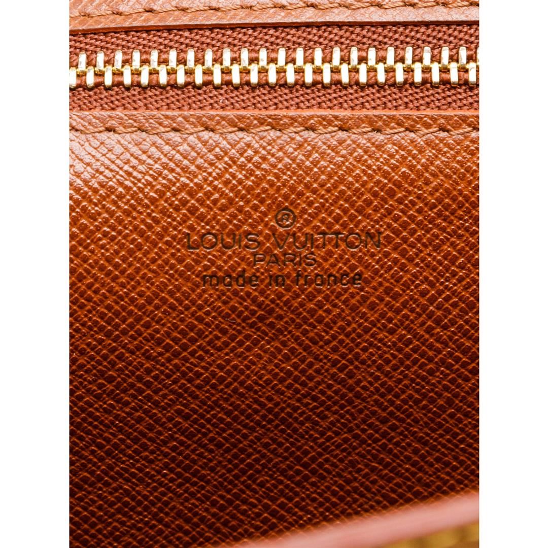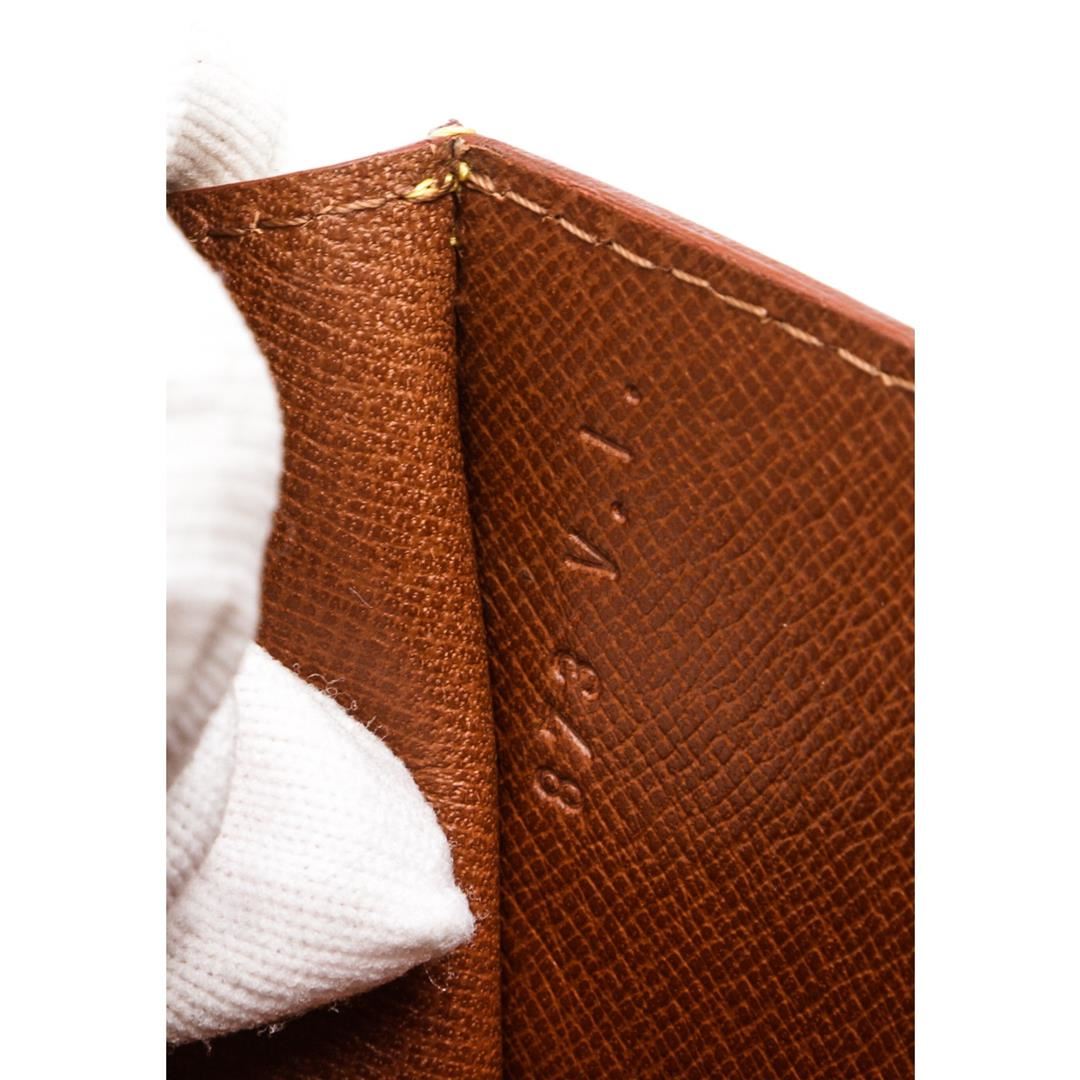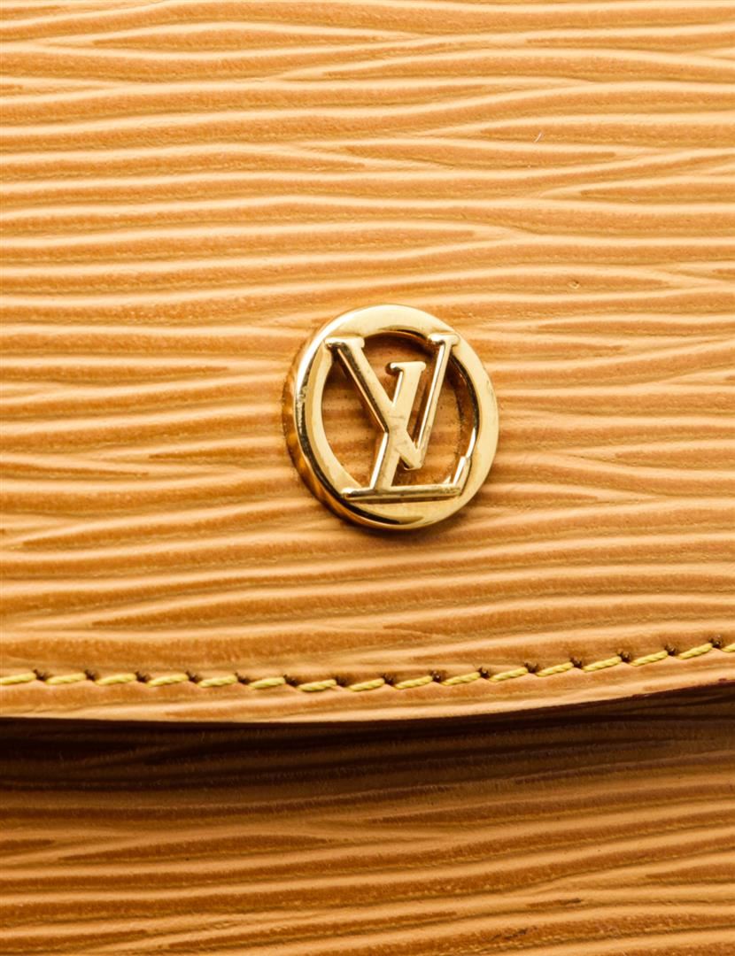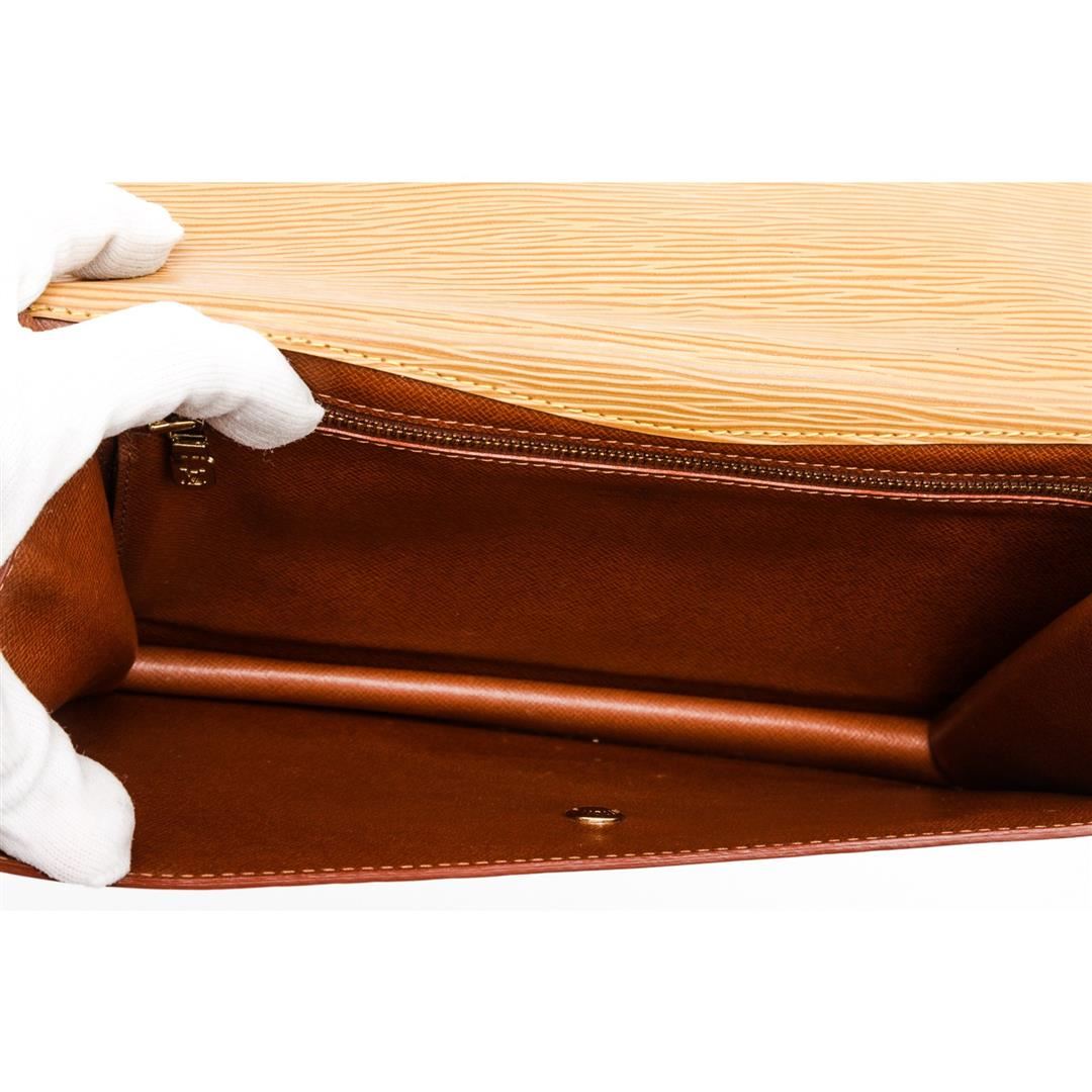 Camel Epi leather Louis Vuitton Montaigne Clutch with brass hardware, logo adornment at front flap, single slit pocket at back, black leather lining, single interior zip pocket and snap closure at front. Authentic.