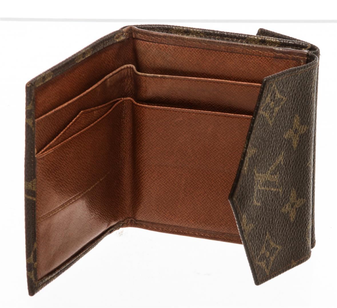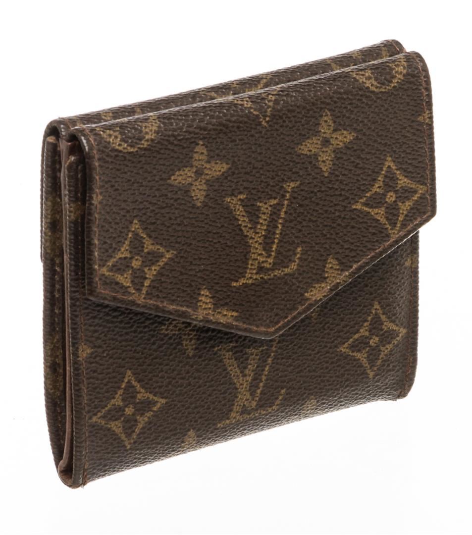 One Louis Vuitton Canvas Leather Elise Wallet. Brown and tan monogram coated canvas Louis Vuitton Elise compact wallet with brass hardware, cinnamon Taiga leather lining, dual compartments at exterior featuring snap closure, dual bill compartments at interior walls, single card slot and snap closure at exterior back.