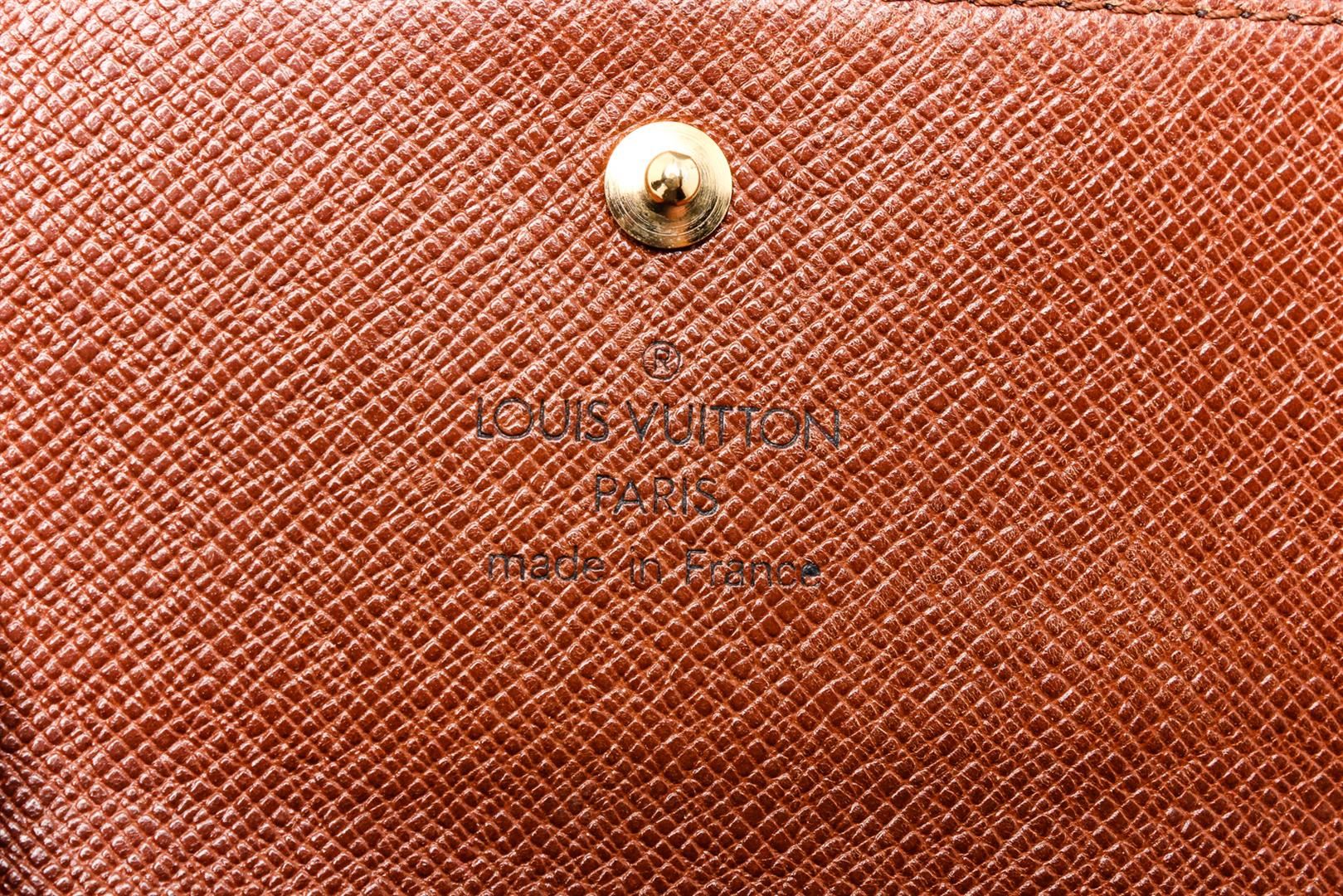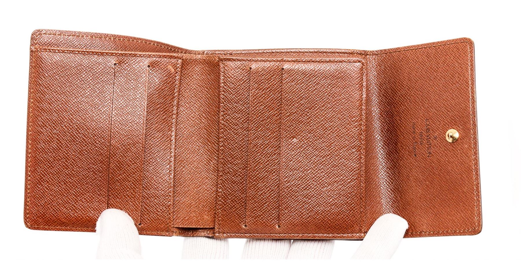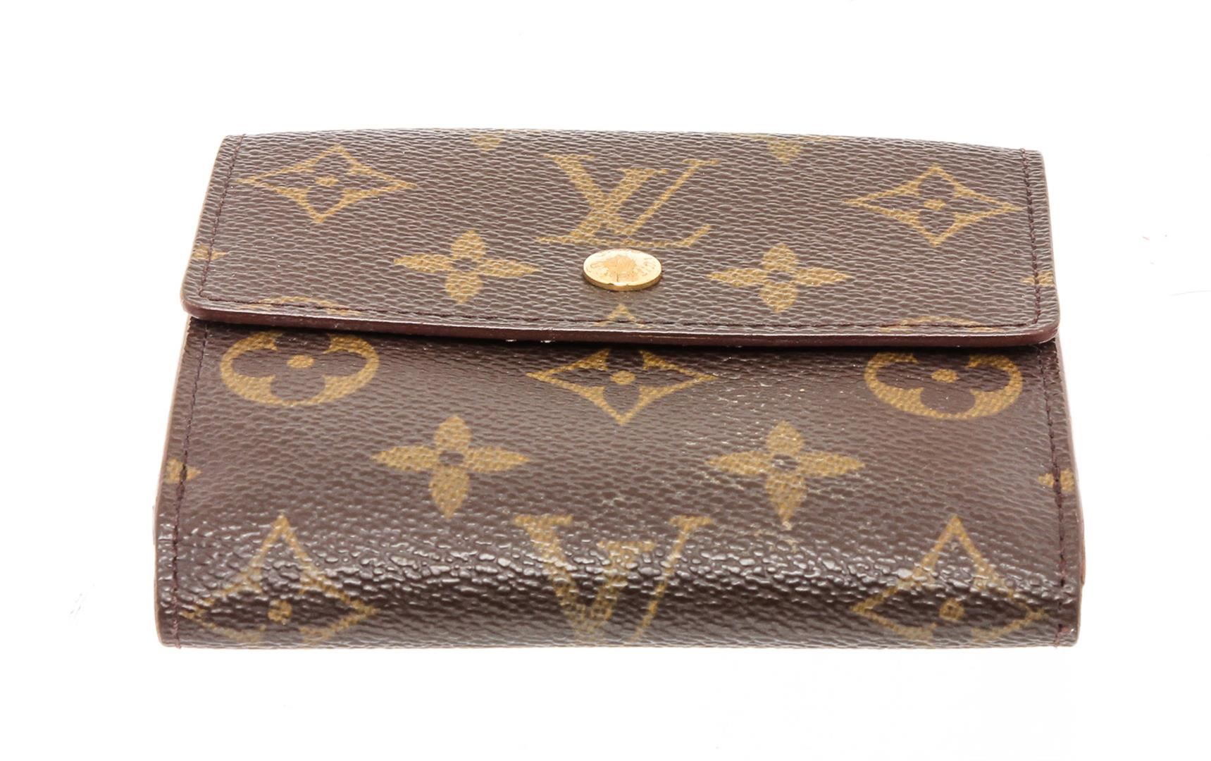 Brown and tan monogram coated canvas Louis Vuitton Elise compact wallet with brass hardware, cinnamon Taiga leather lining, dual compartments at exterior featuring snap closure, dual bill compartments at interior walls, single card slot and snap closure at exterior back.