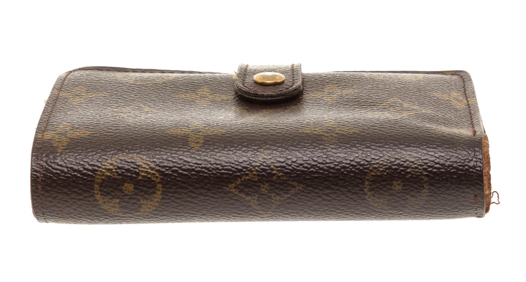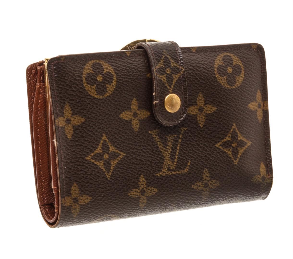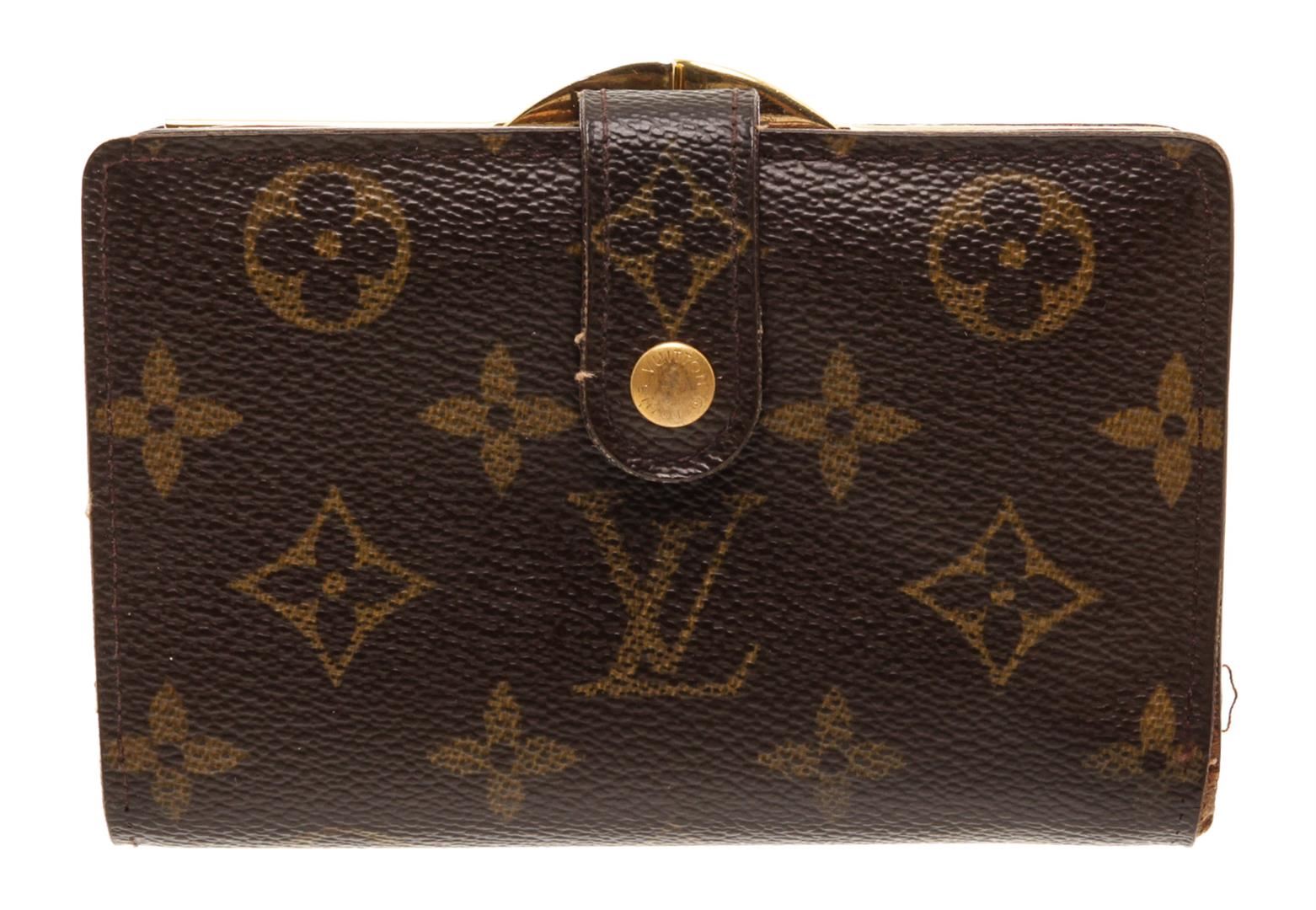 Brown and tan monogram coated canvas Louis Vuitton French Purse wallet with brass hardware, exterior compartment with kiss-lock closure, cinnamon Taiga leather lining, six card slots, single bill compartment and snap closure at front flap.