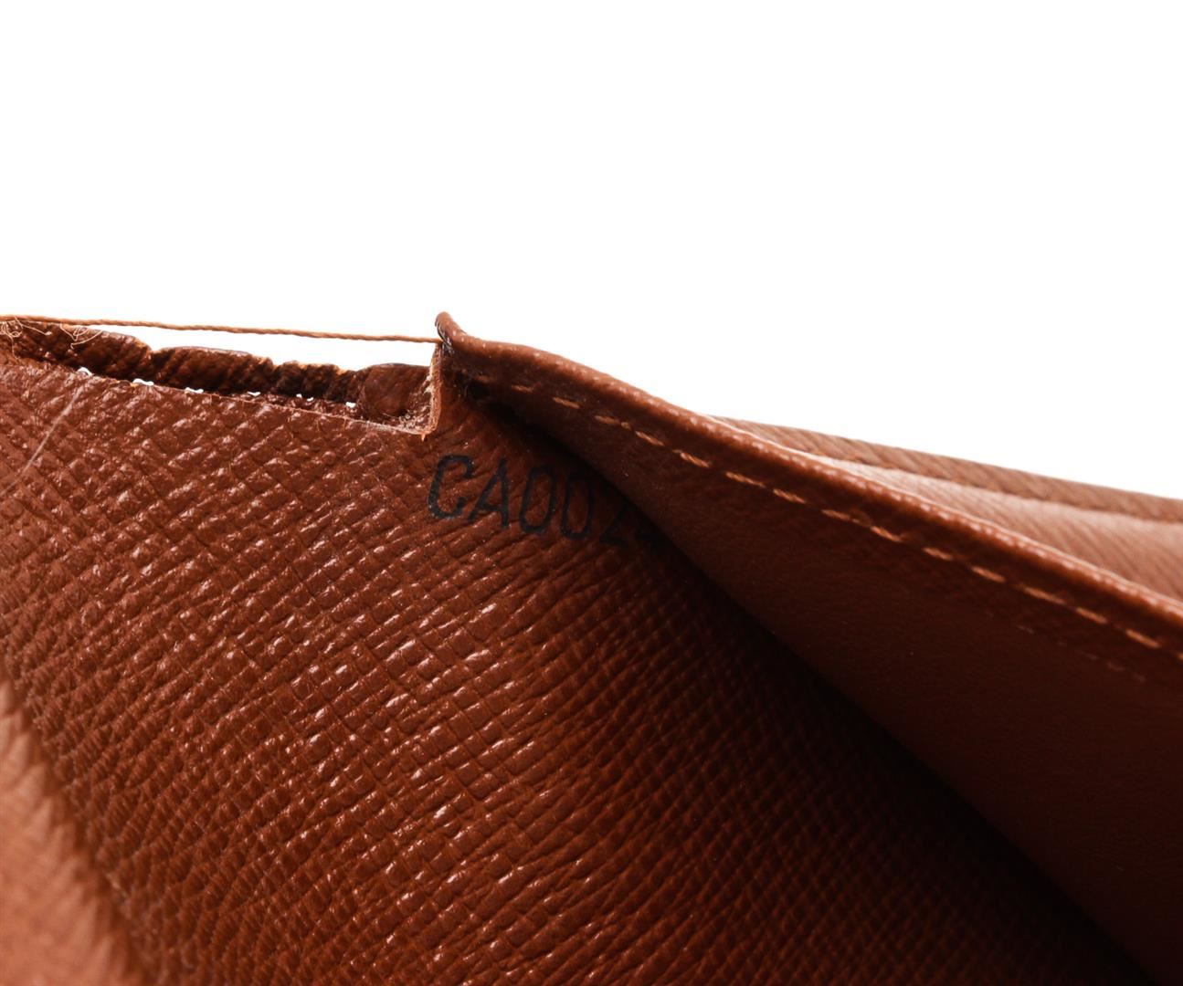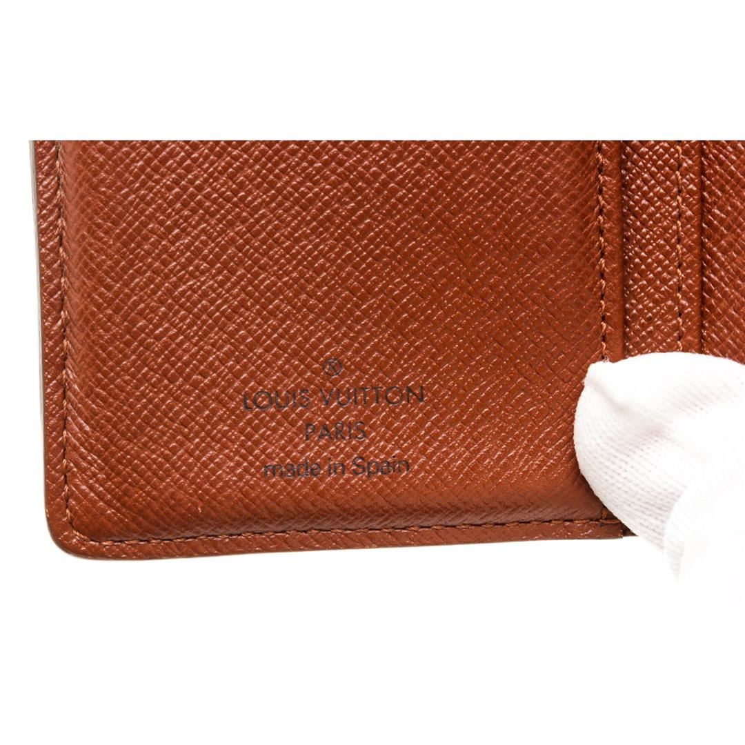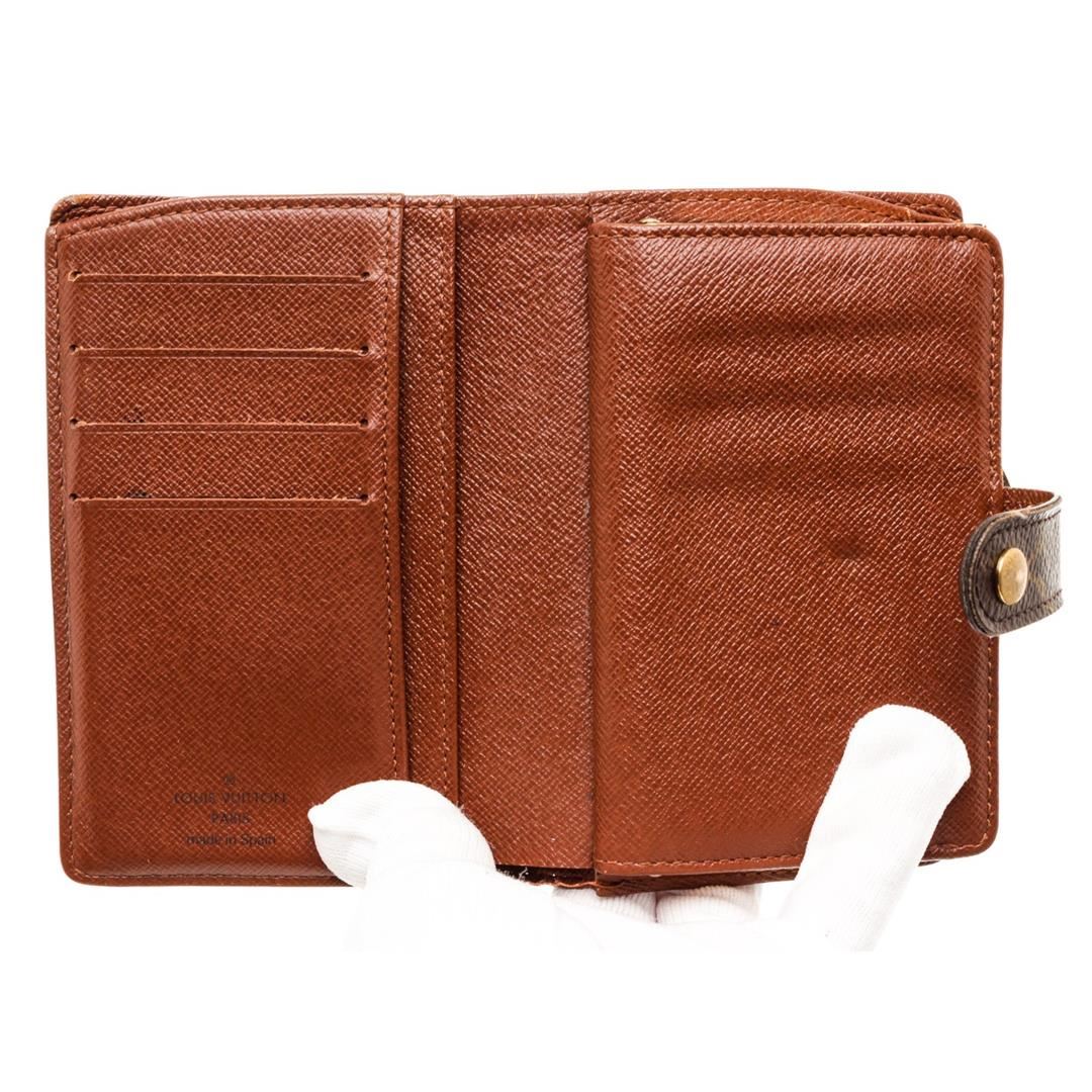 Brown and tan monogram coated canvas Louis Vuitton French Purse wallet with brass hardware, exterior compartment with kiss-lock closure, cinnamon Taiga leather lining, six card slots, single bill compartment and snap closure at front flap.