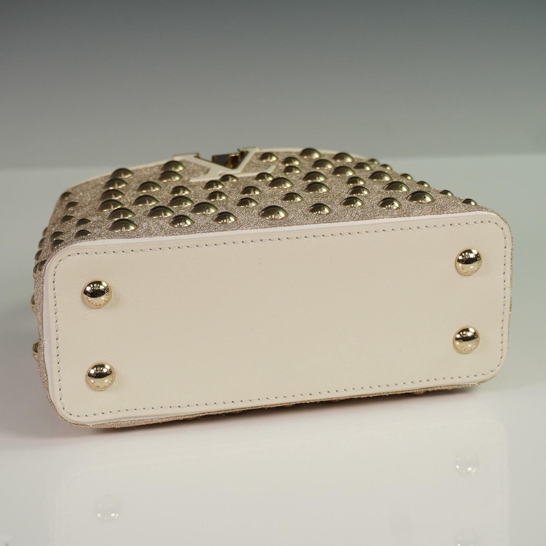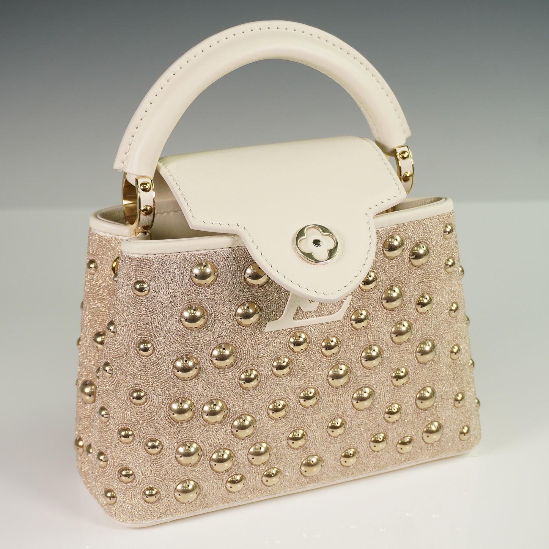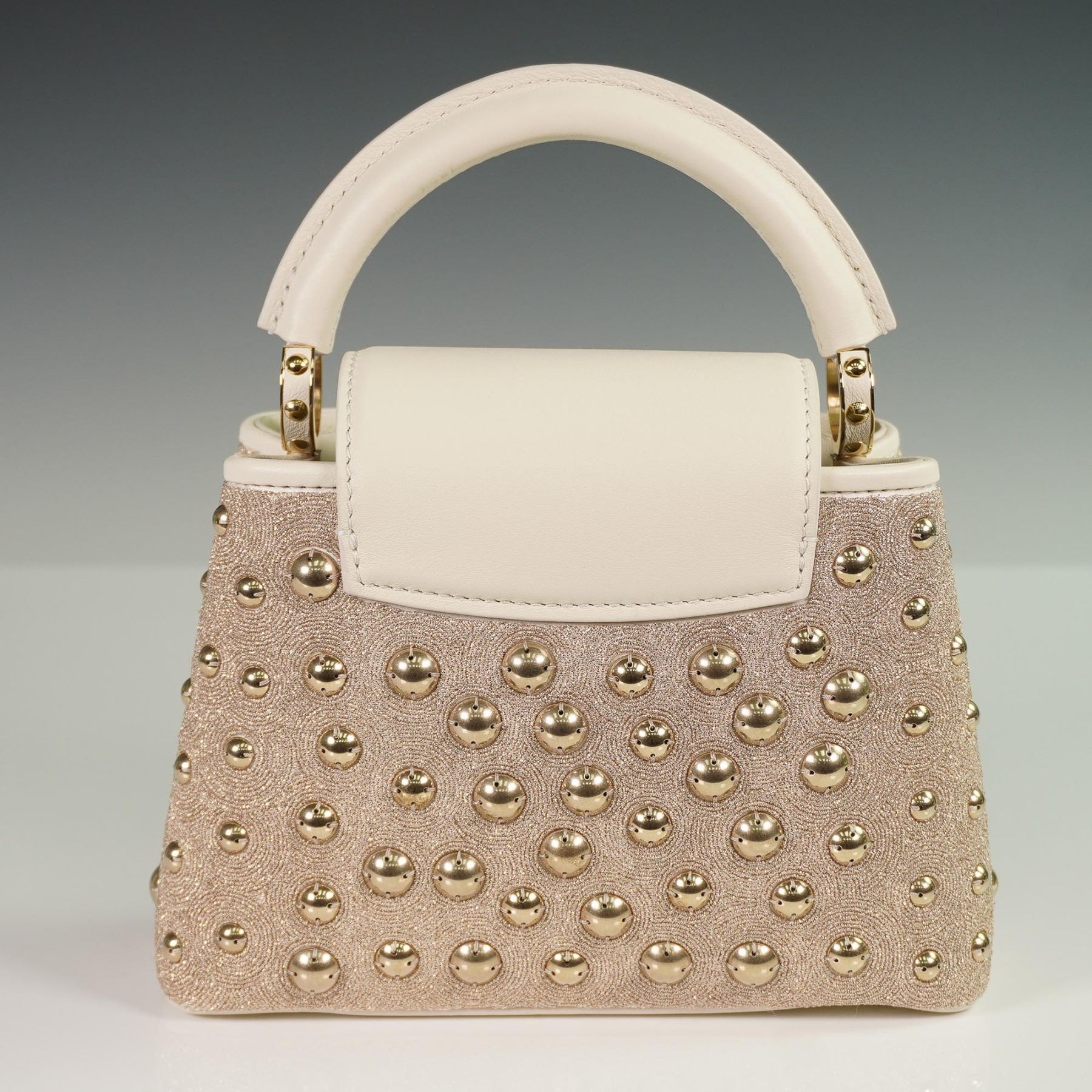 Louis Vuitton Capucines Mini handbag, crafted in France, featuring an elegant exterior of champagne-toned satin with intricate embroidery and gold-tone stud embellishments. The structured silhouette is trimmed in both satin and smooth cowhide leather, with a tonal cowhide leather interior. The signature LV monogram clasp, rolled leather top handle, and detachable leather strap offer both hand-held and crossbody styling options. The flap can be worn inside or out to showcase the iconic LV hardware.