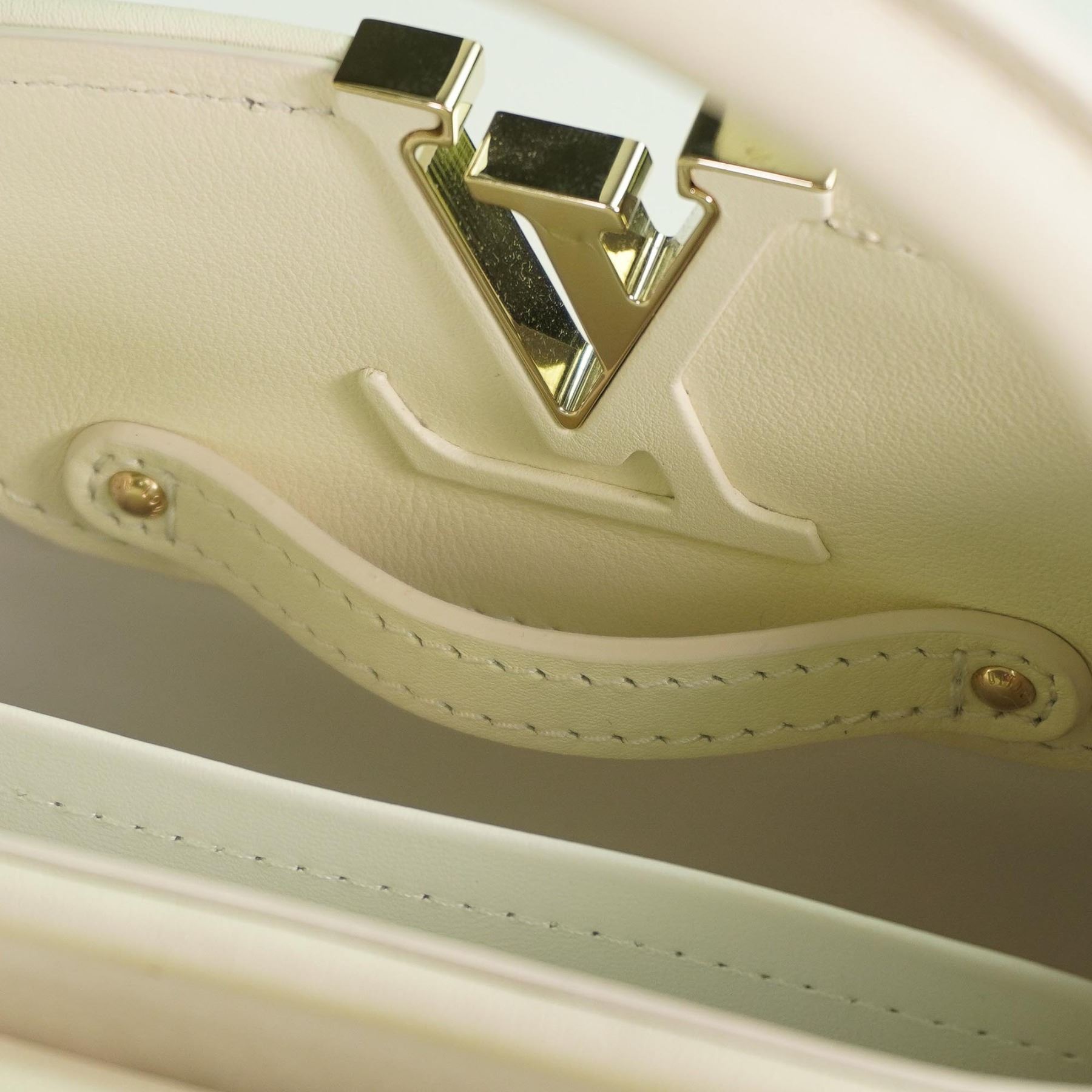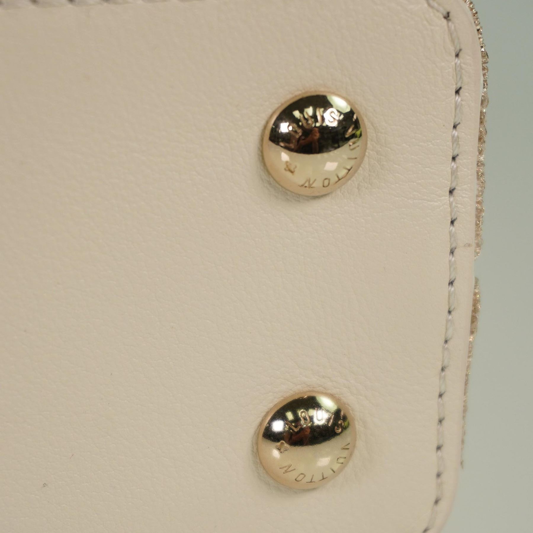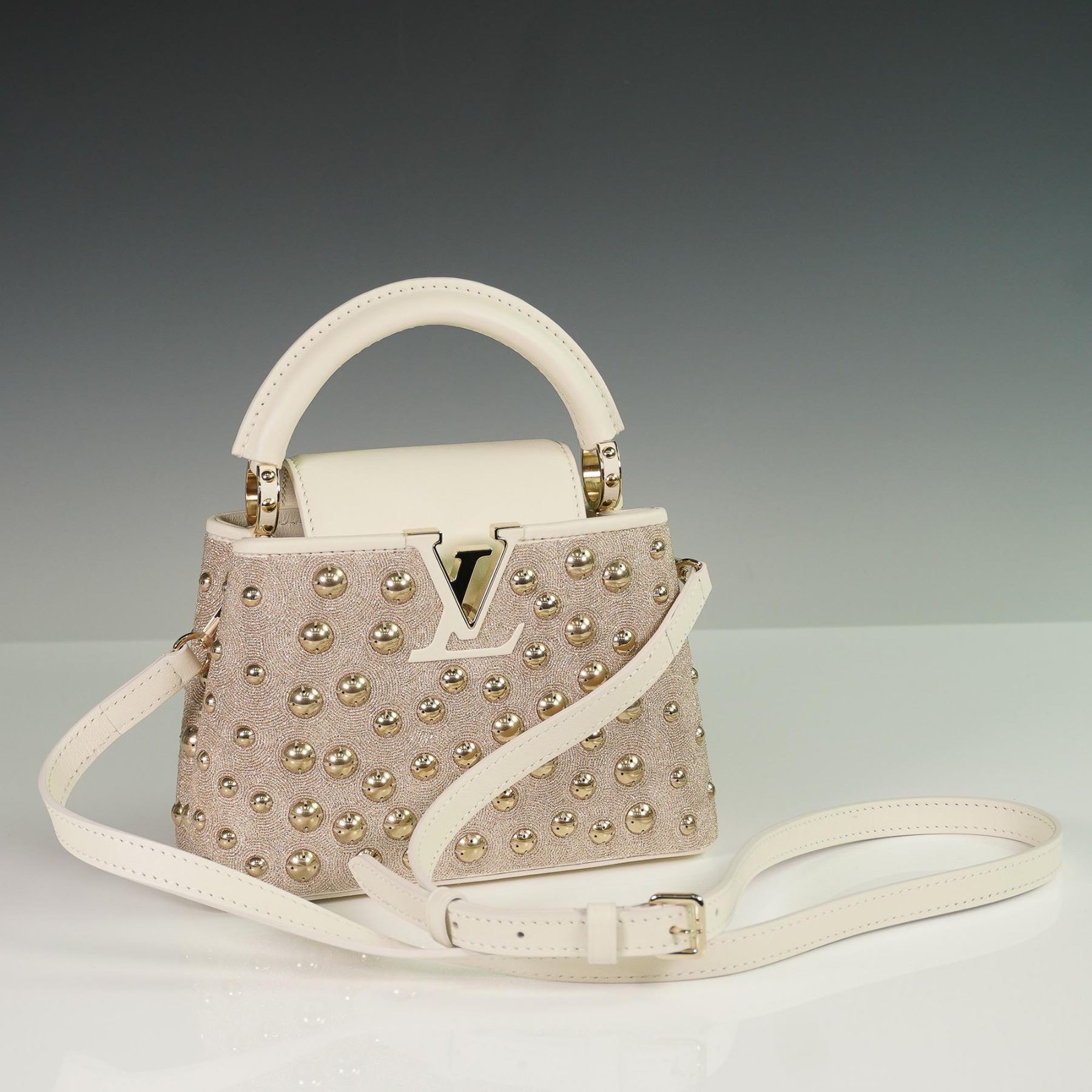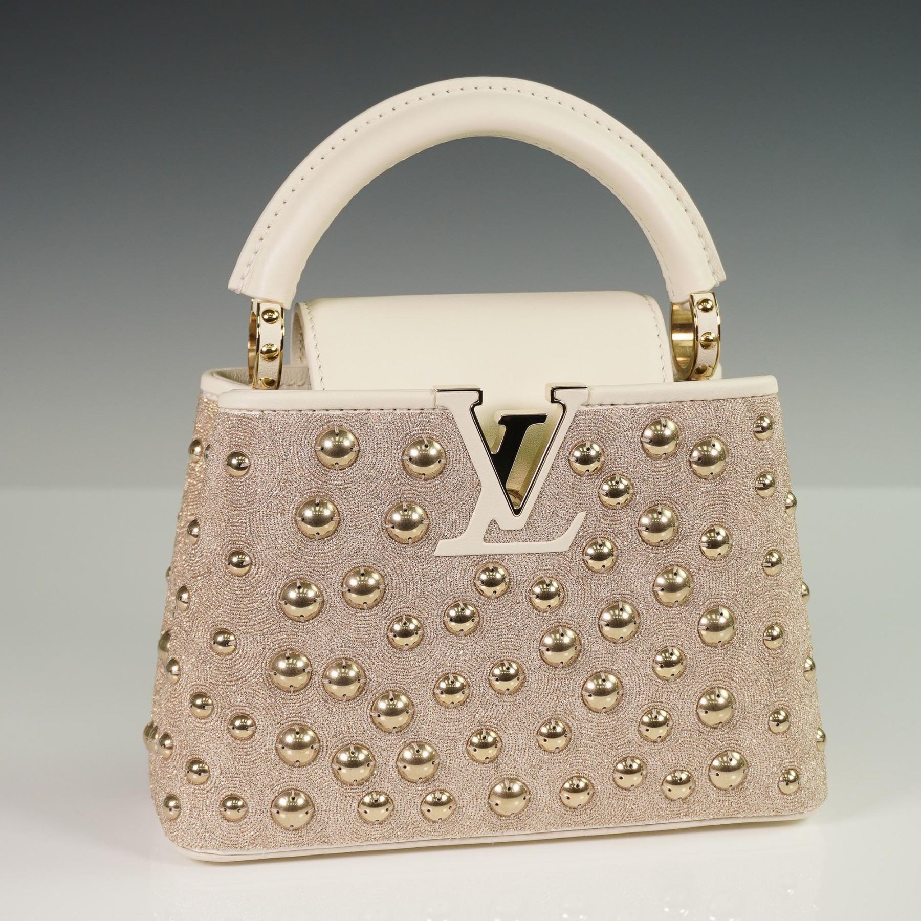 Louis Vuitton Capucines Mini handbag, crafted in France, featuring an elegant exterior of champagne-toned satin with intricate embroidery and gold-tone stud embellishments. The structured silhouette is trimmed in both satin and smooth cowhide leather, with a tonal cowhide leather interior. The signature LV monogram clasp, rolled leather top handle, and detachable leather strap offer both hand-held and crossbody styling options. The flap can be worn inside or out to showcase the iconic LV hardware.