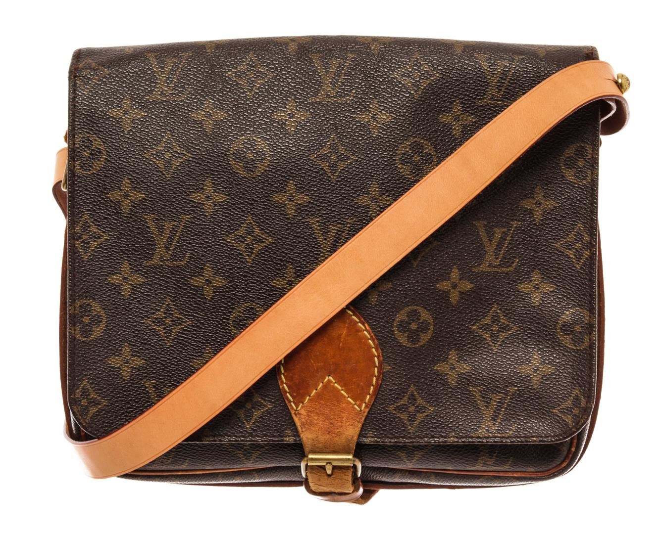 Louis Vuitton Cartouchiere GM Crossbody Brown Monogram Coated Canvas. Brand: Louis Vuitton, Style: Cartouchiere GM, Type: Crossbody, Exterior Color: Brown Monogram, Exterior Material: Coated Canvas, Exterior Pockets: None, Interior Color: Brown, Interior Material: Leather, Interior Pockets: One, Closure: Buckle, Handle/Strap Type: Adjustable Strap, Length: 3, Width: 1N/A, Height: 8, Strap Drop: 18-2N/A. Condition: Watermarks on vachetta, peeling on vachetta. Additional Information: Strap is replaced. Item is sold AS-IS and all information pertaining to this lot is available in the photos or this description.
