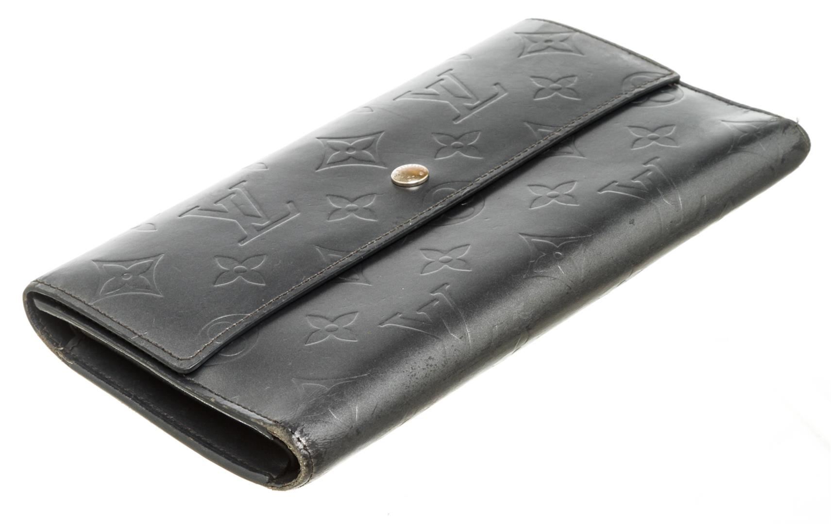 Charcoal monogram Mat leather Louis Vuitton International Wallet with silver-tone hardware, tonal leather lining, single compartment featuring snap closure, six card slots, dual bill compartments and snap closure at flap. Authentic.