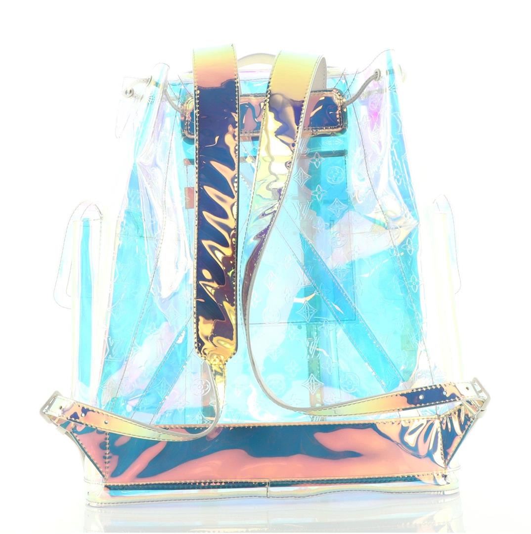 Louis Vuitton Clear PVC Monogram Prism Christopher GM Backpack features a holographic LV monogram against an iridescent PVC material and matted, white hardware.