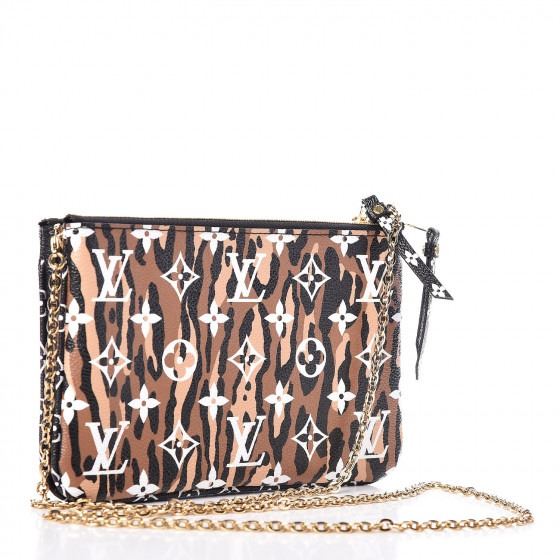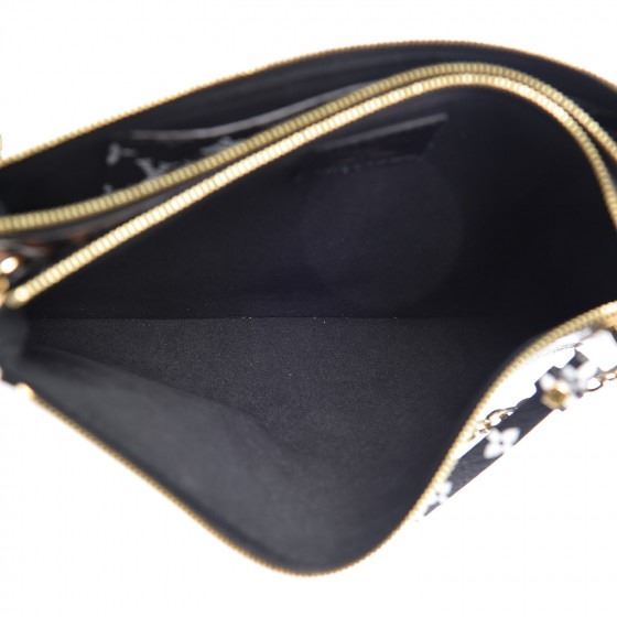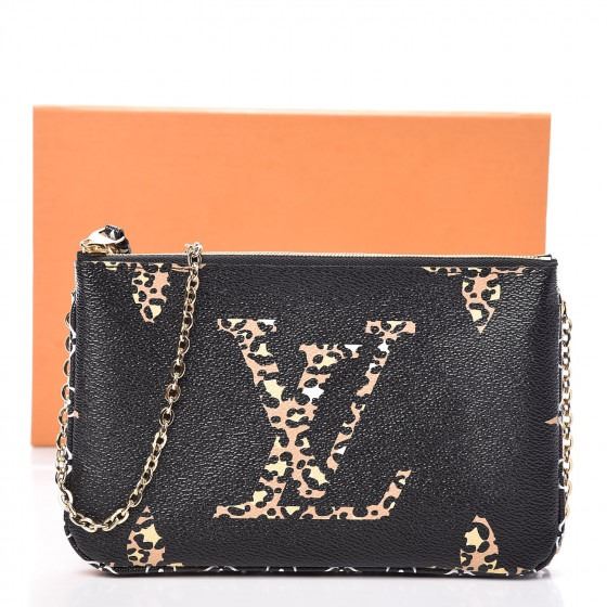 This clutch features both oversized and classic Louis Vuitton monogram on black and leopard print coated canvas. The bag features black and white monogram canvas trim, and an optional polished brass chain link shoulder strap. The matching top zippers open to a black microfiber interior with a black and white monogram canvas card slot panel.