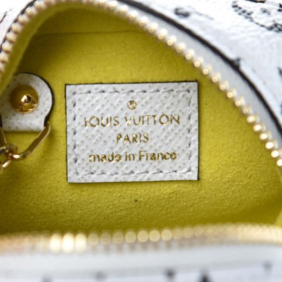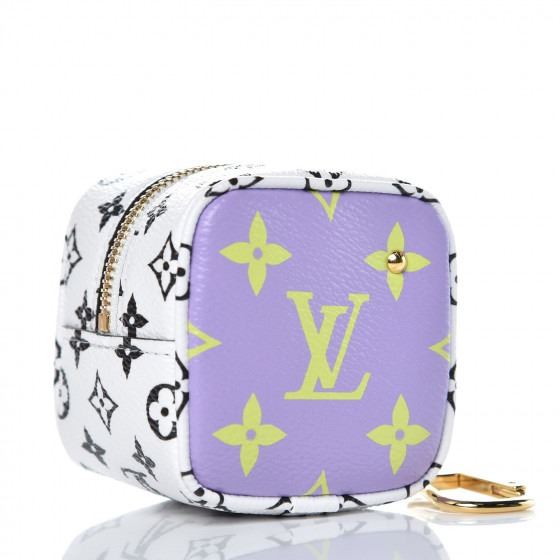 Description: LOUIS VUITTON Monogram Giant Cube Coin Purse Pink. features oversized and miniature monogram print in pink, yellow, black and white on coated canvas. The zipper opens to a bright yellow microfiber lining, with a golden brass hardware hook on a chain.
