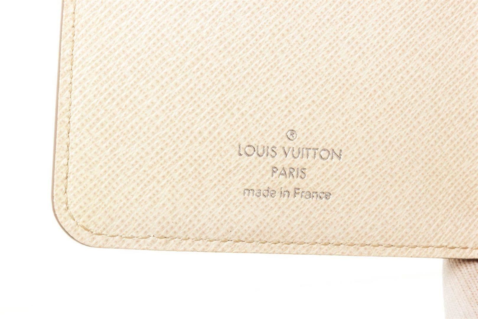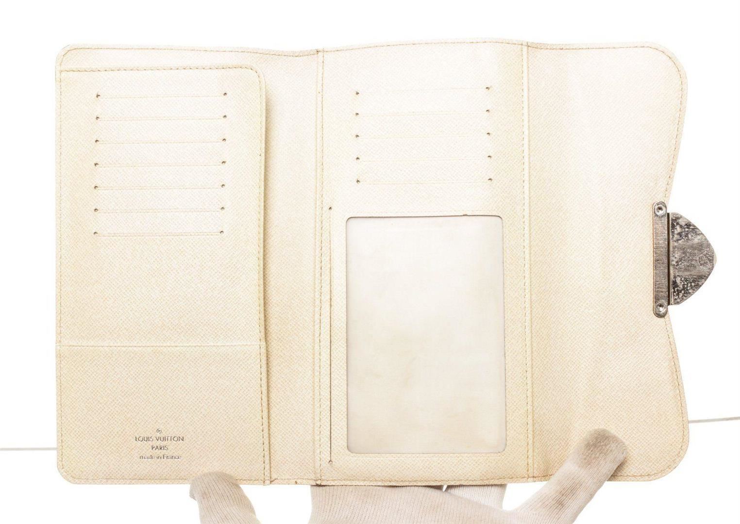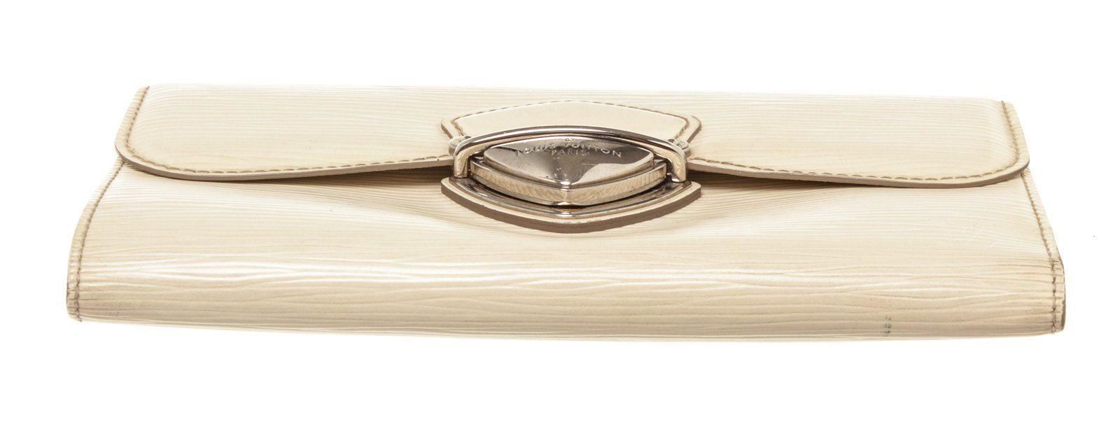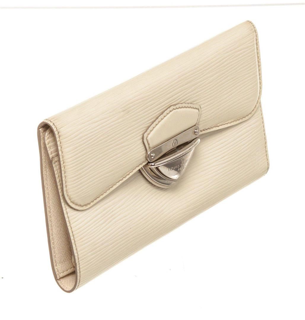 Louis Vuitton Cream Epi Leather Eugnie Wallet with material epi leather, gold-tone hardware, trim tan vachetta, leather lining, exterior zip pocket, interior card holder pocket and push-lock closure.