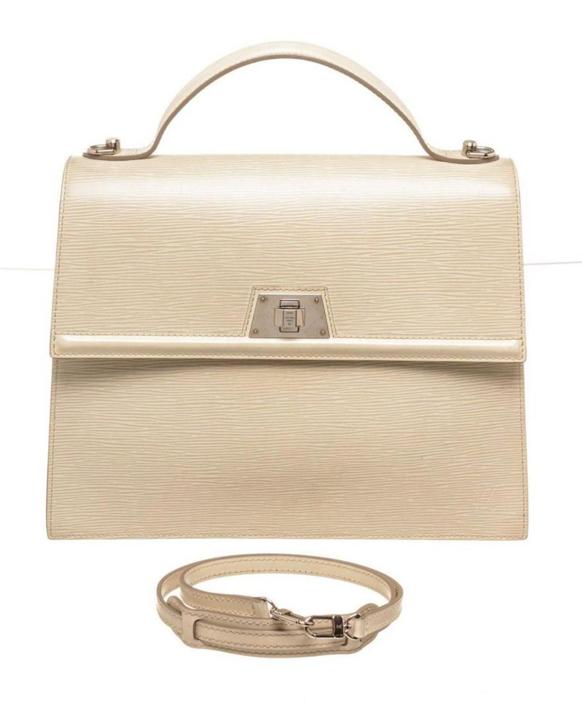 Louis Vuitton Cream Epi Leather Sevigne Handbag. Louis Vuitton Cream Epi Leather Sevigne Handbag with material epi leather, gold-tone hardware, trim tan vachetta leather, interior zip pocket, top handle and turn-lock closure.