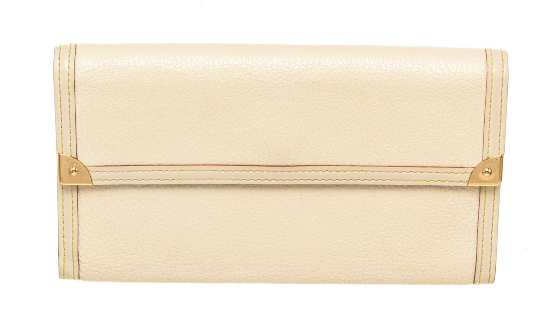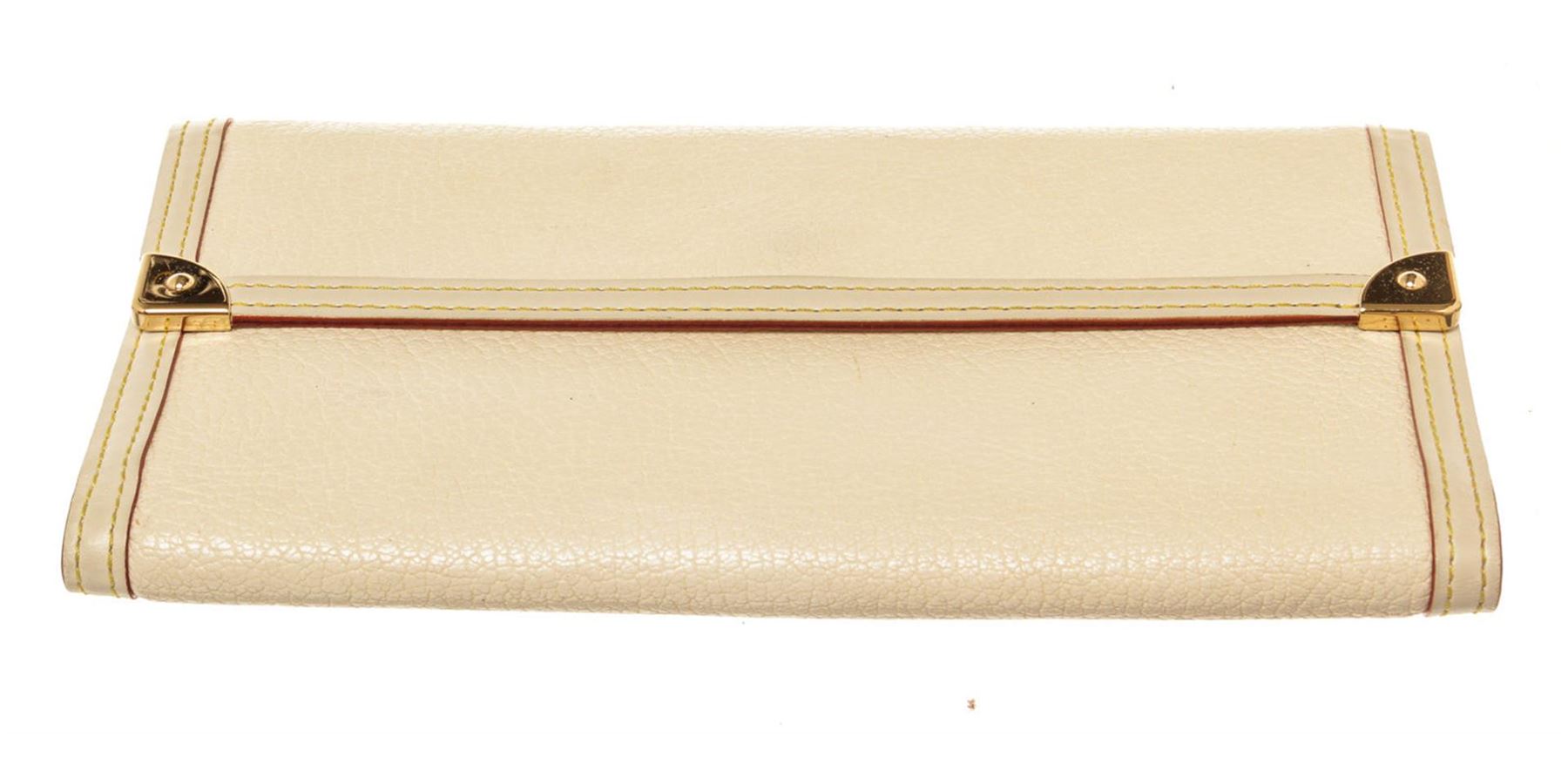 One Louis Vuitton Cream Leather International Wallet. Item is sold AS-IS. All available information is listed in the description and shown in the photo. Louis Vuitton Cream Leather International Wallet with leather, gold-tone hardware, trim tan vachetta leather, interior three compartments pocket and snap closure.