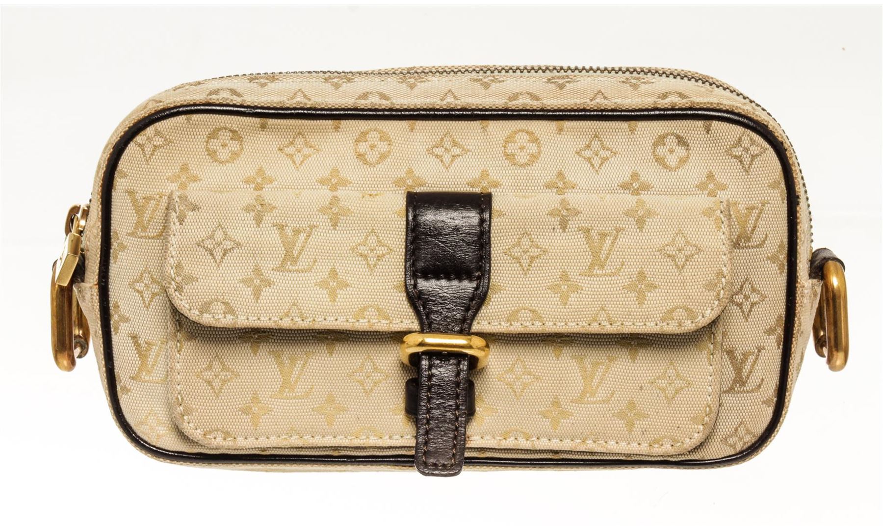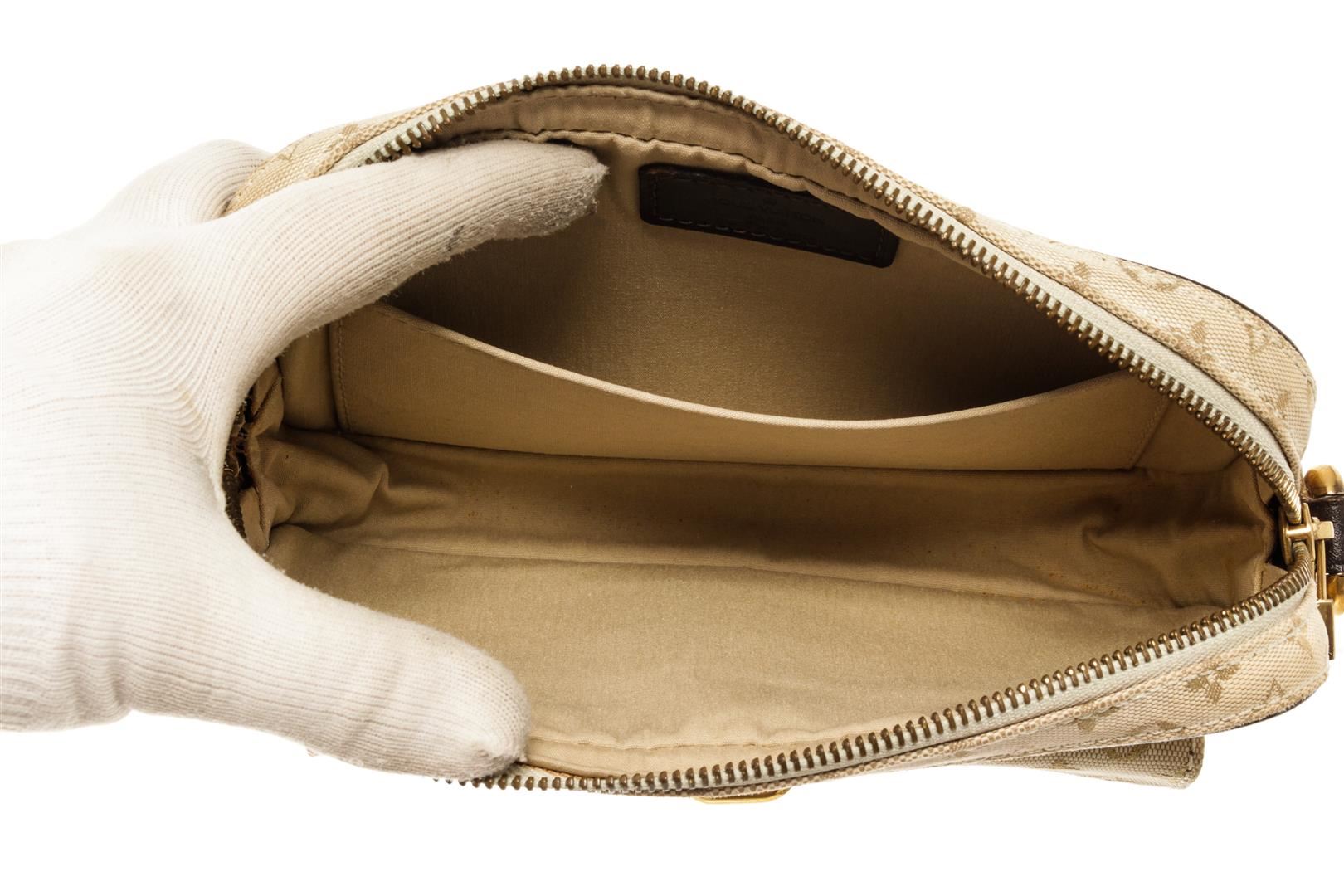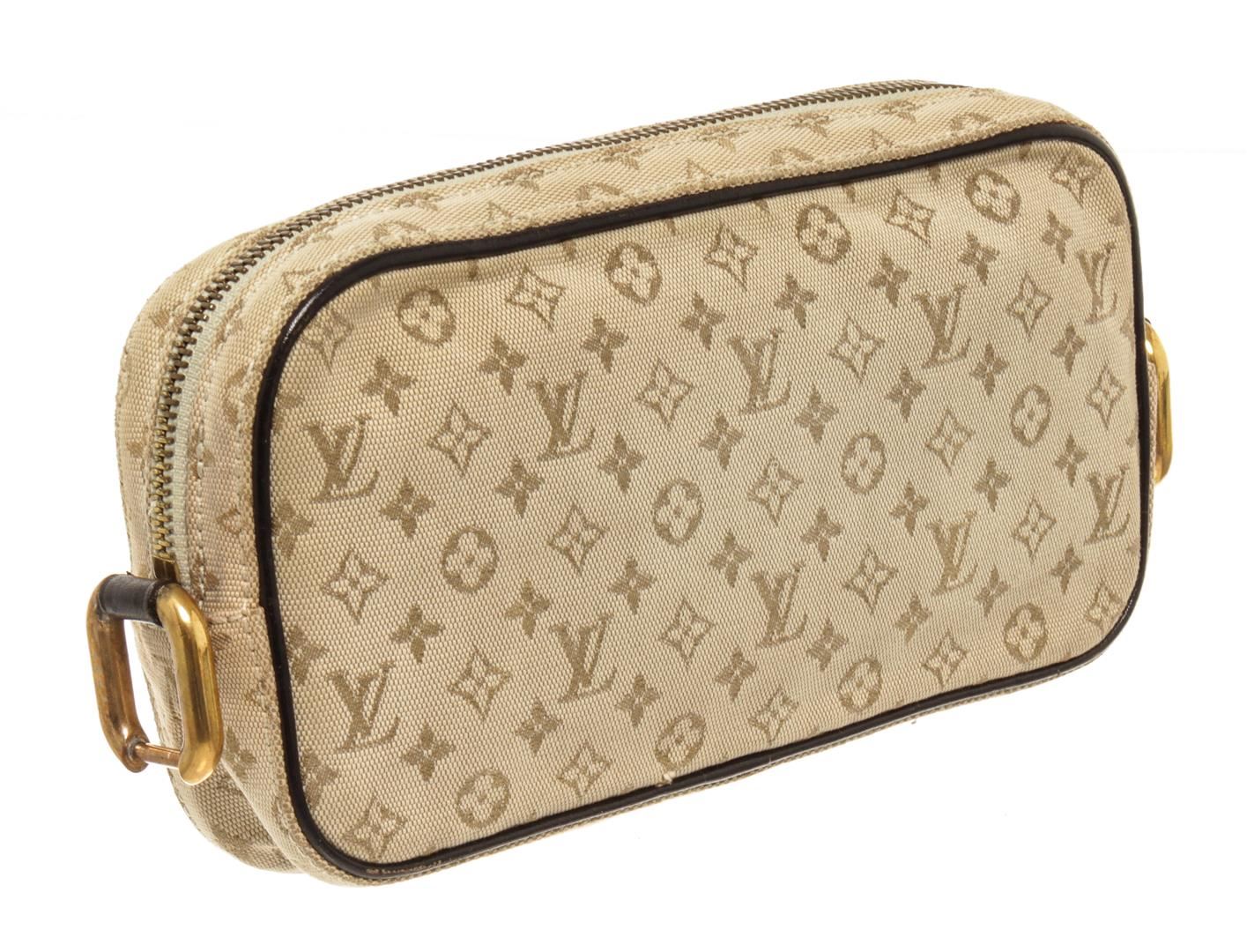 One Louis Vuitton Cream Mini Lin Monogram Juliette. Item is sold AS-IS. All available information is listed in the description and shown in the photo. Louis Vuitton Cream Mini Lin Monogram Juliette with gold hardware, exterior pocket, fabric interior, interior slip pocket, gold hardware, zipper closure.