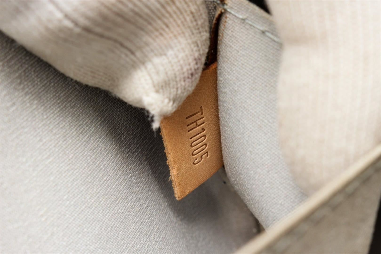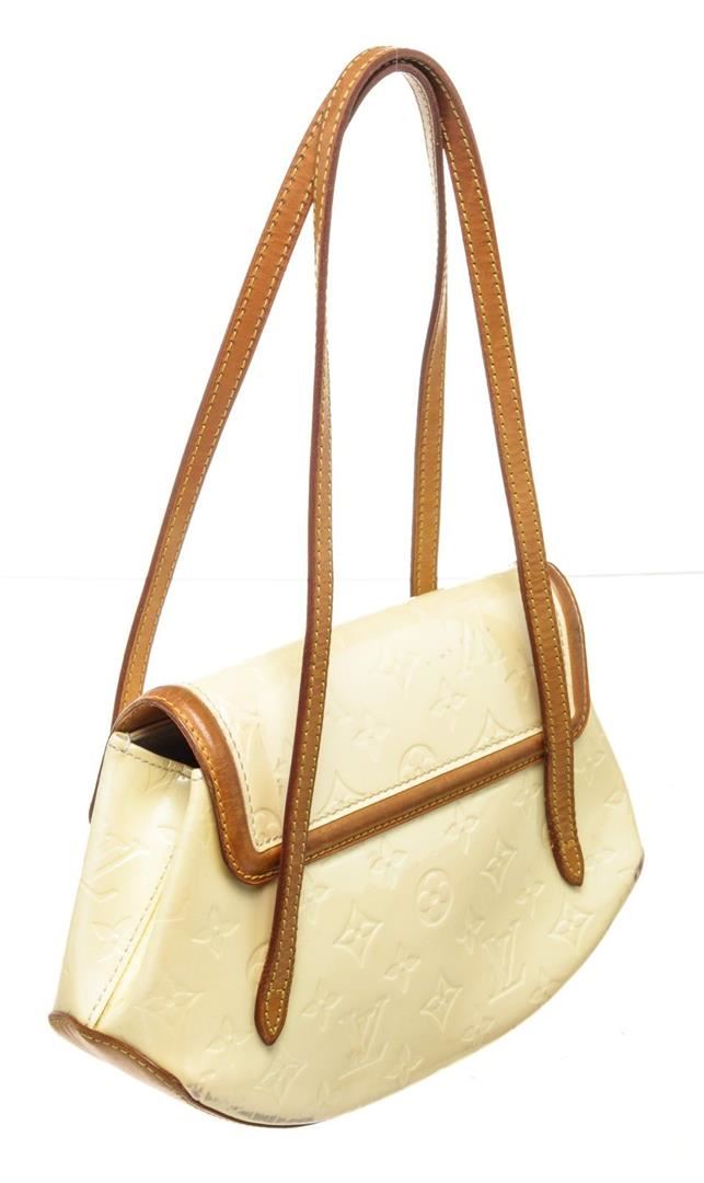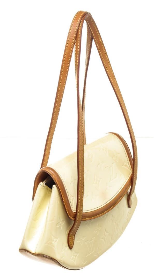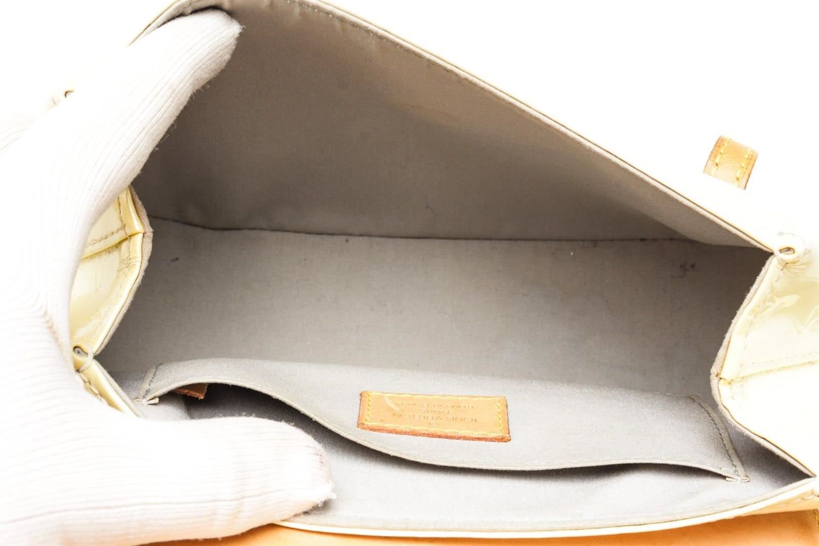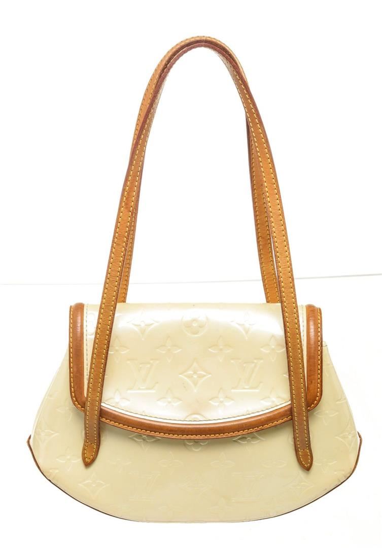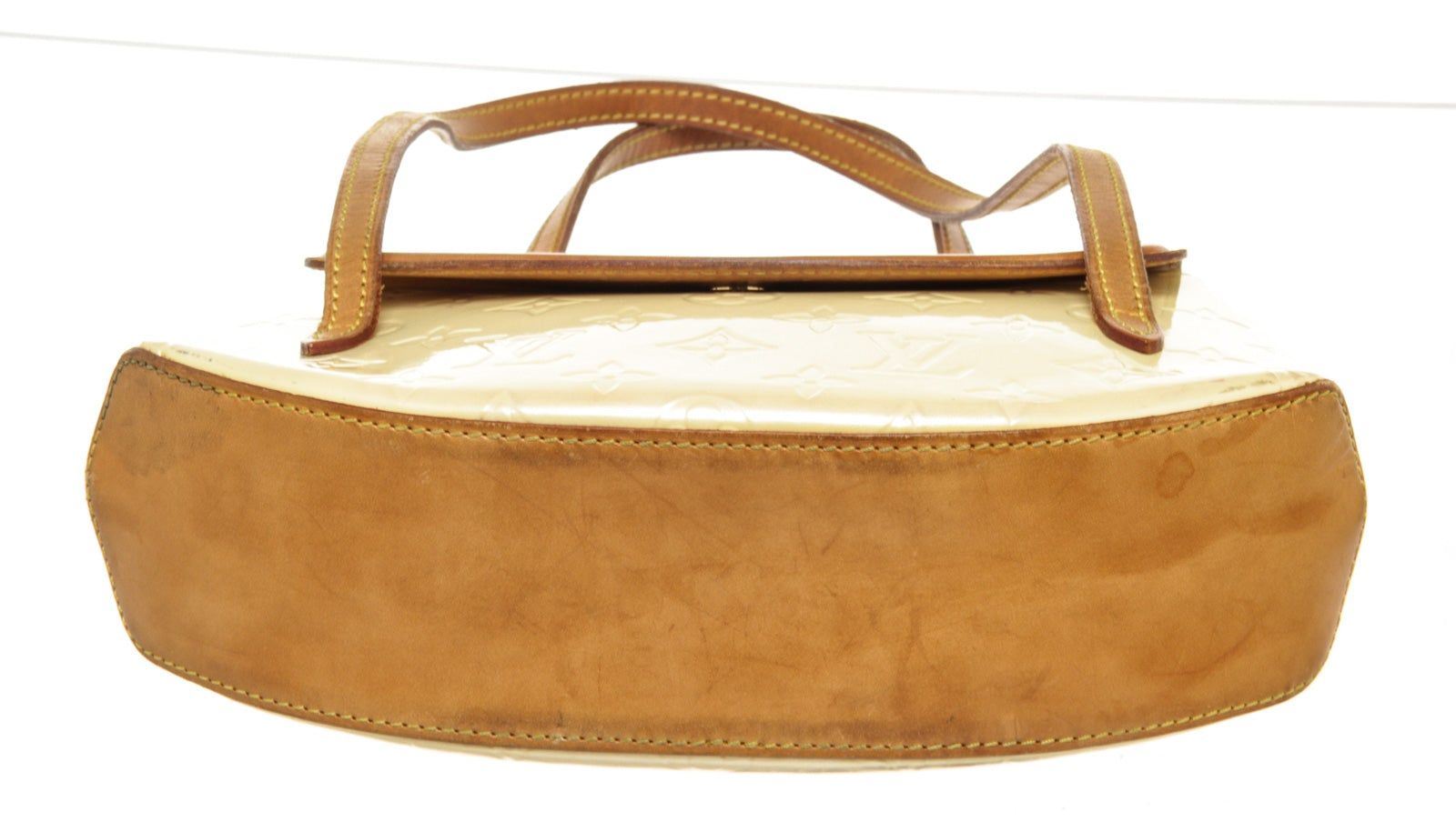 Louis Vuitton Cream Monogram Vernis Leather Biscayne Bay PM Bag with brass hardware, tan vachetta leather trim with yellow contrast stitching, dual flat shoulder straps, tonal canvas lining, single interior slit pocket and magnetic snap closure at front f