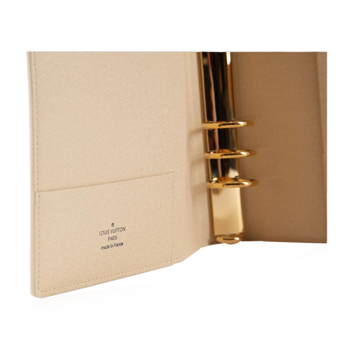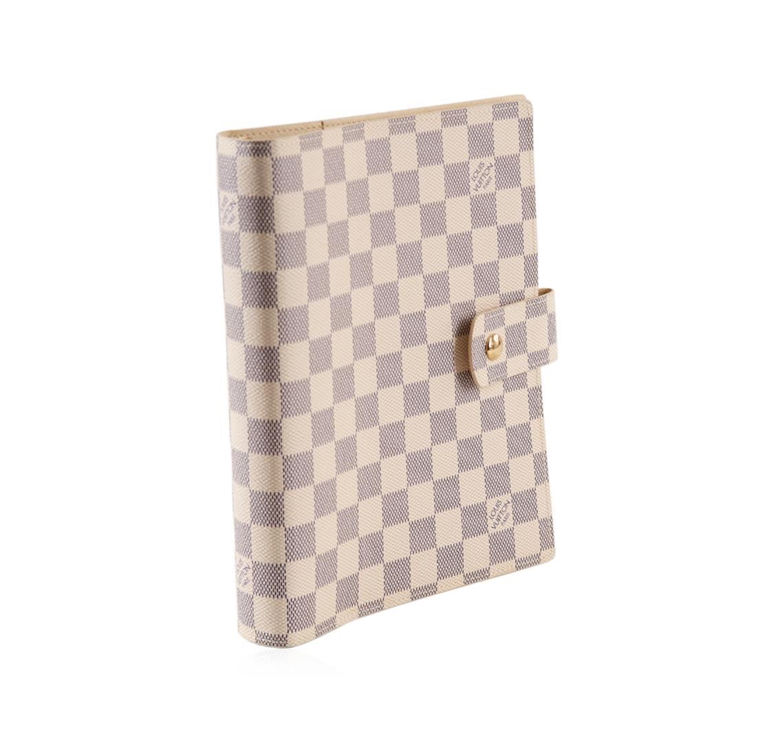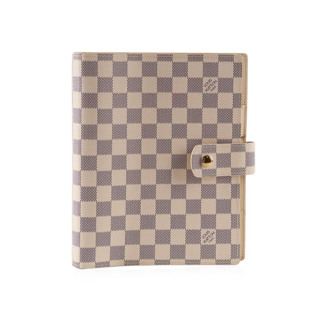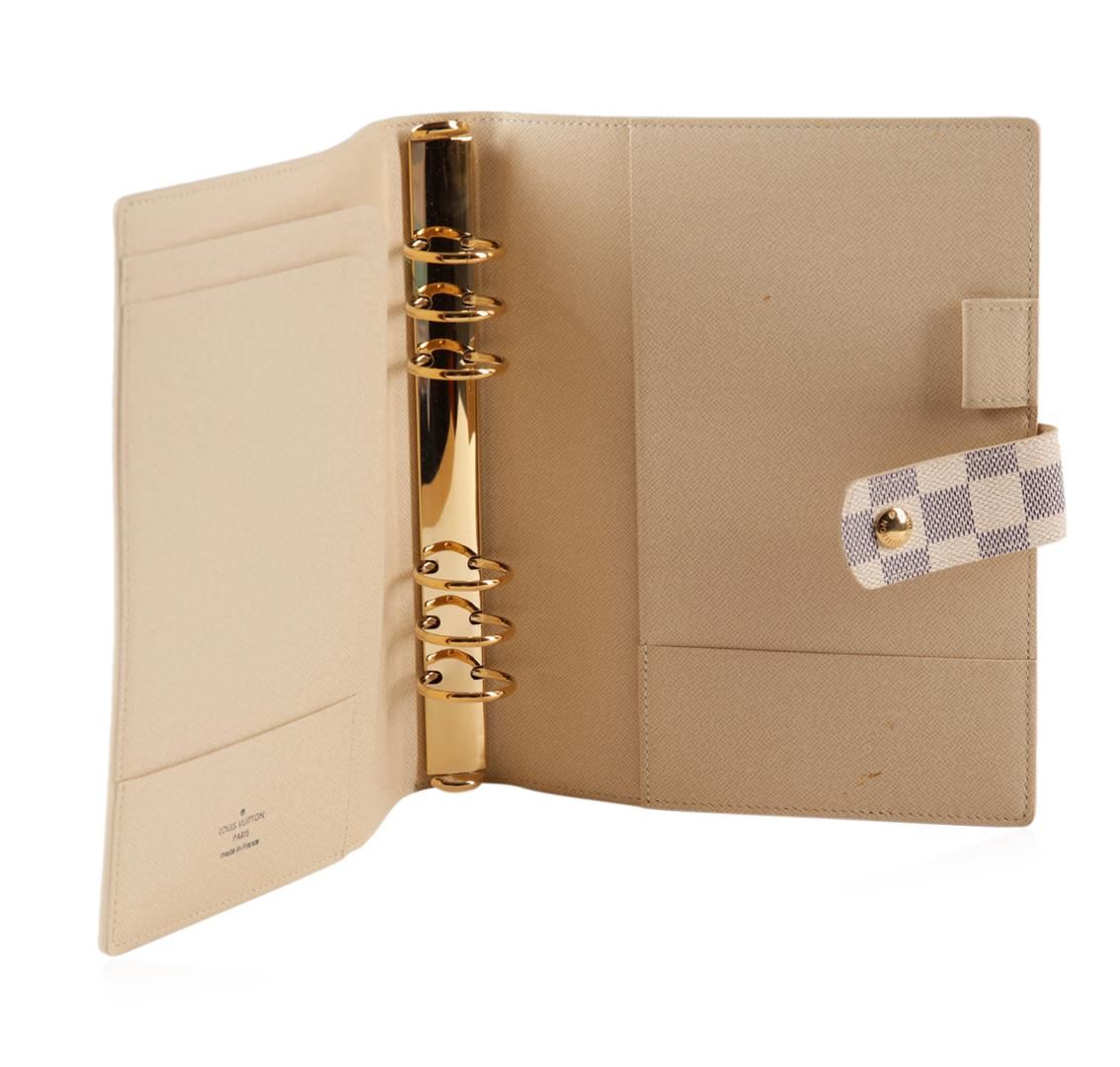 One Louis Vuitton Damier Azur canvas agenda cover in good condition, measuring 9.25 inches tall by 7.25 inches wide. The agenda cover features two sets of three rings, a pen holder, and multiple flaps for storage. Comes with a Louis Vuitton cover bag.