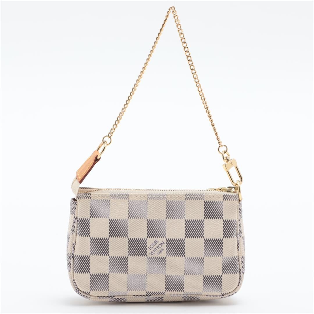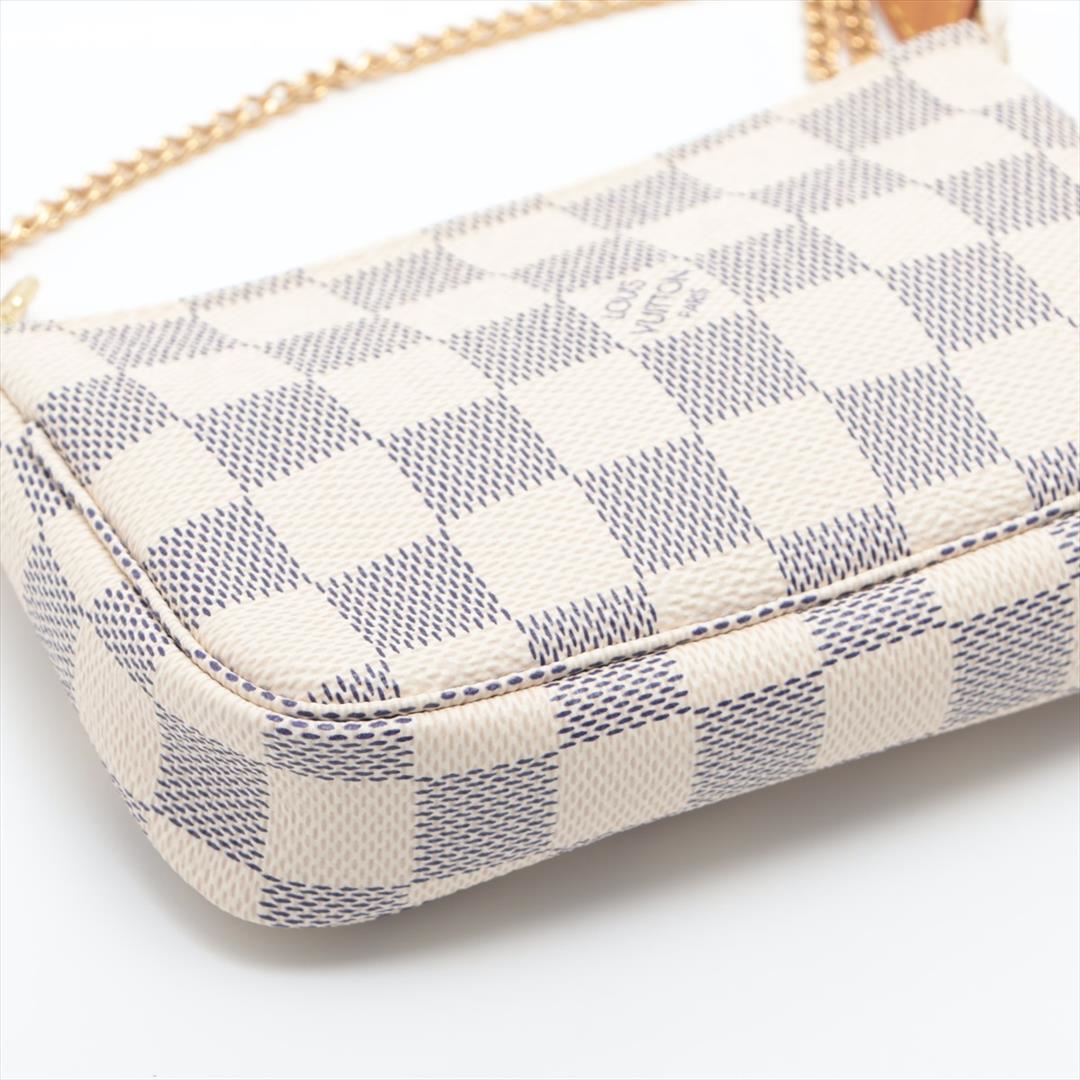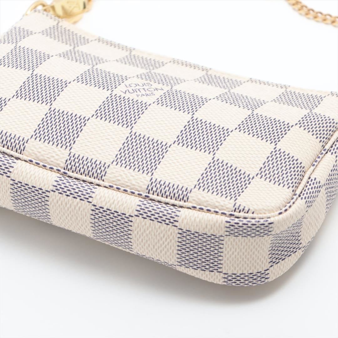 Ivory and navy blue Damier Azur coated canvas Louis Vuitton Mini Pochette Accessories shoulder bag with gold-tone hardware, tan leather trim, chain-link handle, beige canvas lining and zip closure at top. Height: 4" Width: 6" Depth: 1" Handle Drop: 6