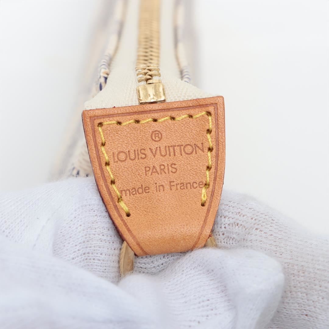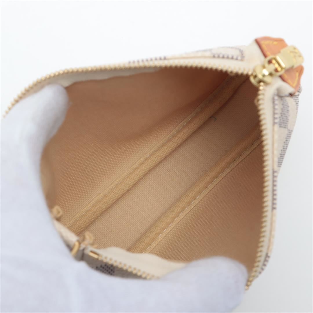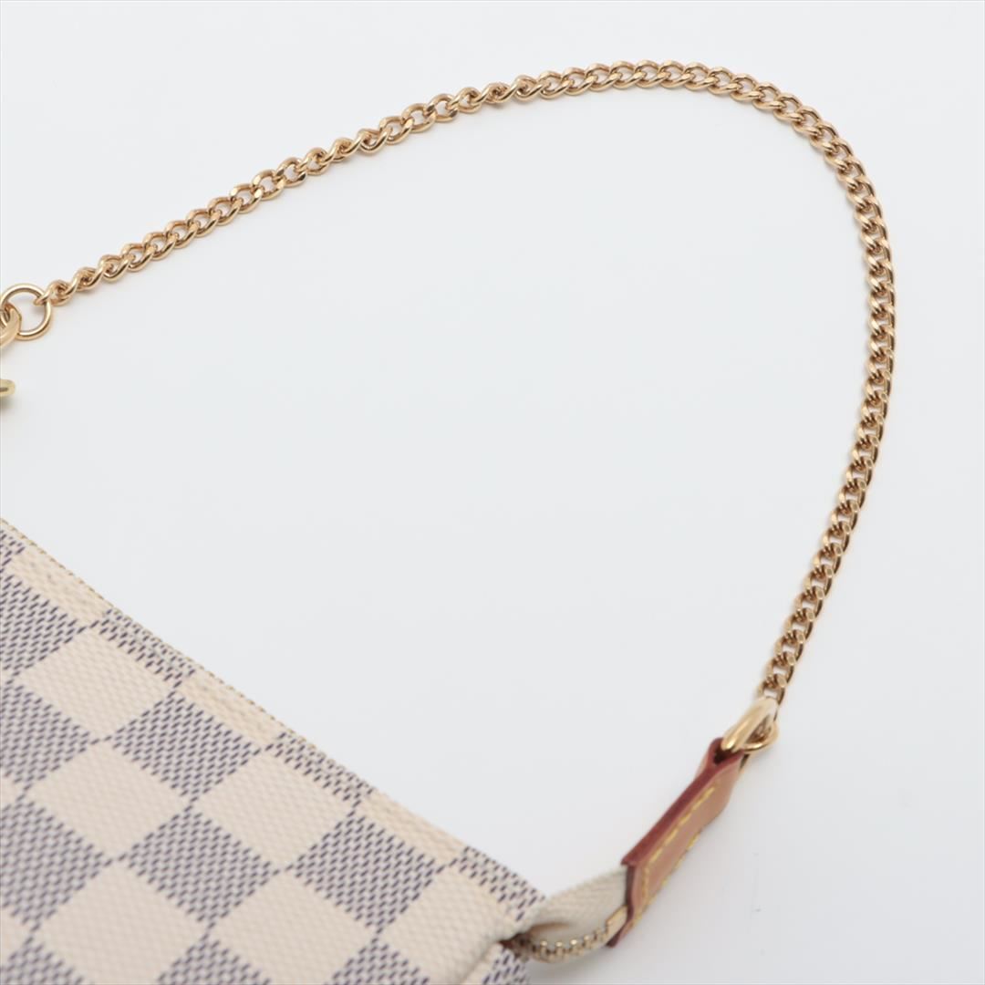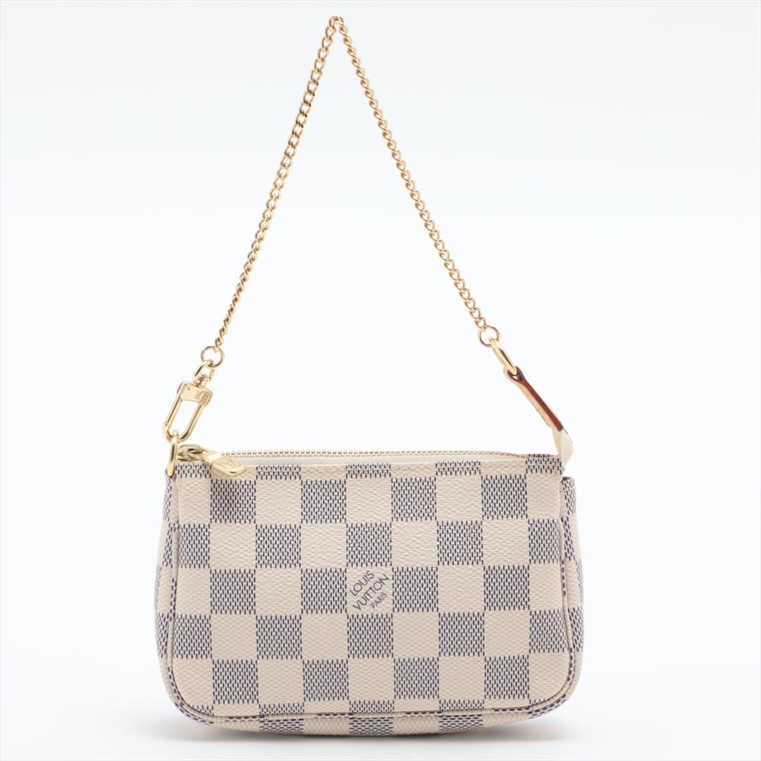 Ivory and navy blue Damier Azur coated canvas Louis Vuitton Mini Pochette Accessories shoulder bag with gold-tone hardware, tan leather trim, chain-link handle, beige canvas lining and zip closure at top. Height: 4" Width: 6" Depth: 1" Handle Drop: 6