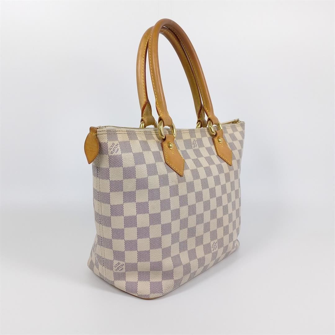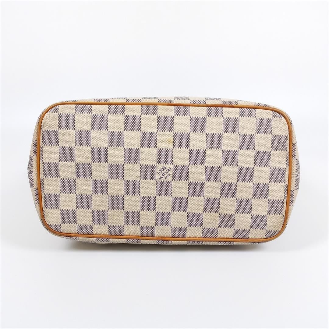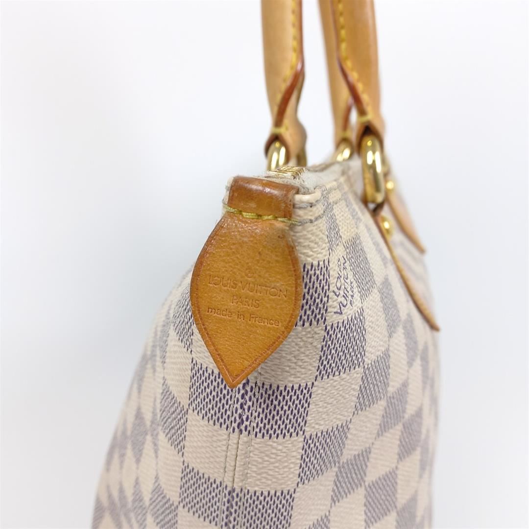 Ivory and navy blue Damier Azur coated canvas Louis Vuitton Saleya PM with gold-tone hardware, tan vachetta leather trim, dual rolled top handles, beige Alcantara lining, dual pockets at interior wall and zip closure at top. 10"x5.5"x9.5"xBag Drop:6"/2