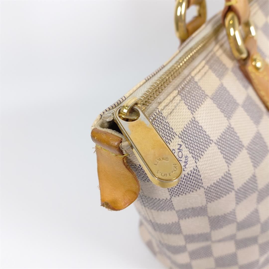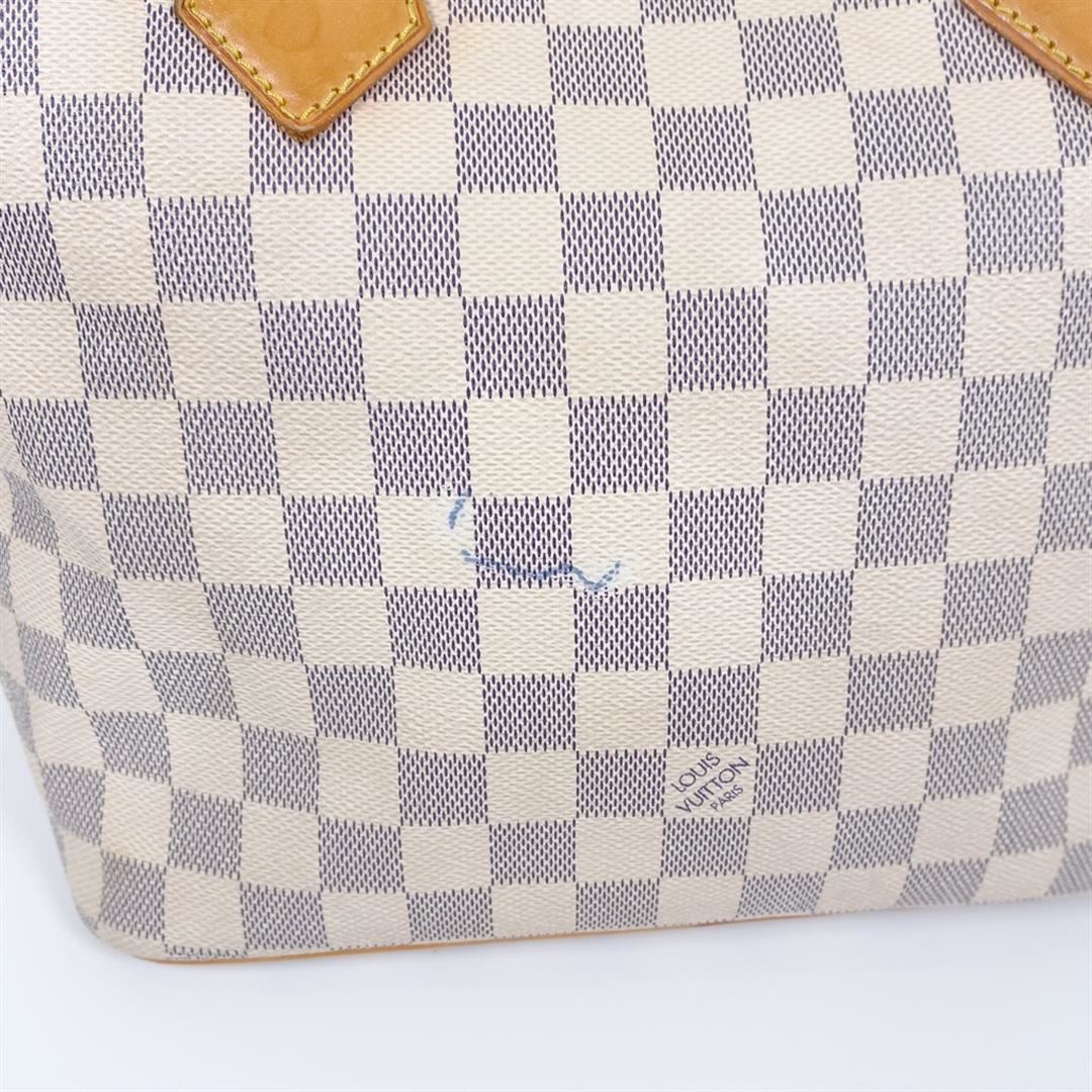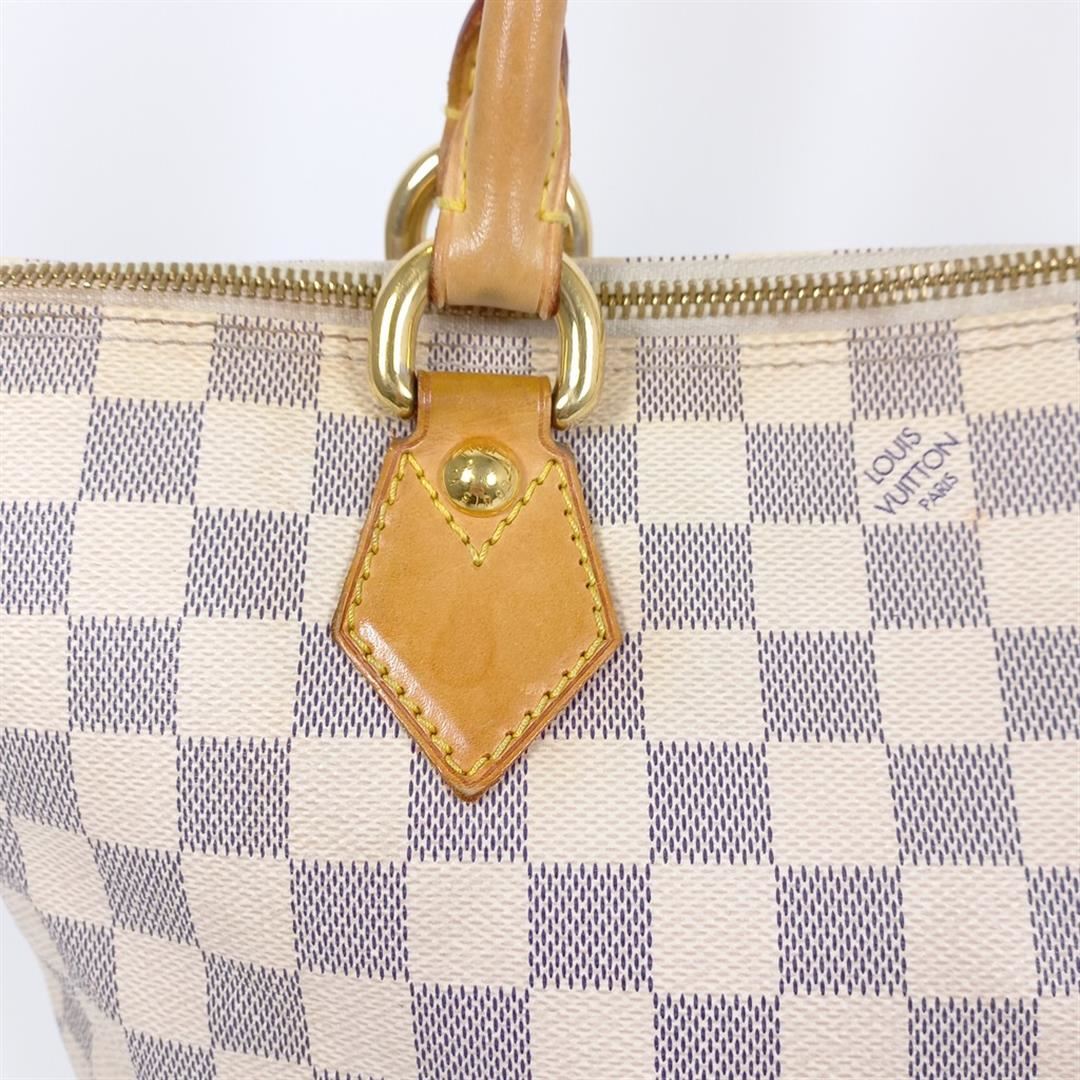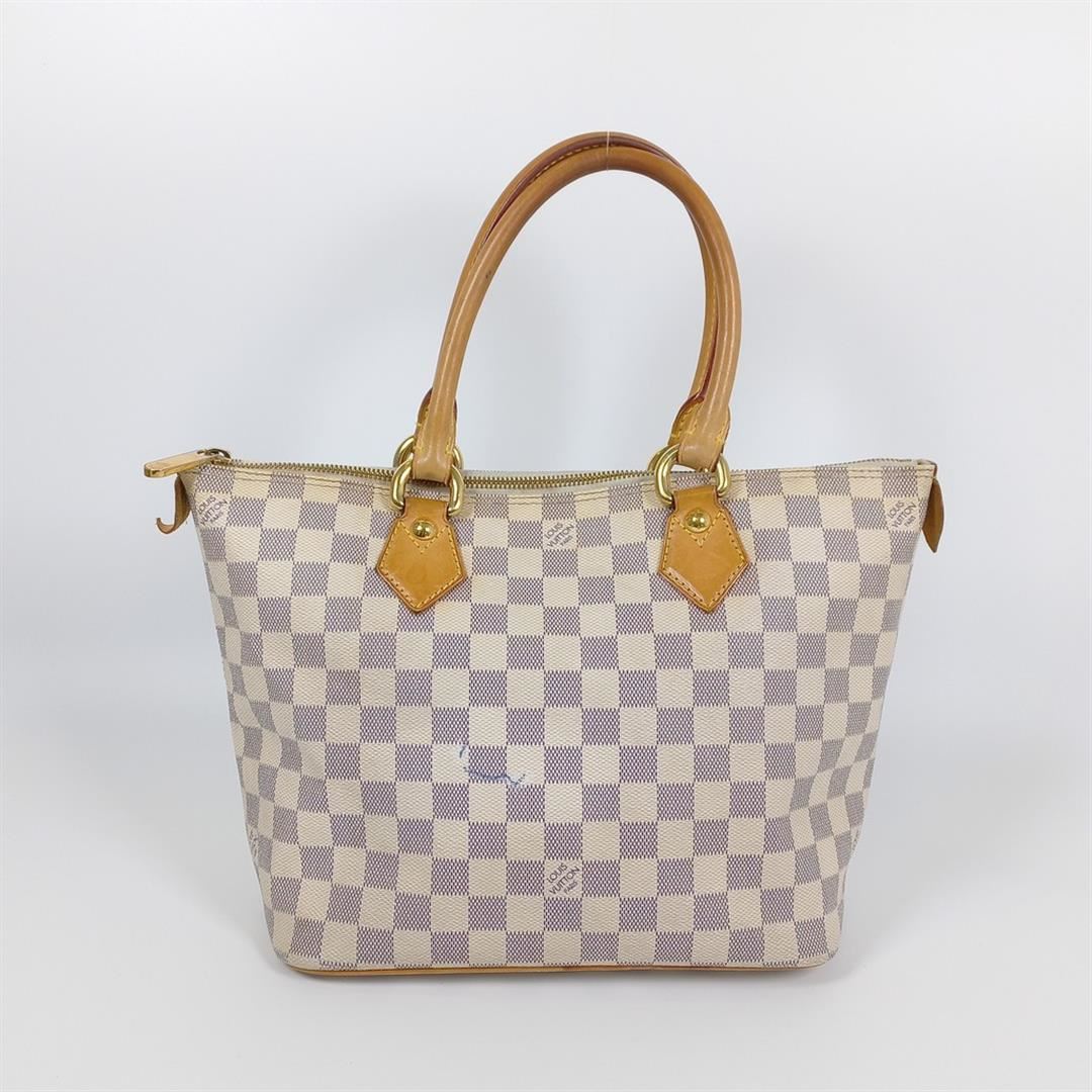 Ivory and navy blue Damier Azur coated canvas Louis Vuitton Saleya PM with gold-tone hardware, tan vachetta leather trim, dual rolled top handles, beige Alcantara lining, dual pockets at interior wall and zip closure at top. 10"x5.5"x9.5"xBag Drop:6"/2
