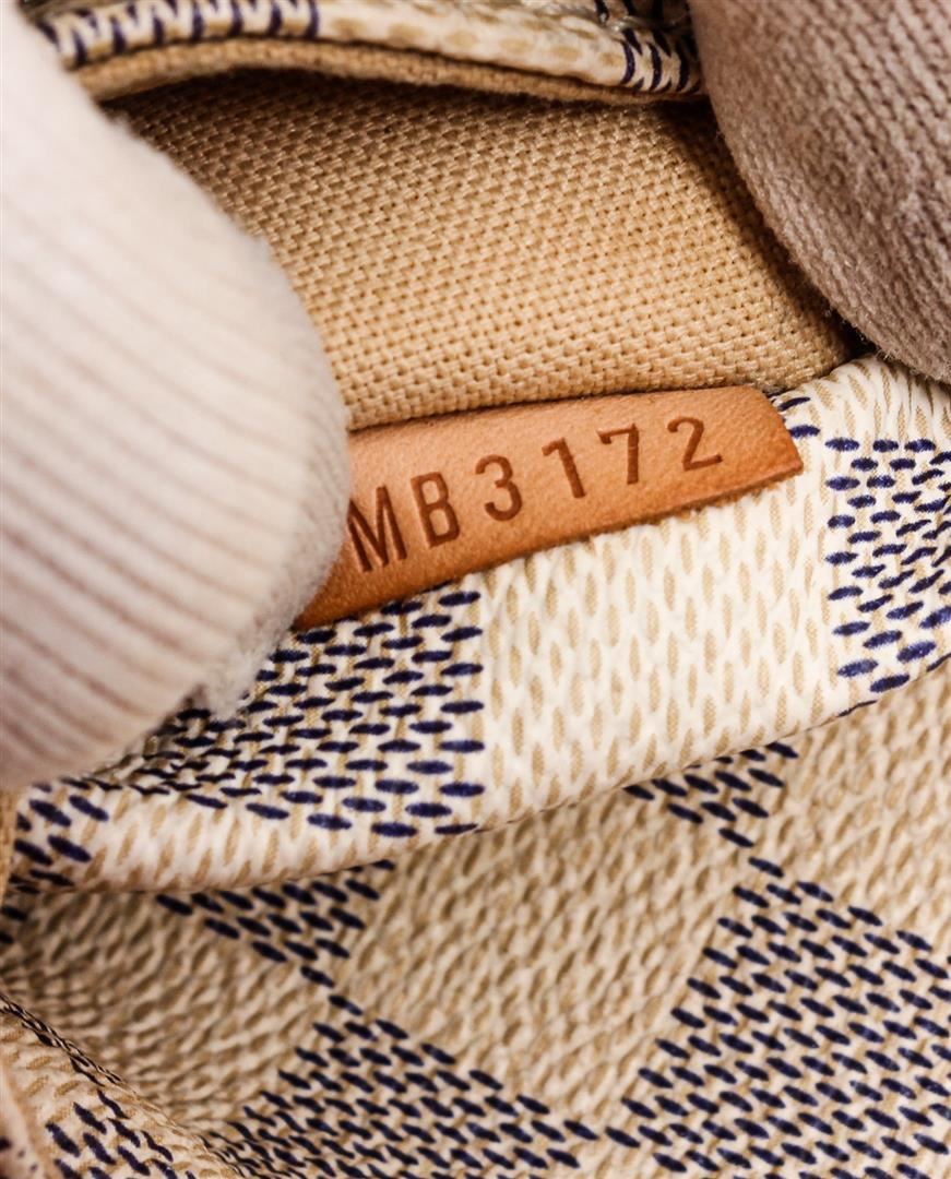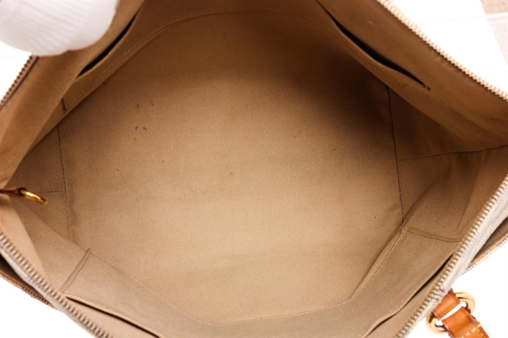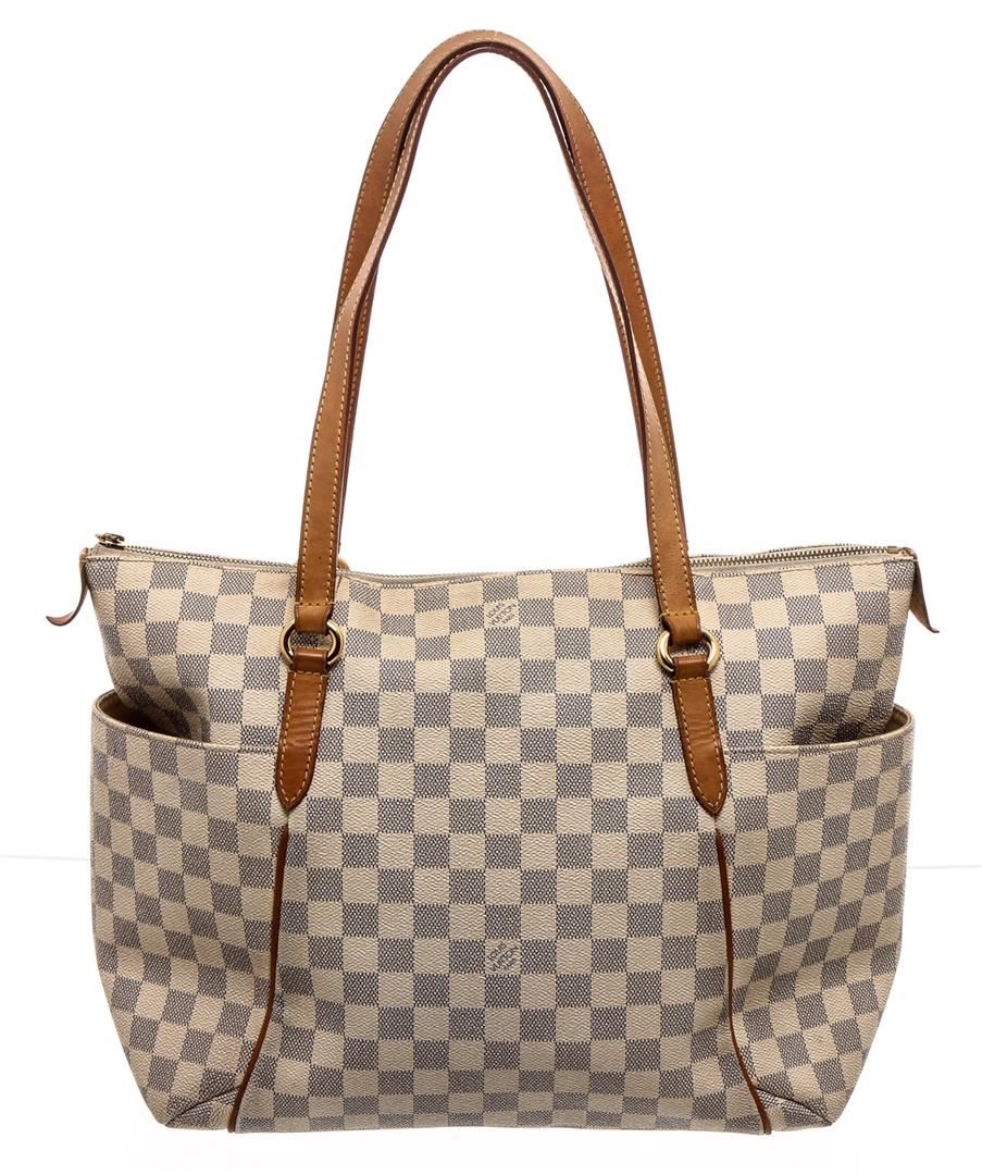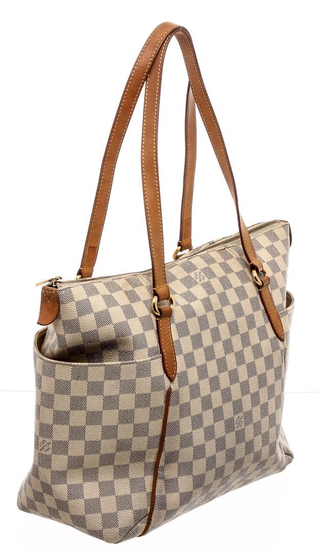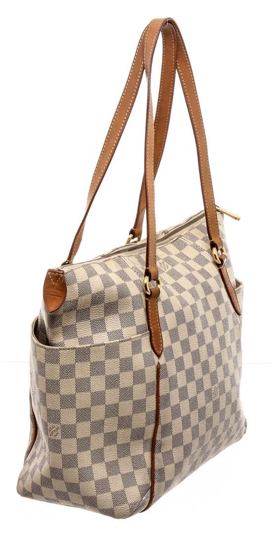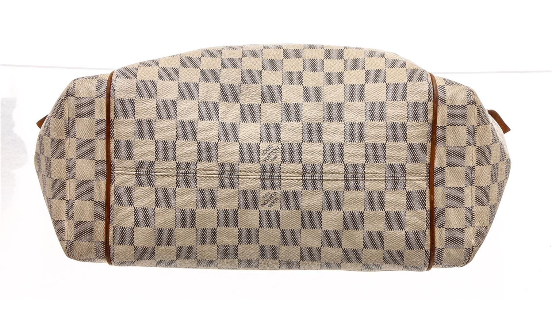 One Louis Vuitton Damier Azur Canvas Leather Totally MM Bag. Creme and navy blue Damier Azur coated canvas Louis Vuitton Totally MM with brass hardware, tan vachetta leather trim, dual exterior side pockets, dual flat shoulder straps, creme canvas lining, three pockets at interior walls and top zip closure.