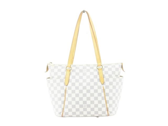 One Louis Vuitton Damier Azur Canvas Leather Totally PM Tote Bag. Item is sold AS-IS. All available information is listed in the description and shown in the photo. Ivory and navy Damier Azur coated canvas Louis Vuitton Totally PM with gold-tone hardware, tan vachetta leather trim, dual flat shoulders straps, dual slit pockets at exterior, neutral canvas lining, dual slit pockets at interior walls and zip closure at top. . Height: 10.5" Width: 15" Depth: 5.5" Shoulder Strap Drop: 9.5"