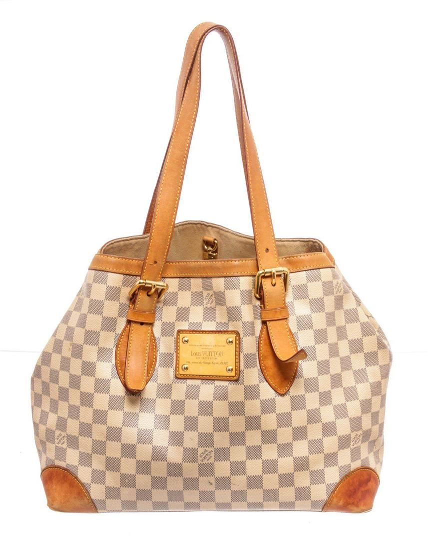 Louis Vuitton Damier Azur Damier Ebene Hampstead MM Tote Bag with gold-tone hardware, dual flat adjustable shoulder straps, moka leather trim, vermillion canvas lining, single interior zip pocket and two-way zip closure at top with sides additional snap closures. Measurements: Length: 6.5 in / 17 cm Width: 18 in / 46 cm 11 in / 28 cmCONDITION: Pre-Owned Good overall, please see photographs for detail.