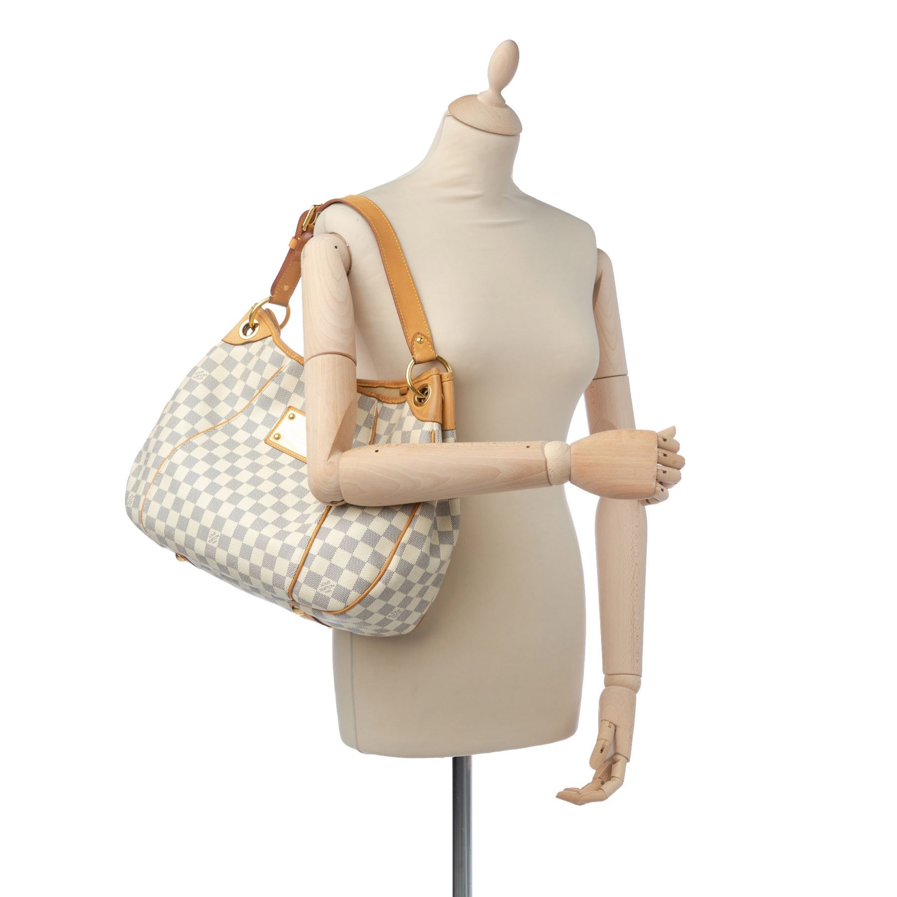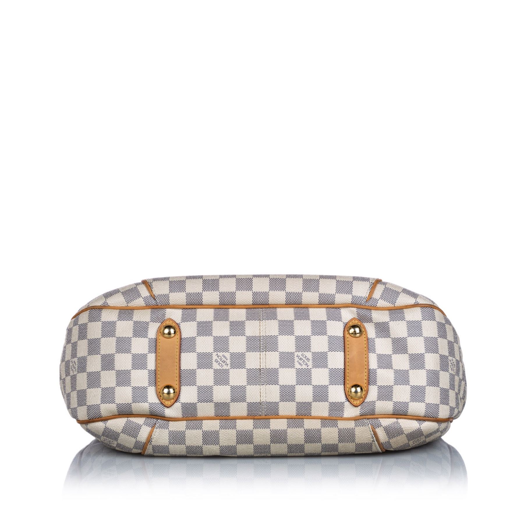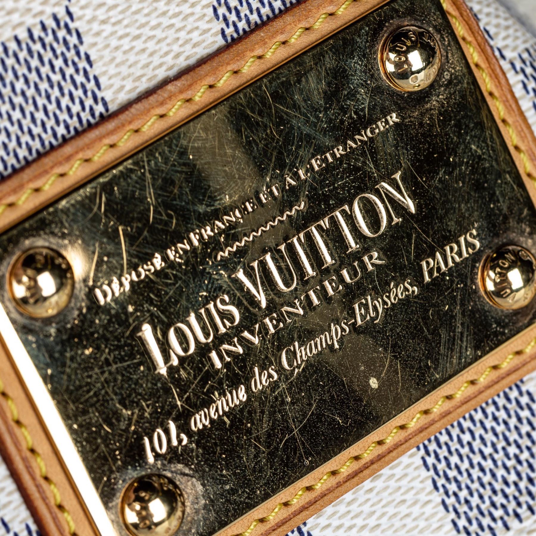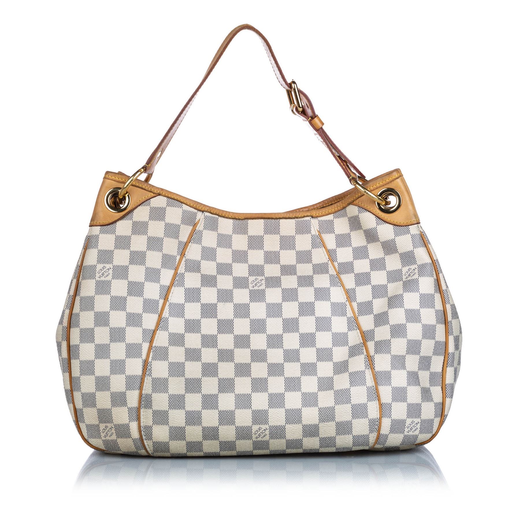 The Galliera PM features a damier azur canvas body with Vachetta leather trim, a flat vachetta strap, an open top with a magnetic closure, and an interior flap pocket. Canvas x Damier Canvas x Leather x Vachetta Leather White x Blue Exterior handle is discolored. Exterior side is discolored, peeling and scratched. Studs is tarnished and scratched. Buckle is tarnished and scratched. Screw is tarnished. Size: 28 x 38 x 11 Card: NO. Louis Vuitton pieces do not come with an authenticity card—please refer to the production date code within the bag for its age and as an authenticity reference. Made in: France