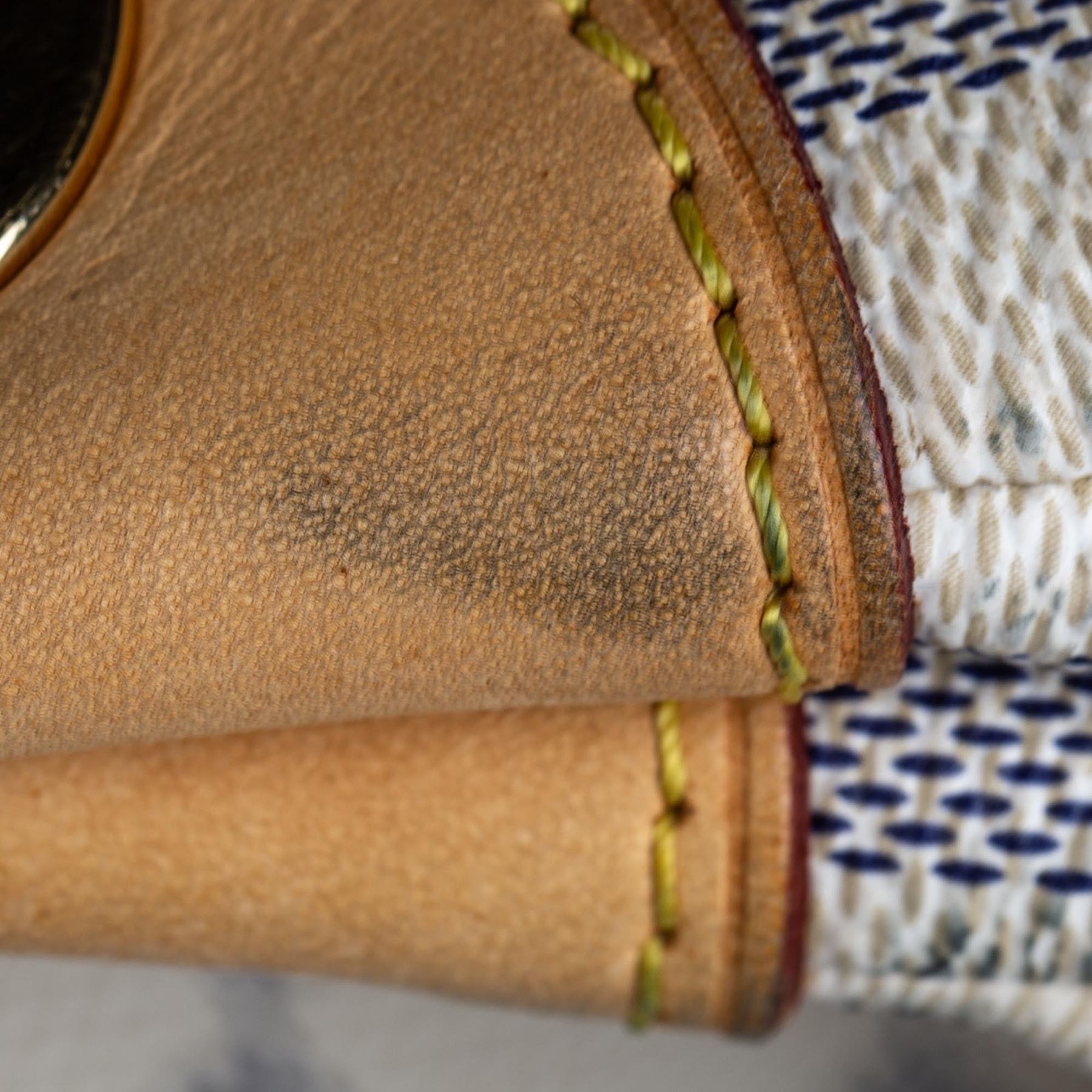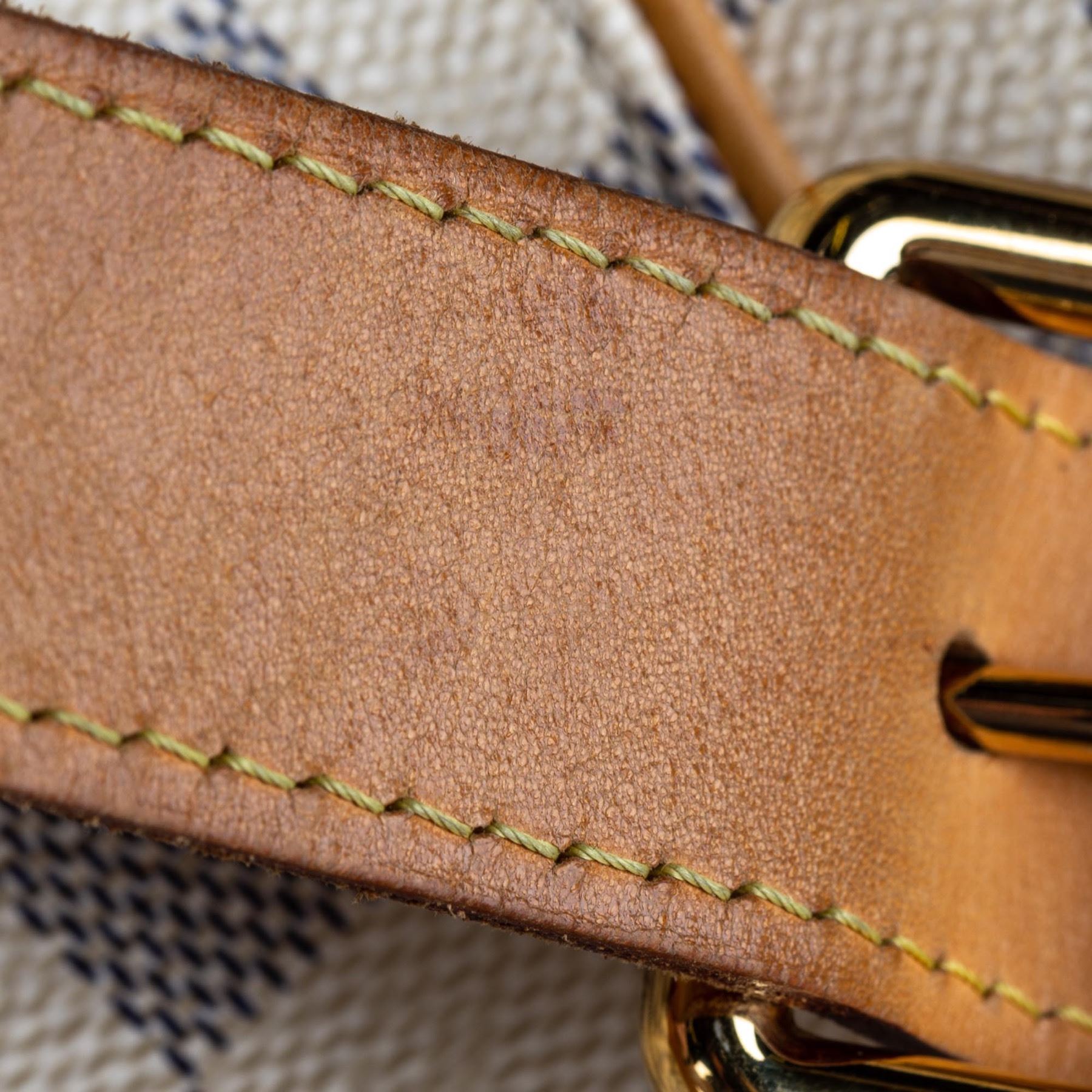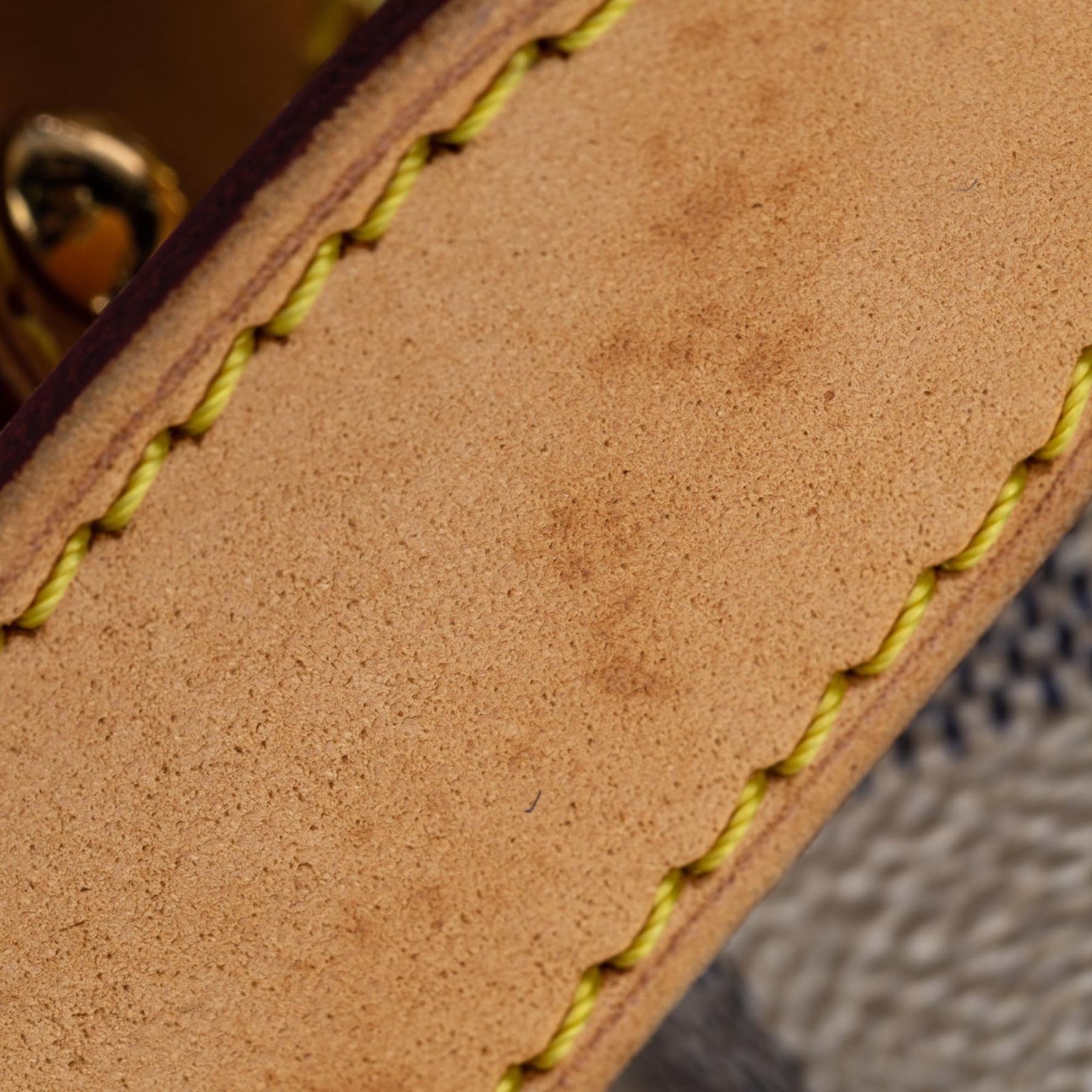The Galliera PM features a damier azur canvas body with Vachetta leather trim, a flat vachetta strap, an open top with a magnetic closure, and an interior flap pocket. Canvas x Damier Canvas x Leather x Vachetta Leather White x Blue Exterior handle is discolored. Exterior side is discolored, peeling and scratched. Studs is tarnished and scratched. Buckle is tarnished and scratched. Screw is tarnished. Size: 28 x 38 x 11 Card: NO. Louis Vuitton pieces do not come with an authenticity card—please refer to the production date code within the bag for its age and as an authenticity reference. Made in: France