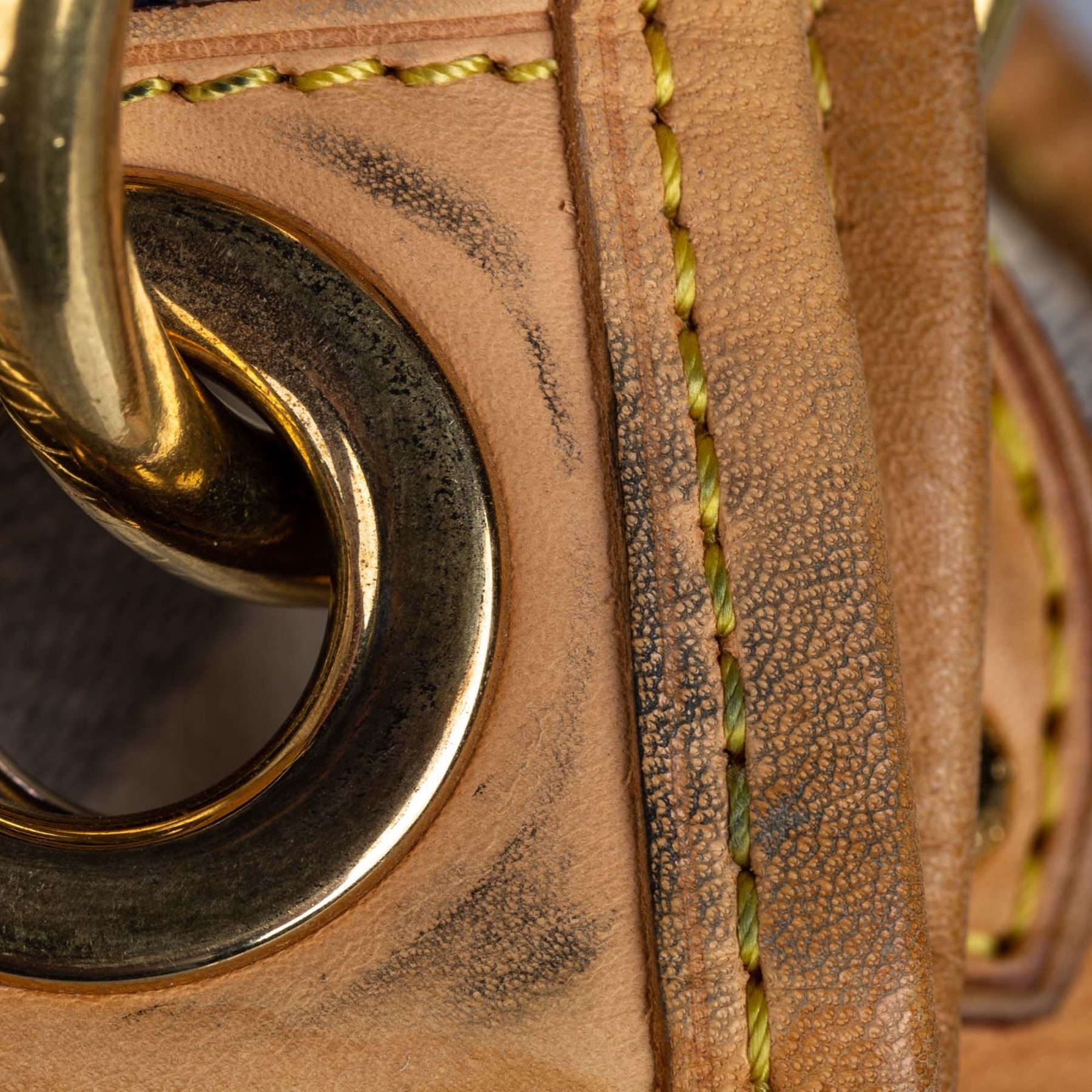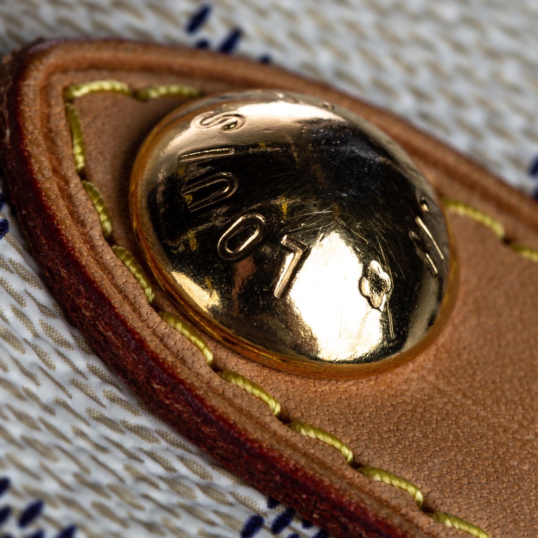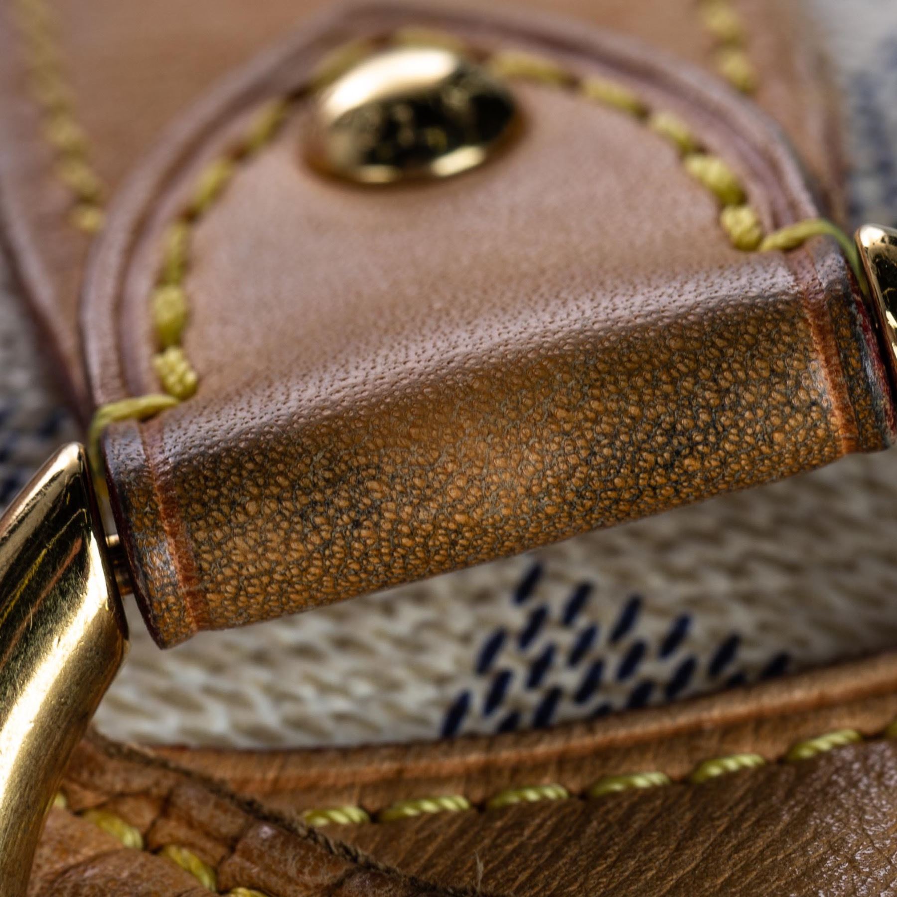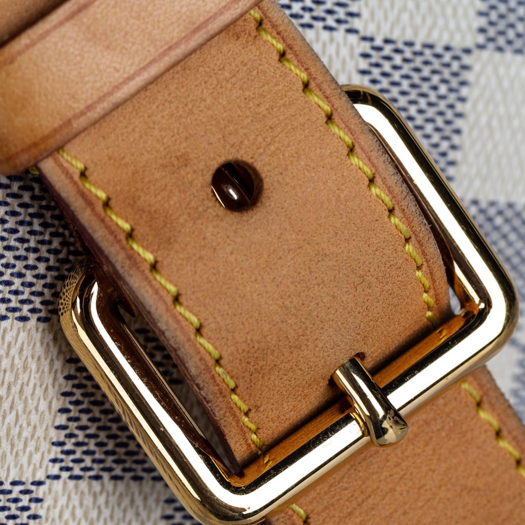 The Galliera PM features a damier azur canvas body with Vachetta leather trim, a flat vachetta strap, an open top with a magnetic closure, and an interior flap pocket. Canvas x Damier Canvas x Leather x Vachetta Leather White x Blue Exterior handle is discolored. Exterior side is discolored, peeling and scratched. Studs is tarnished and scratched. Buckle is tarnished and scratched. Screw is tarnished. Size: 28 x 38 x 11 Card: NO. Louis Vuitton pieces do not come with an authenticity card—please refer to the production date code within the bag for its age and as an authenticity reference. Made in: France