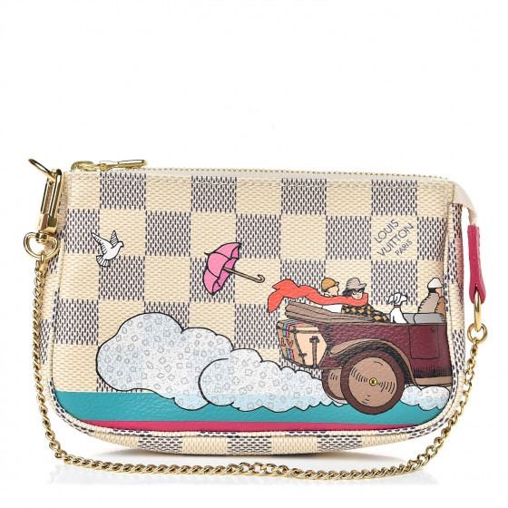 New chic pochette features the playful and colorful design of people riding off in a car, printed on blue and white damier canvas. The bag features a polished brass chain-link wristlet strap, and a matching top zipper that opens to a beige fabric interior.