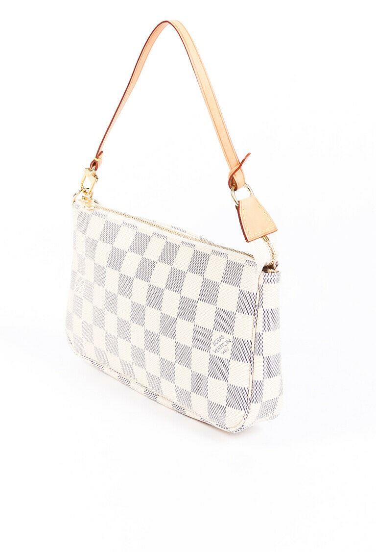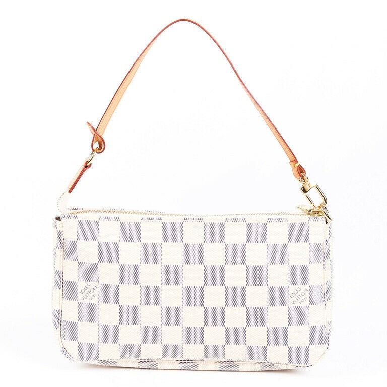 Circa 2011. Louis Vuitton Pochette Accessoires bag is crafted from Damier Azur coated canvas and features gold tone hardware, a leather strap, zip closure, and an unlined interior.