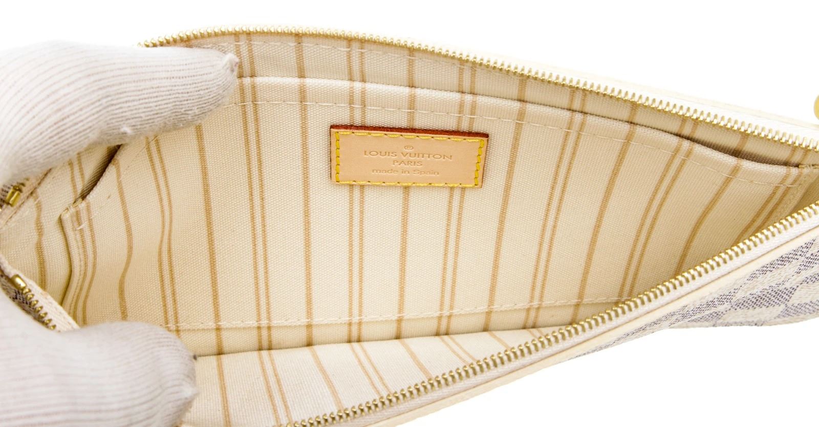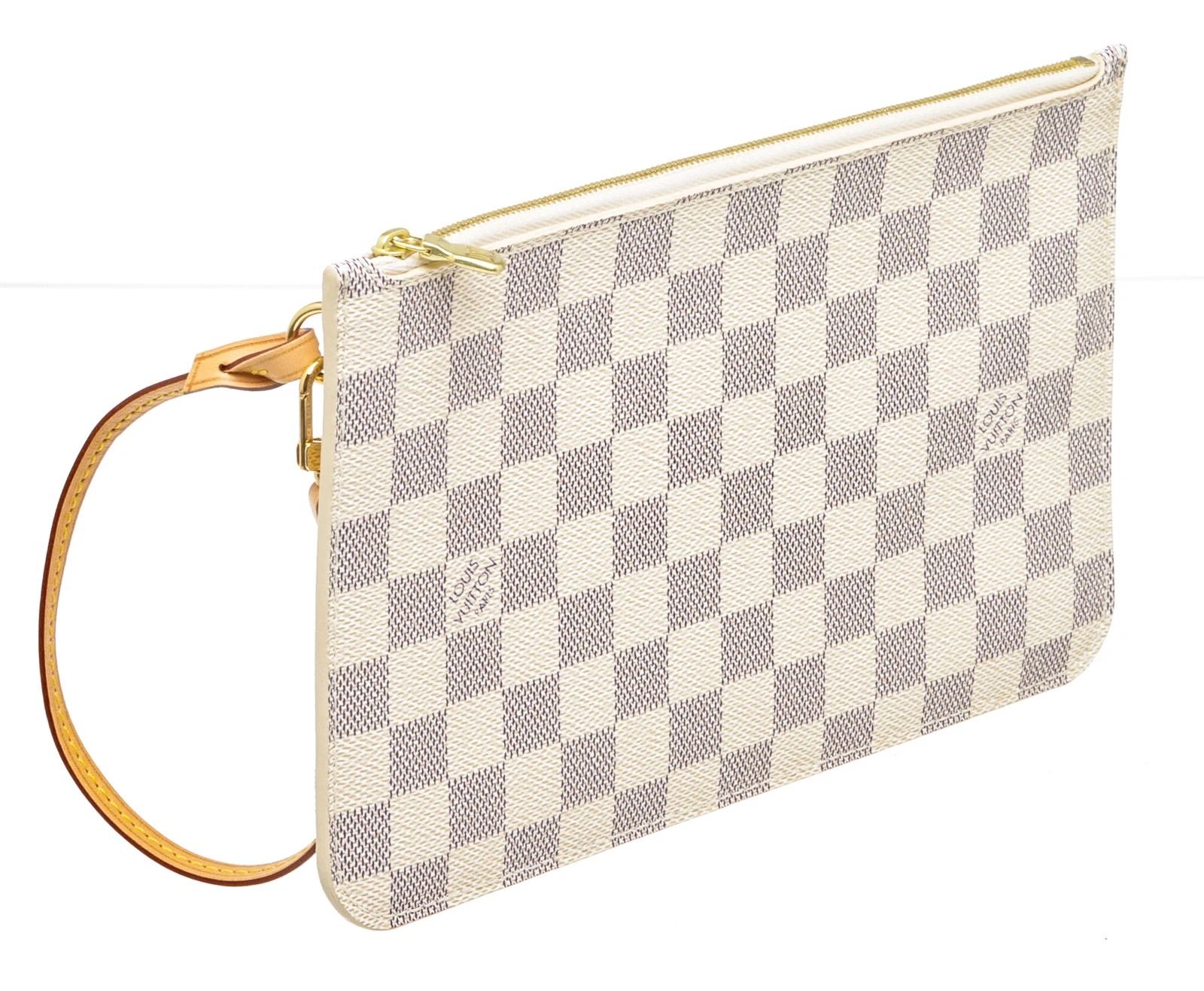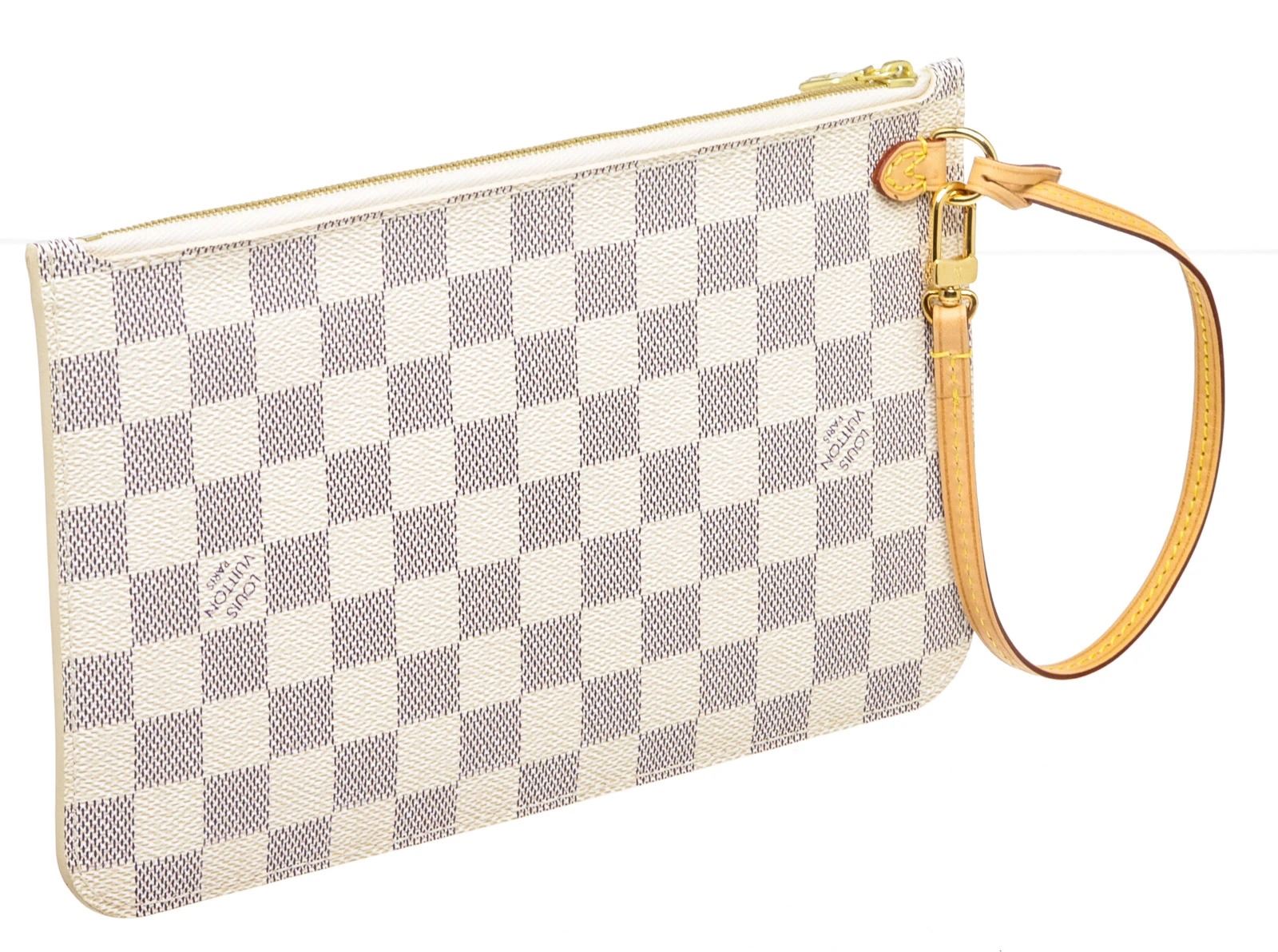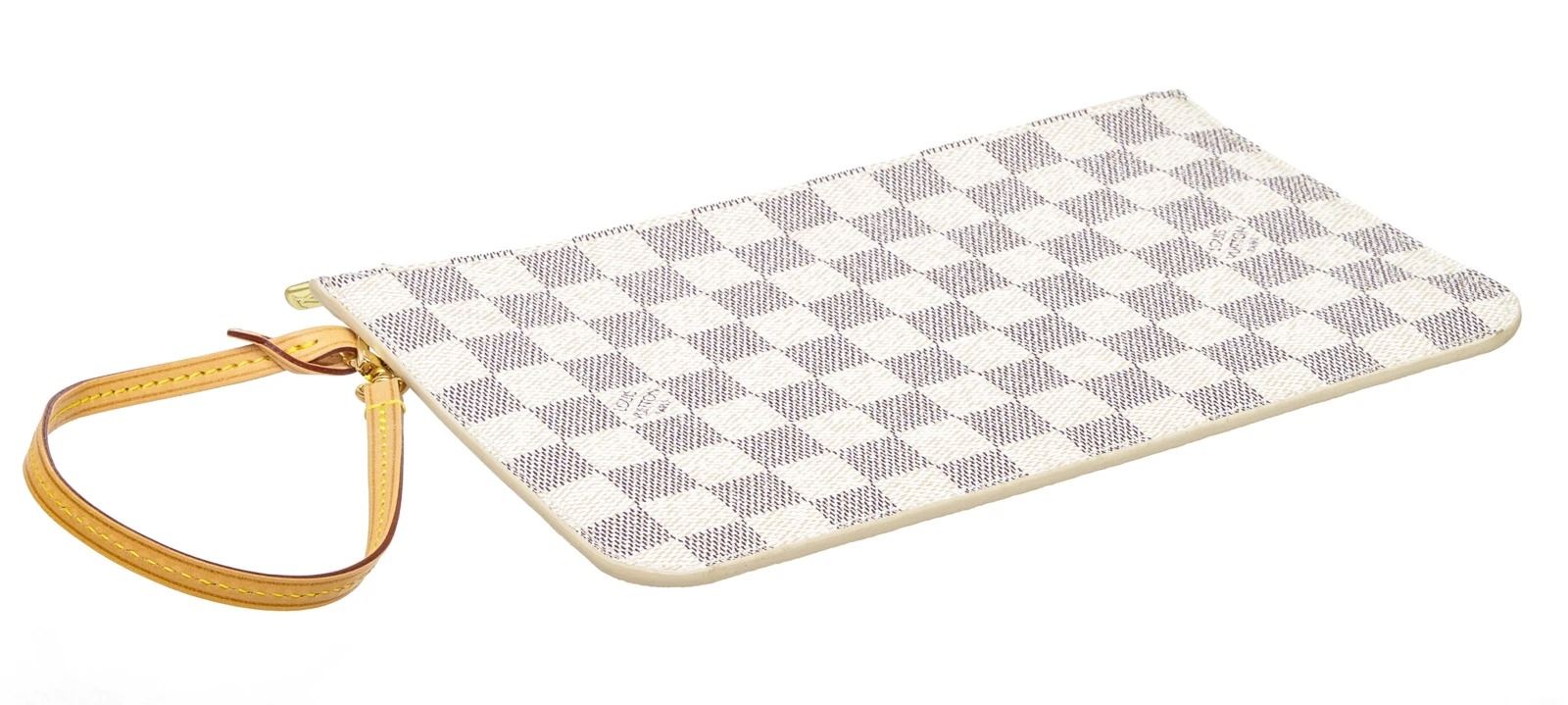 Crafted from Damier Azur coated canvas, the Neverfull pouch features brass hardware, wristlet at the side, and zip top closure which opens to a single wall pocket.