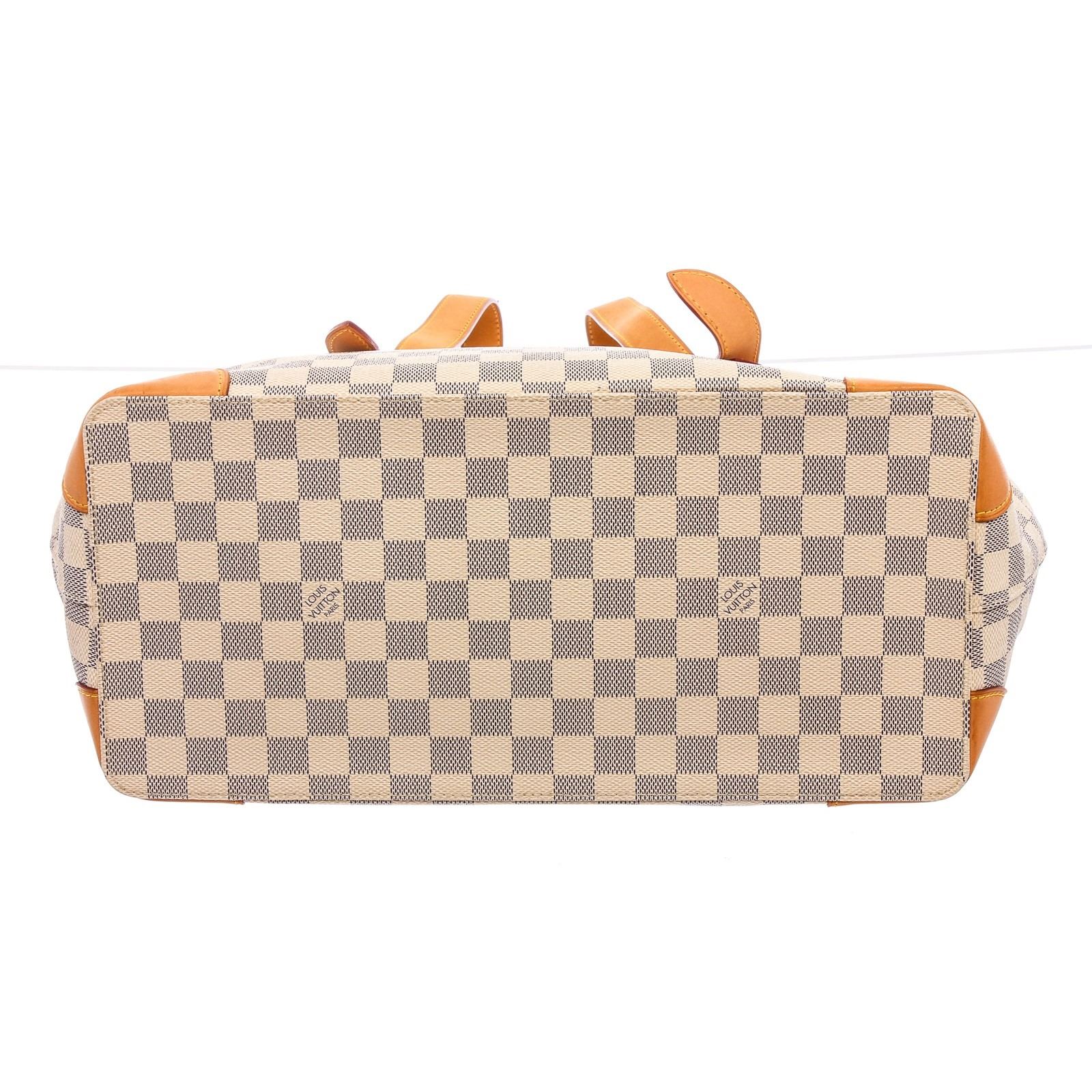 Blue and creme Damier Azur coated canvas Louis Vuitton Hampstead GM with brass hardware, leather trim, dual flat shoulder straps, beige Alcantara lining, three pockets at interior walls; one with zip closure and lobster clasp closure at top.