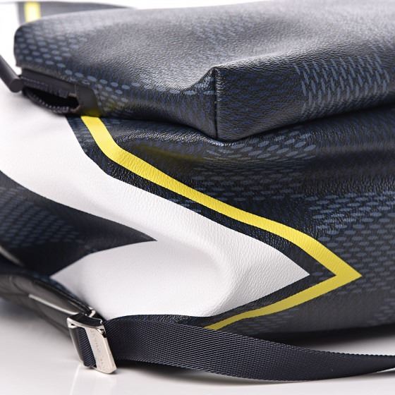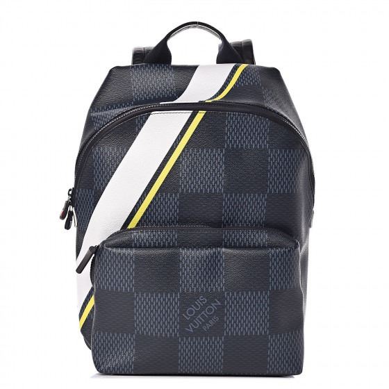 Crafted of the Louis Vuitton monogram canvas in a blue tone damier print with yellow and white stripe overlay. This backpack features adjustable shoulder straps, a top handle, a zip-around top closure, a zip front pocket, and rubber and metal hardware combination. The top zipper opens to a blue nylon fabric interior with patch pockets.