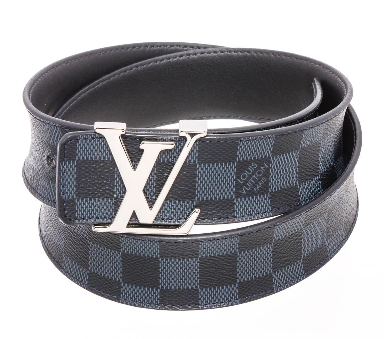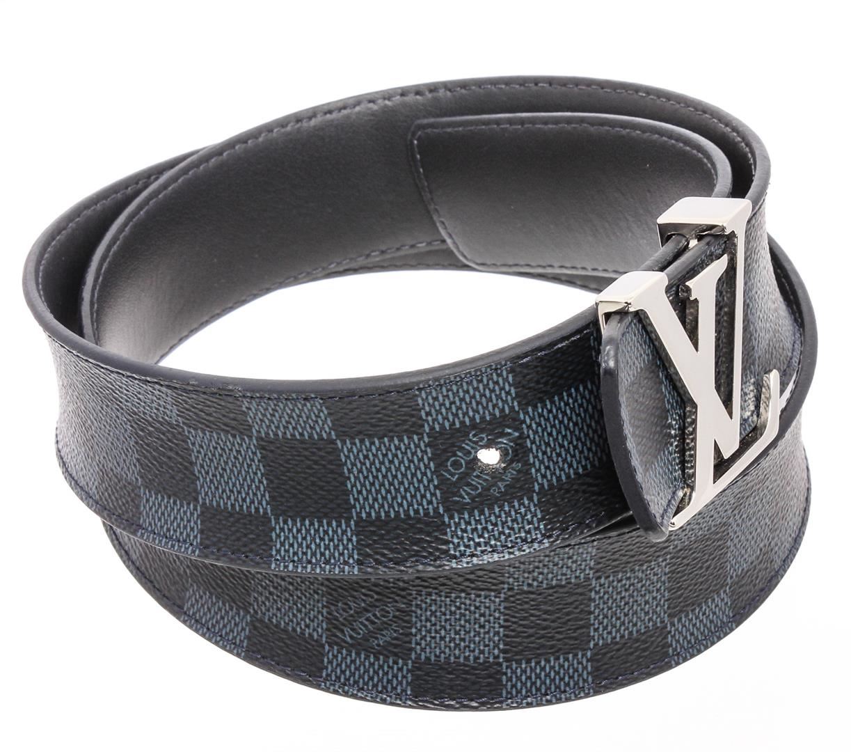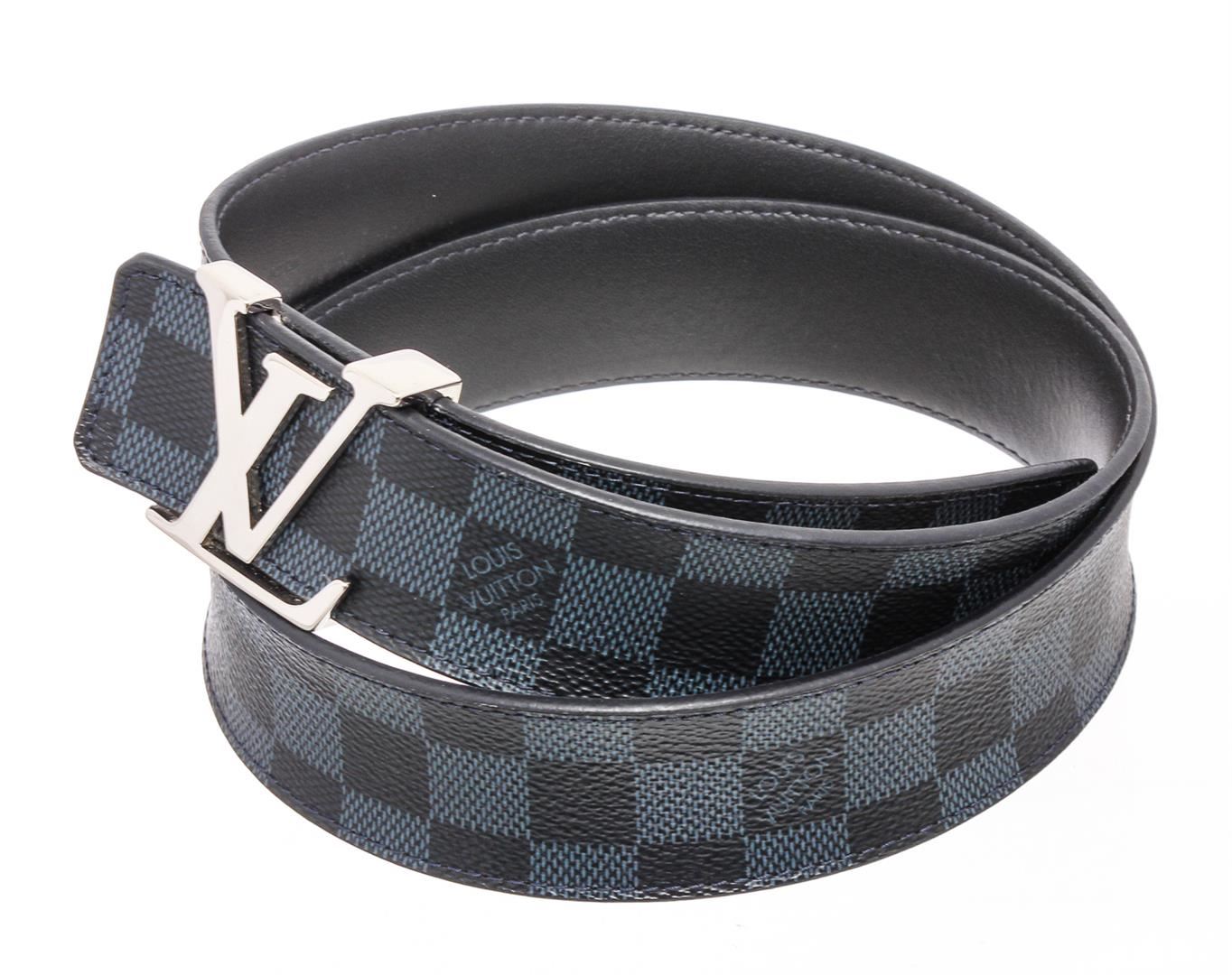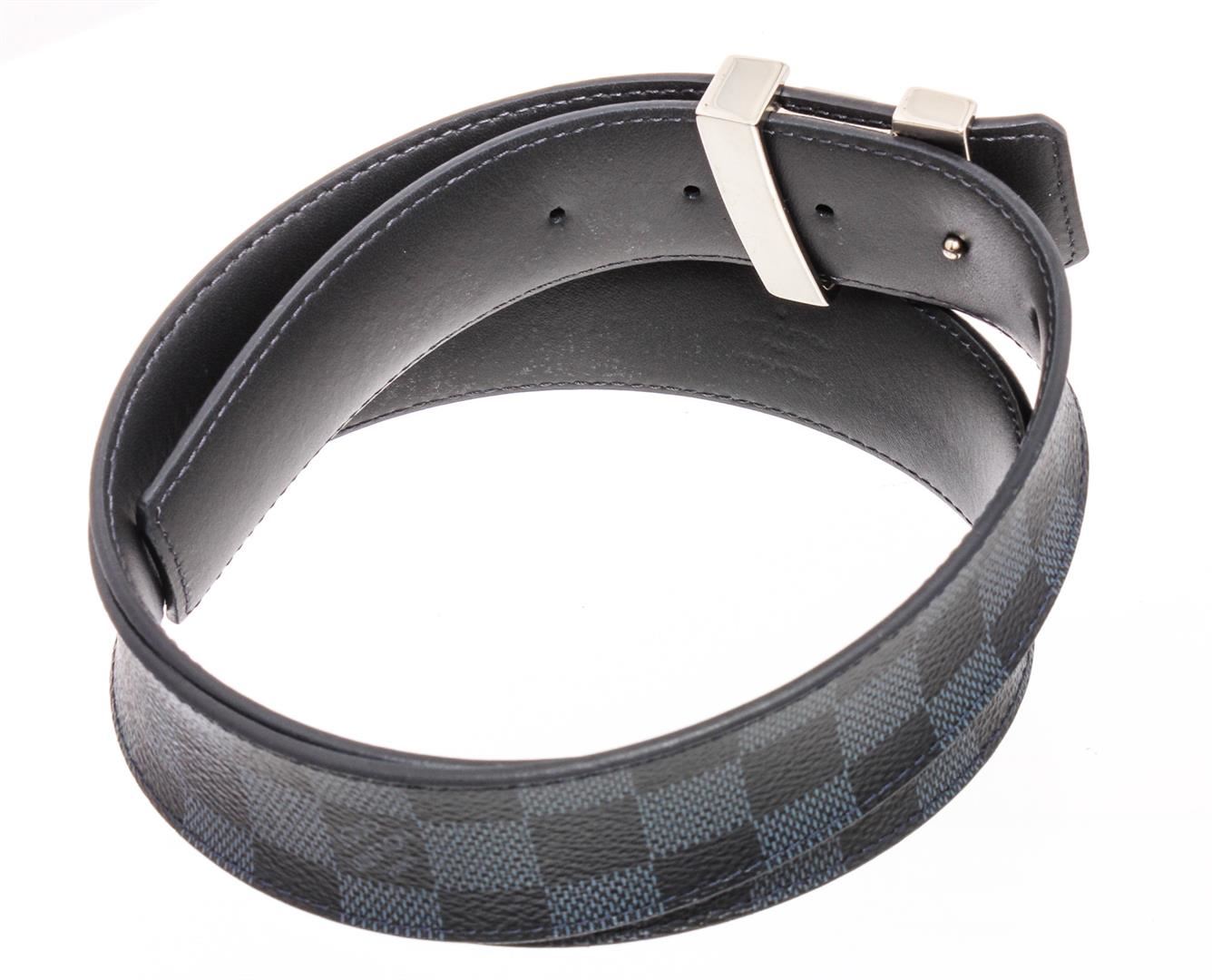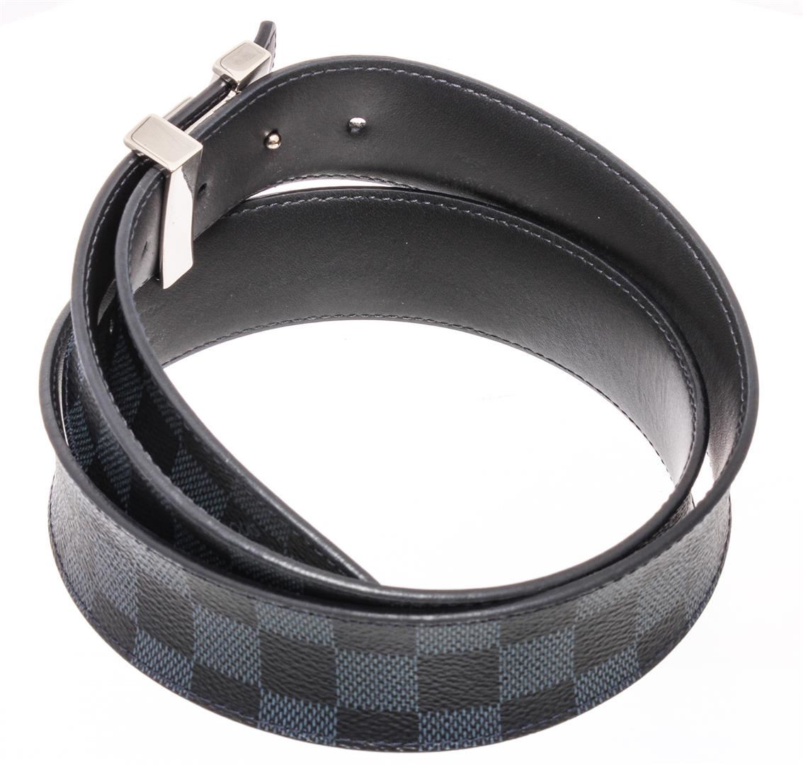 Black and multicolor Louis Vuitton Damier Cobalt Initiales 40MM leather belt with tonal stitching throughout, silver-tone logo adornment and peg-in-hole closure at front. Designer Size 95.