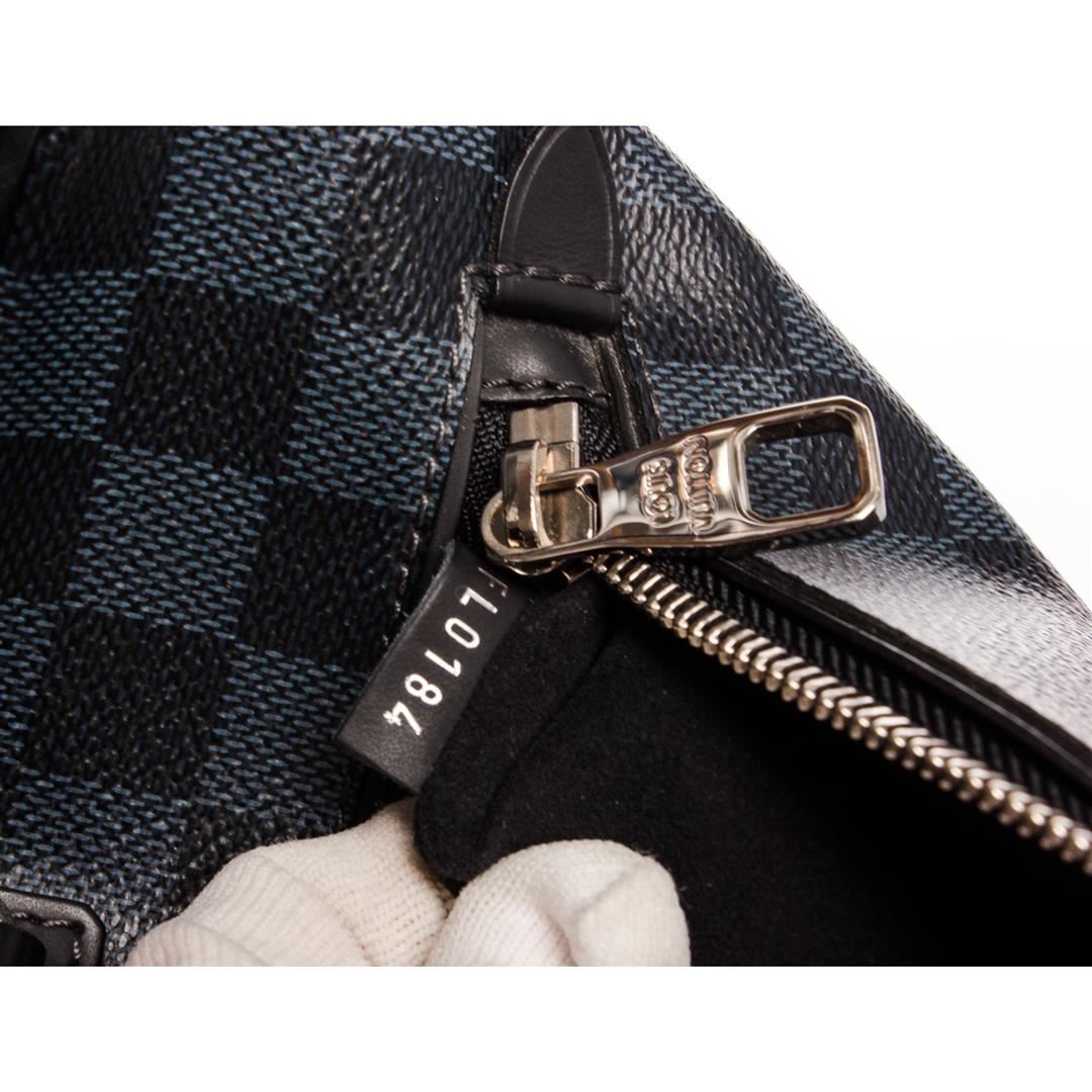 Louis Vuitton dark blue Damier Cobalt coated canvas Porte Document Business bag with black leather trim, silver-tone hardware, black canvas lining, interior zip pocket, four flat, and two pen loops. Exterior zipper pocket, dual rolled top handles, adjustable removable strap, and two-way zip top closure.