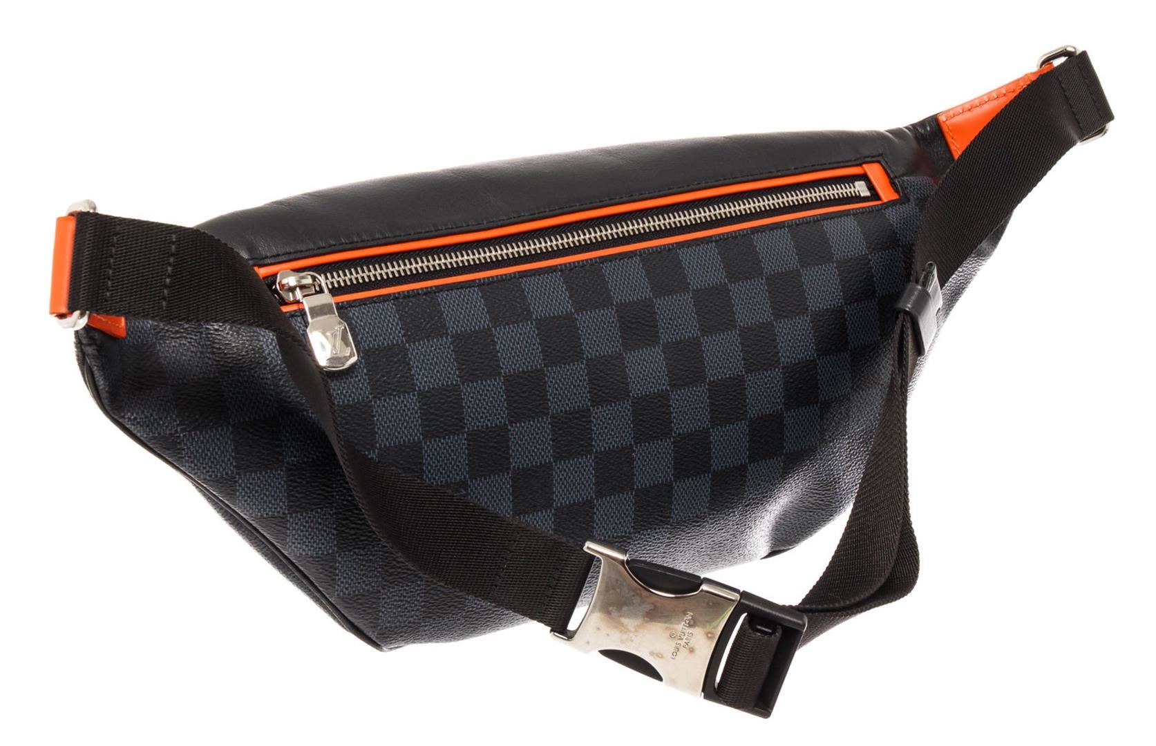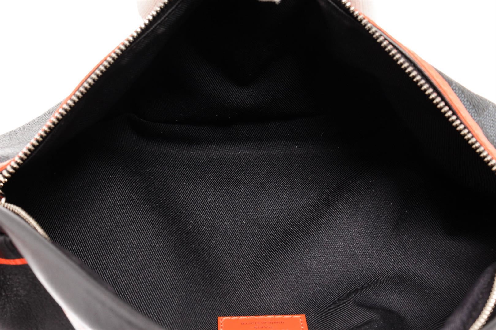 Black and grey printed coated canvas with orange accent of Louis Vuitton Race Discovery bum bag features gunmetal hardware, black leather trim, black canvas adjustable waist strap, single exterior pocket, black canvas lining and zip closure at top. 6