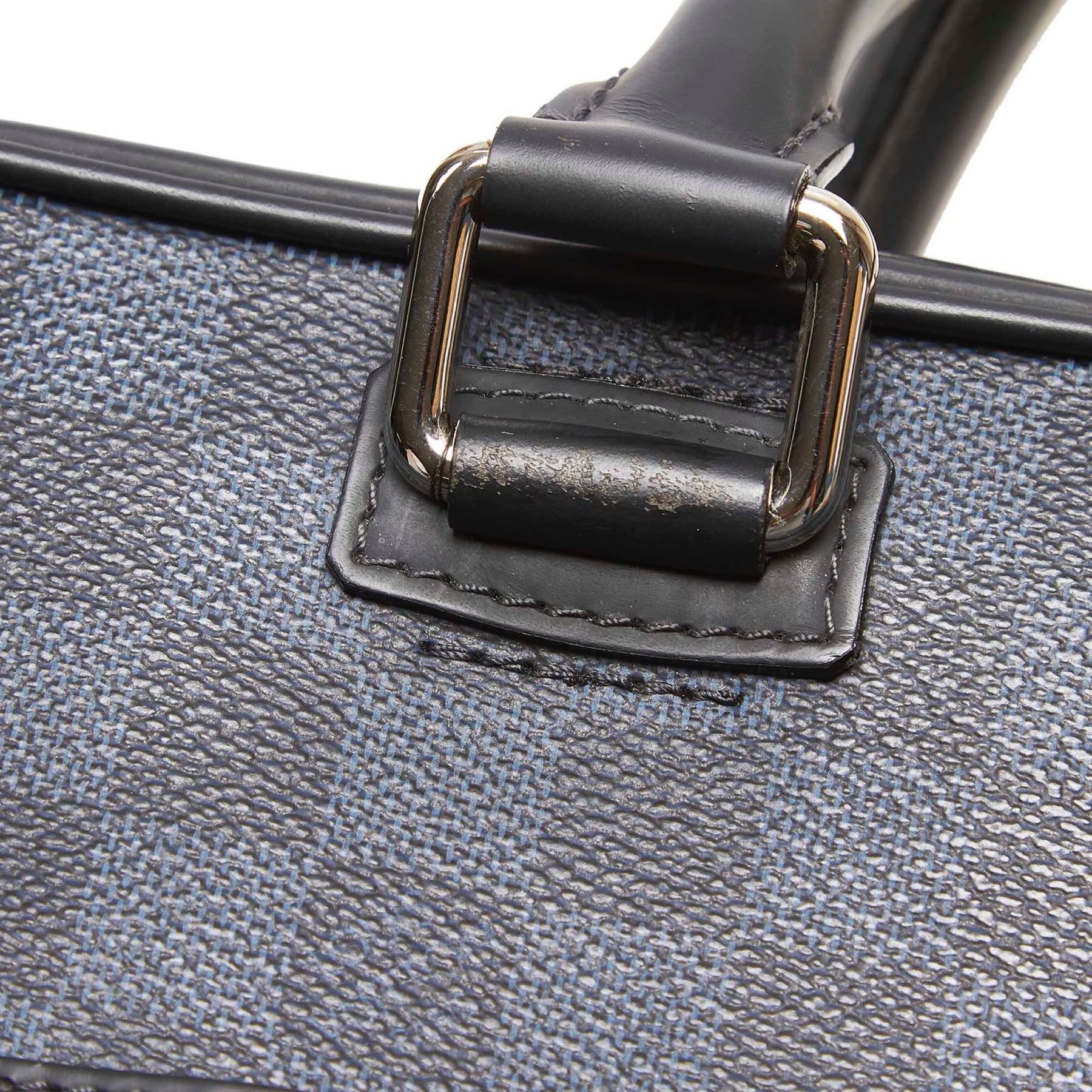 The Porte Document Business features a damier canvas body with leather trim, a front exterior zip pocket, rolled leather handles, a top zip closure, and interior zip and slip pockets. Canvas x Damier Canvas x Leather x Others Black x Gray Exterior front is scratched. Exterior back is scratched. Exterior handle is stained. Exterior pocket is stained. Exterior corners is scratched. Interior lining is stained. Interior pocket is stained. Zipper is scratched. Studs is scratched. Size: 28 x 40 x 8 Card: NO. Louis Vuitton pieces do not come with an authenticity card—please refer to the production date code within the bag for its age and as an authenticity reference. Made in: France