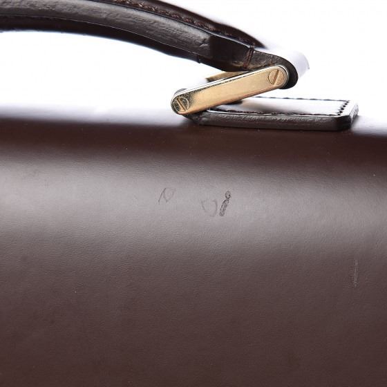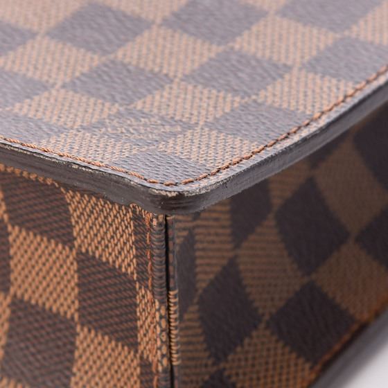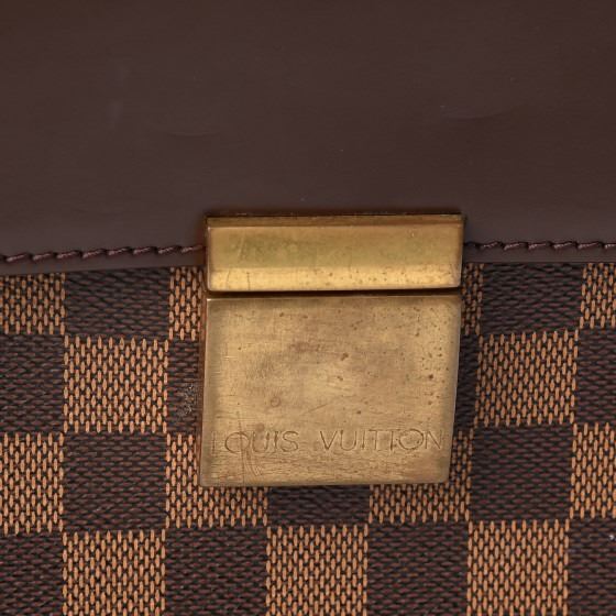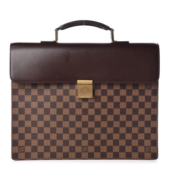 Briefcase is crafted of Louis Vuitton signature damier canvas. There is a reinforced leather top handle with brass links and a cross over flap with a brass press lock. This opens to a spacious cocoa microfiber interior .