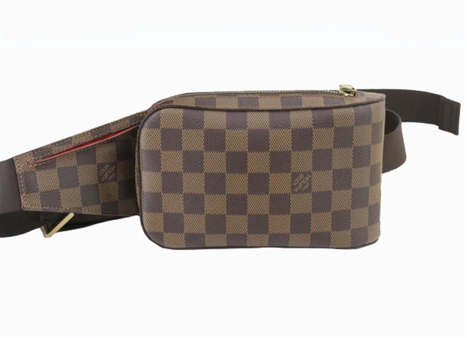 Brown Damier Ebene coated canvas Louis Vuitton Geronimos waist bag with gold-tone hardware, single adjustable waist strap with buckle closure, single pocket at exterior with snap closure, red canvas lining and zip around closure. 7.5"x1.75"x5.75"xBag D