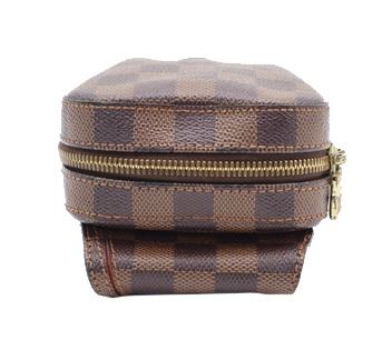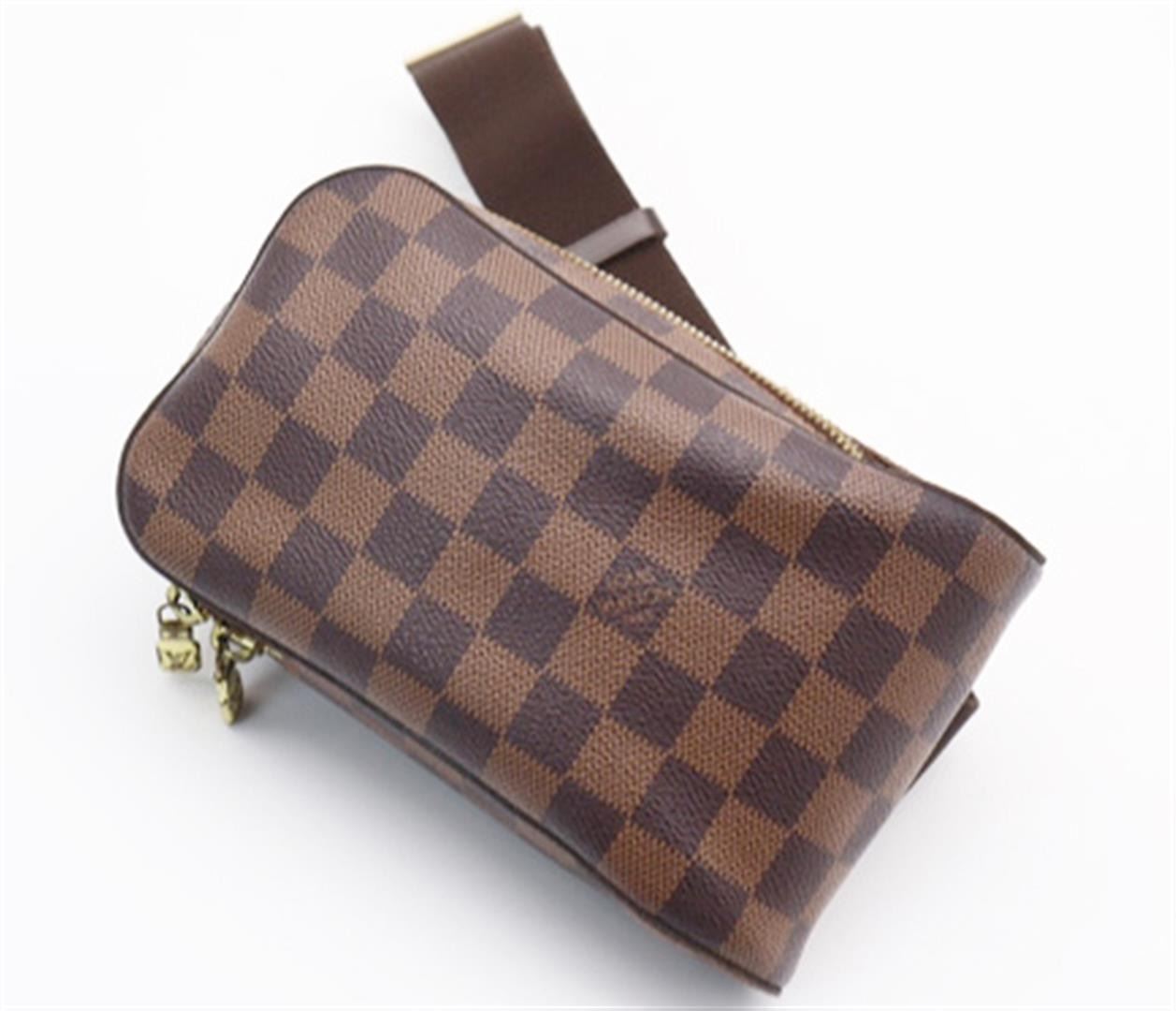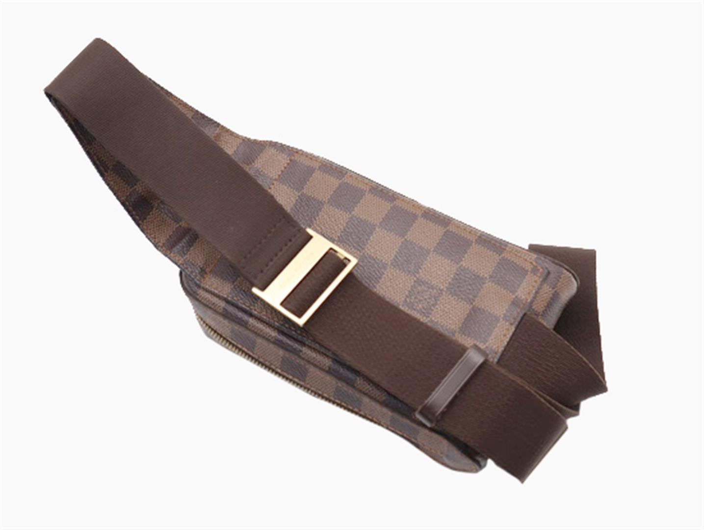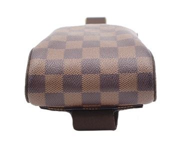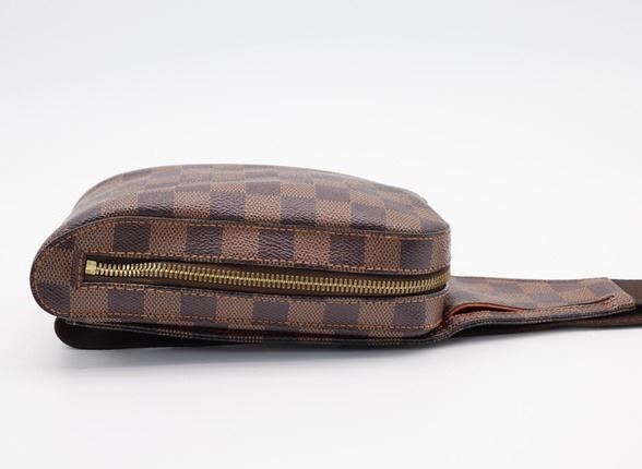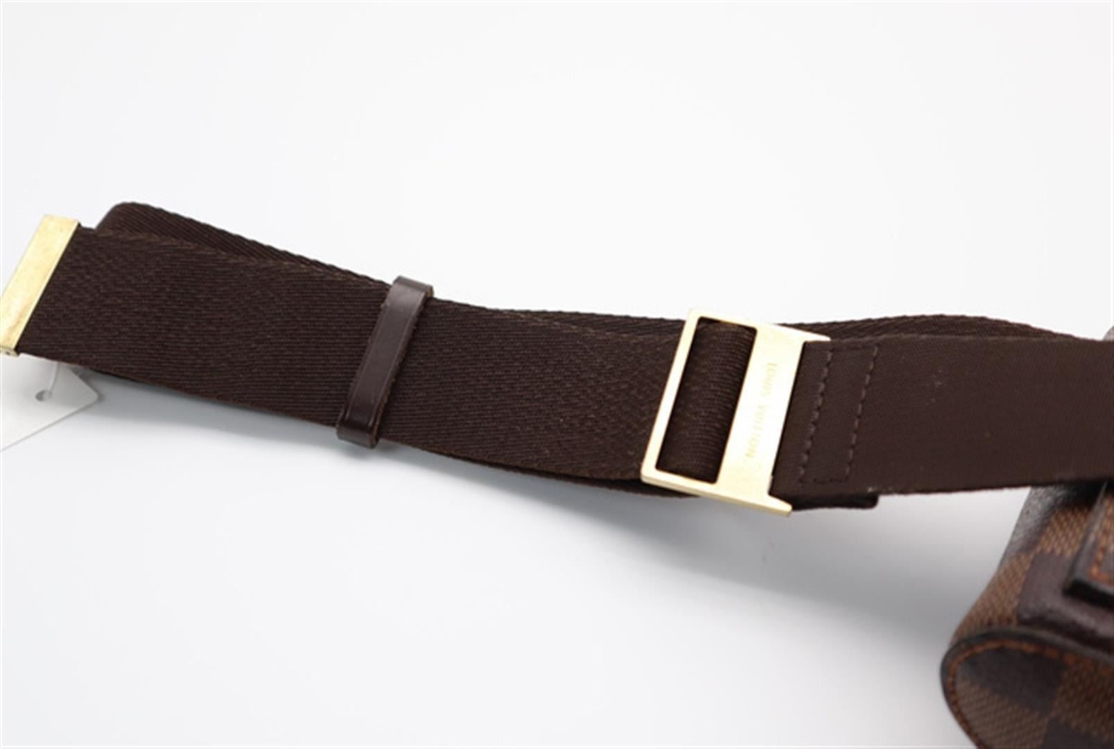 Brown Damier Ebene coated canvas Louis Vuitton Geronimos waist bag with gold-tone hardware, single adjustable waist strap with buckle closure, single pocket at exterior with snap closure, red canvas lining and zip around closure. 7.5"x1.75"x5.75"xBag D