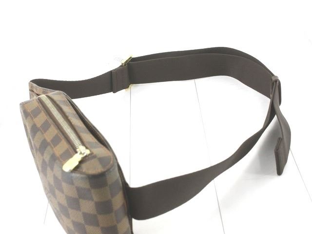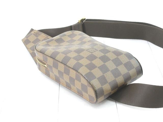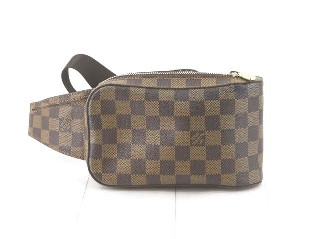 One Louis Vuitton Damier Ebene Canvas Geronimos Waist Bag. Item is sold AS-IS. All available information is listed in the description and shown in the photo. Brown Damier Ebene coated canvas Louis Vuitton Geronimos waist bag with brass hardware, single adjustable waist strap with buckle closure, single pocket at exterior with snap closure, brown canvas lining and zip around closure..